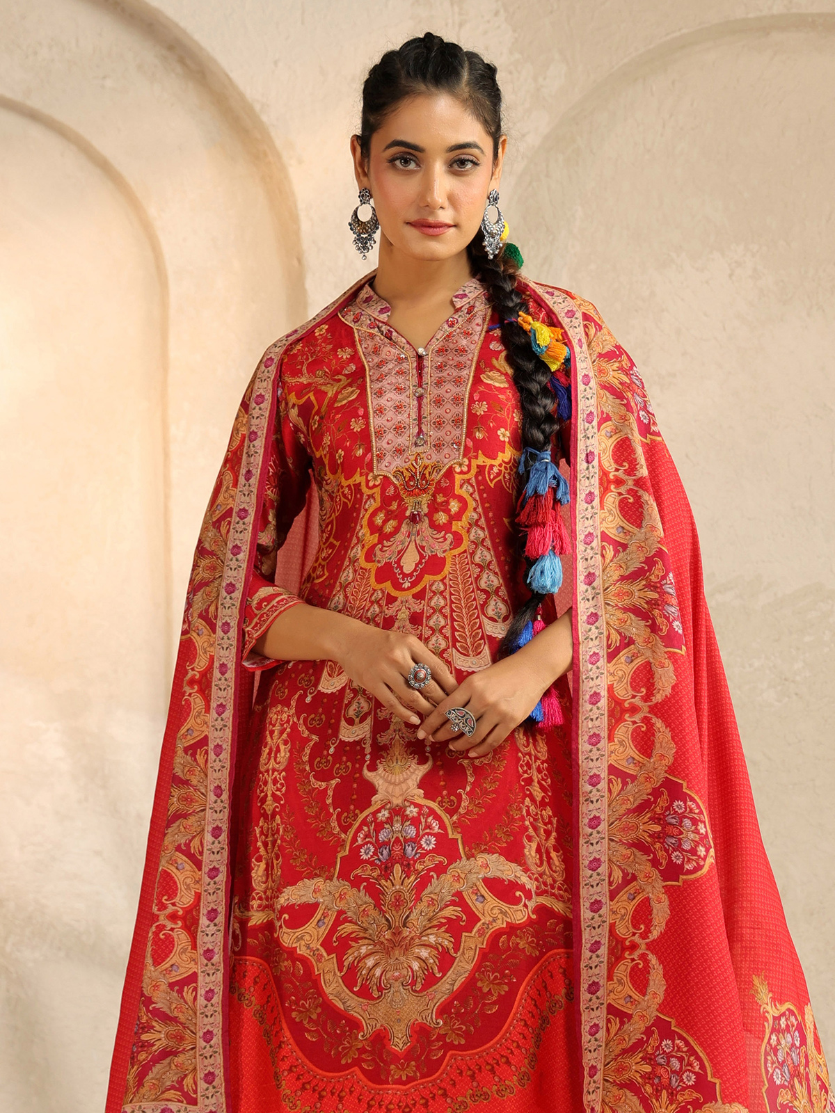 A red silk printed salwar suit enriched with sequins, thread, and beads. Featuring a classic stand neckline and quarter sleeves, styled with pant and printed dupatta, it offers a striking festive ensemble that radiates both tradition and vibrancy.