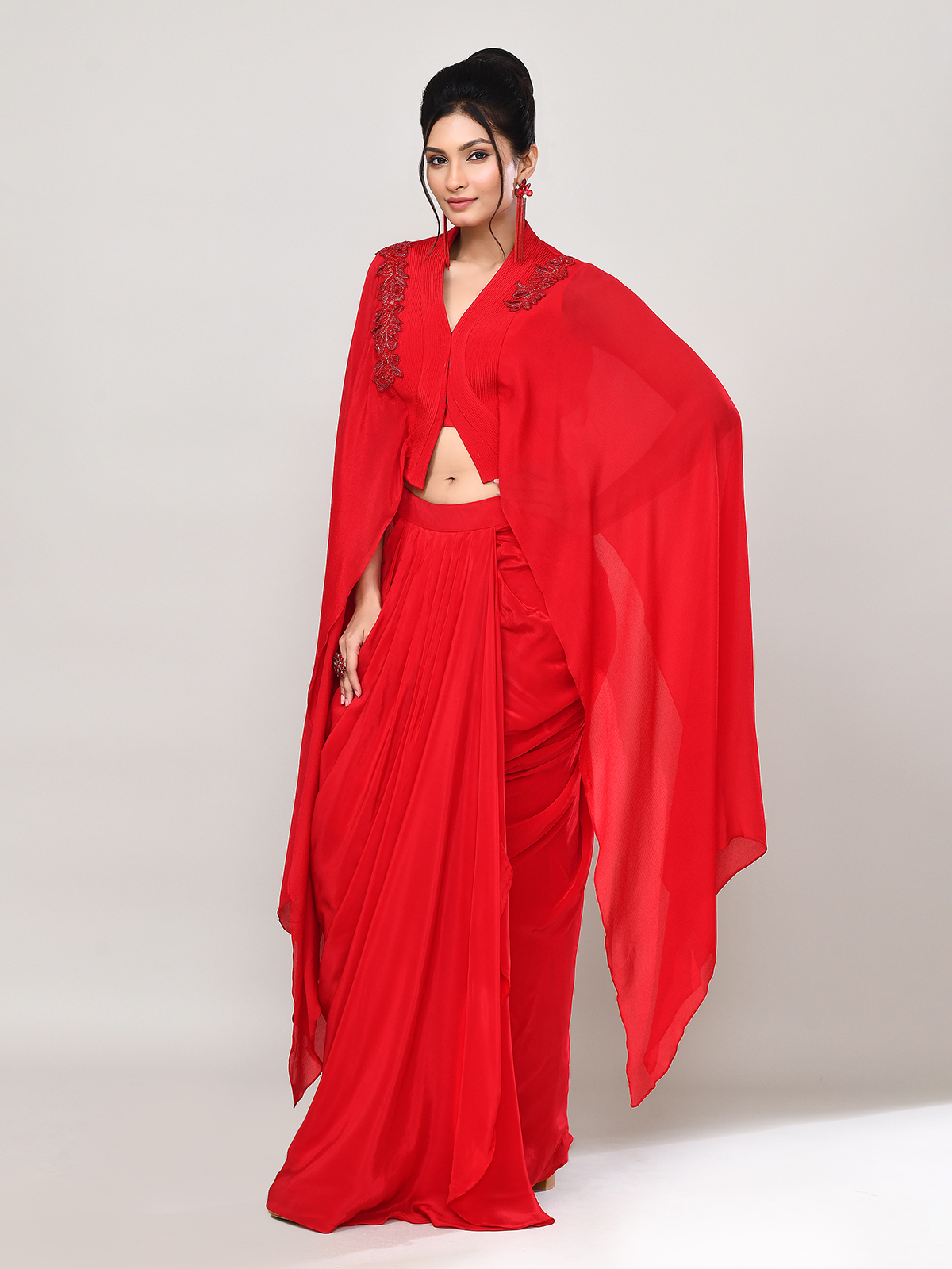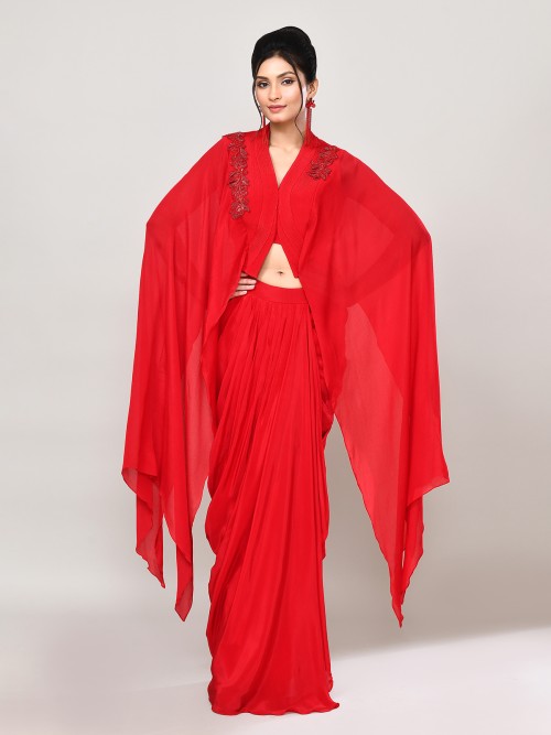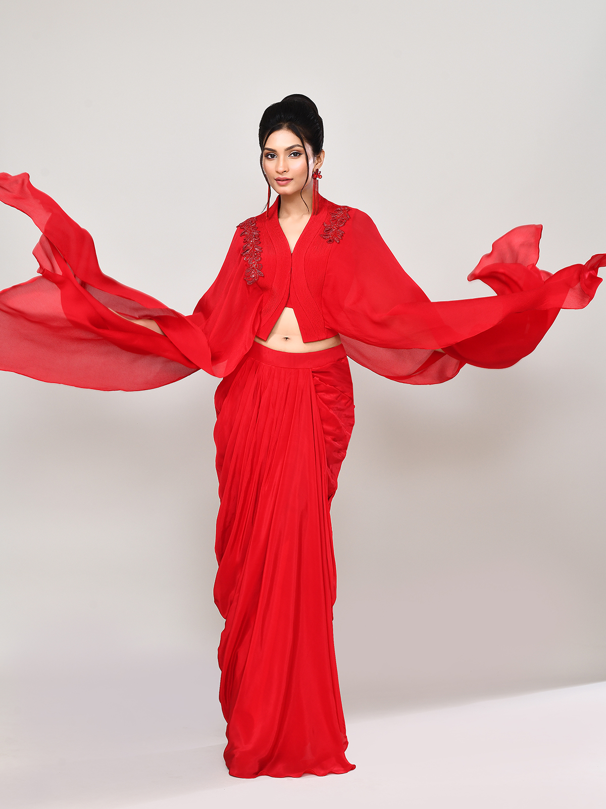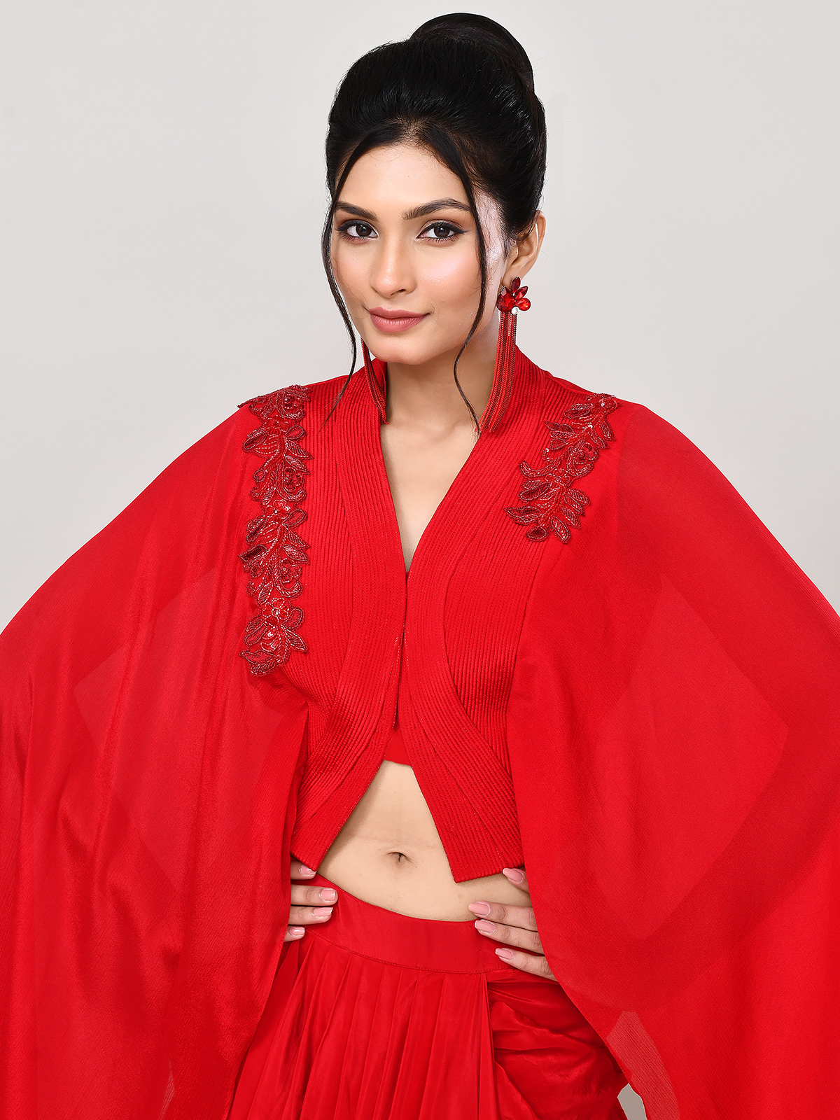 Glow in grandeur with this red satin Indo-western suit, adorned with cutdana, sequins, and beads. Featuring a V-neckline, it reflects modern charm with festive brilliance. Perfect for receptions and parties, this designer piece strikes a fine balance of elegance and glamour, ensuring you turn heads with a radiant and contemporary appeal.