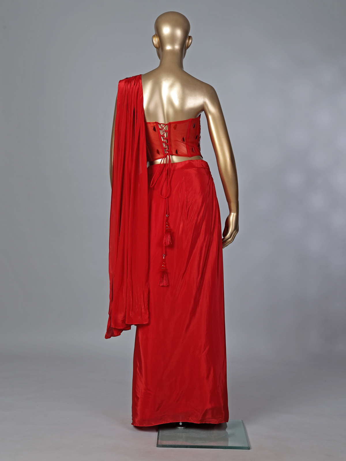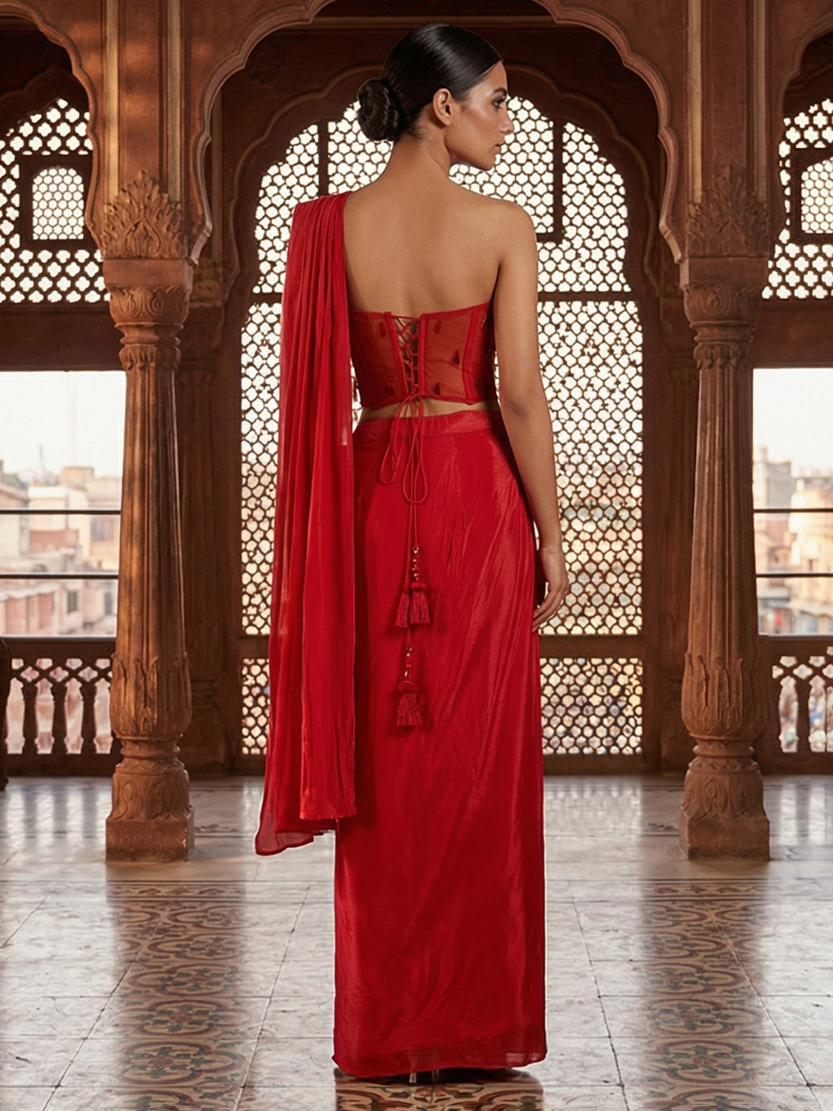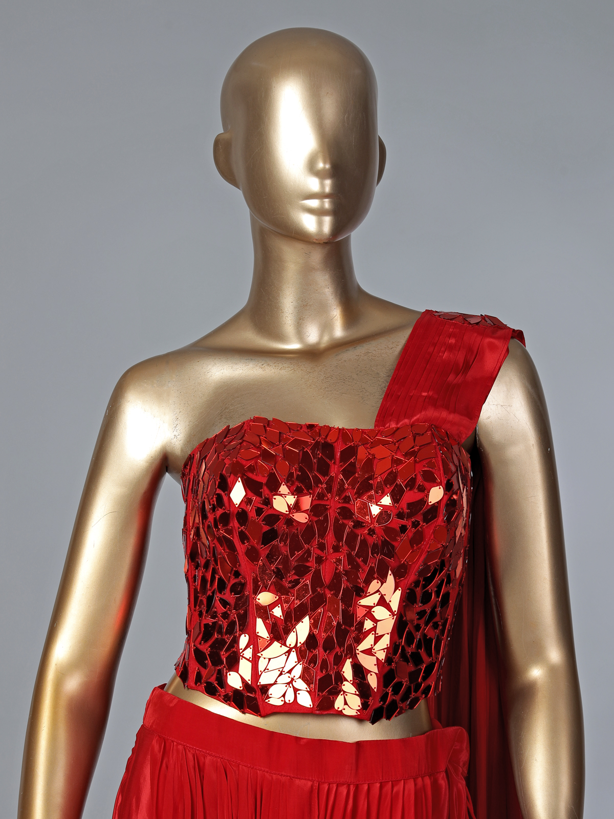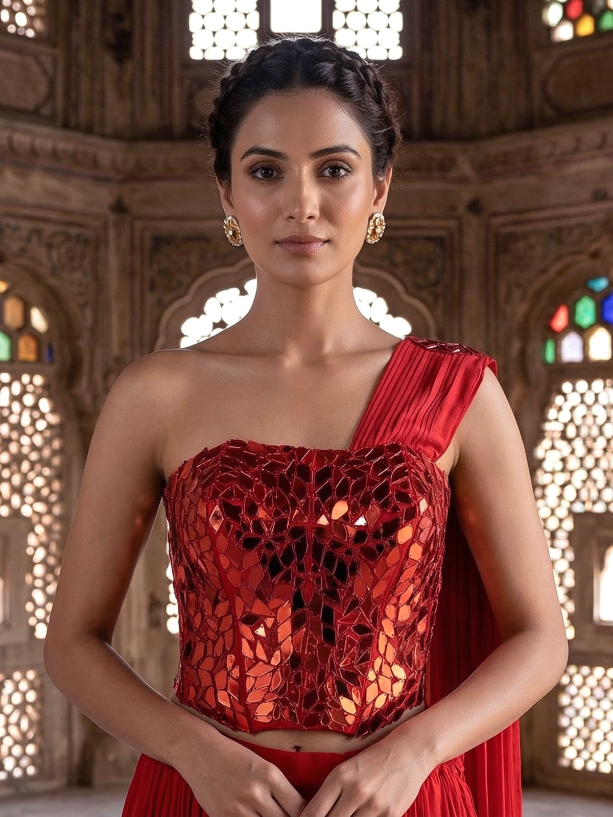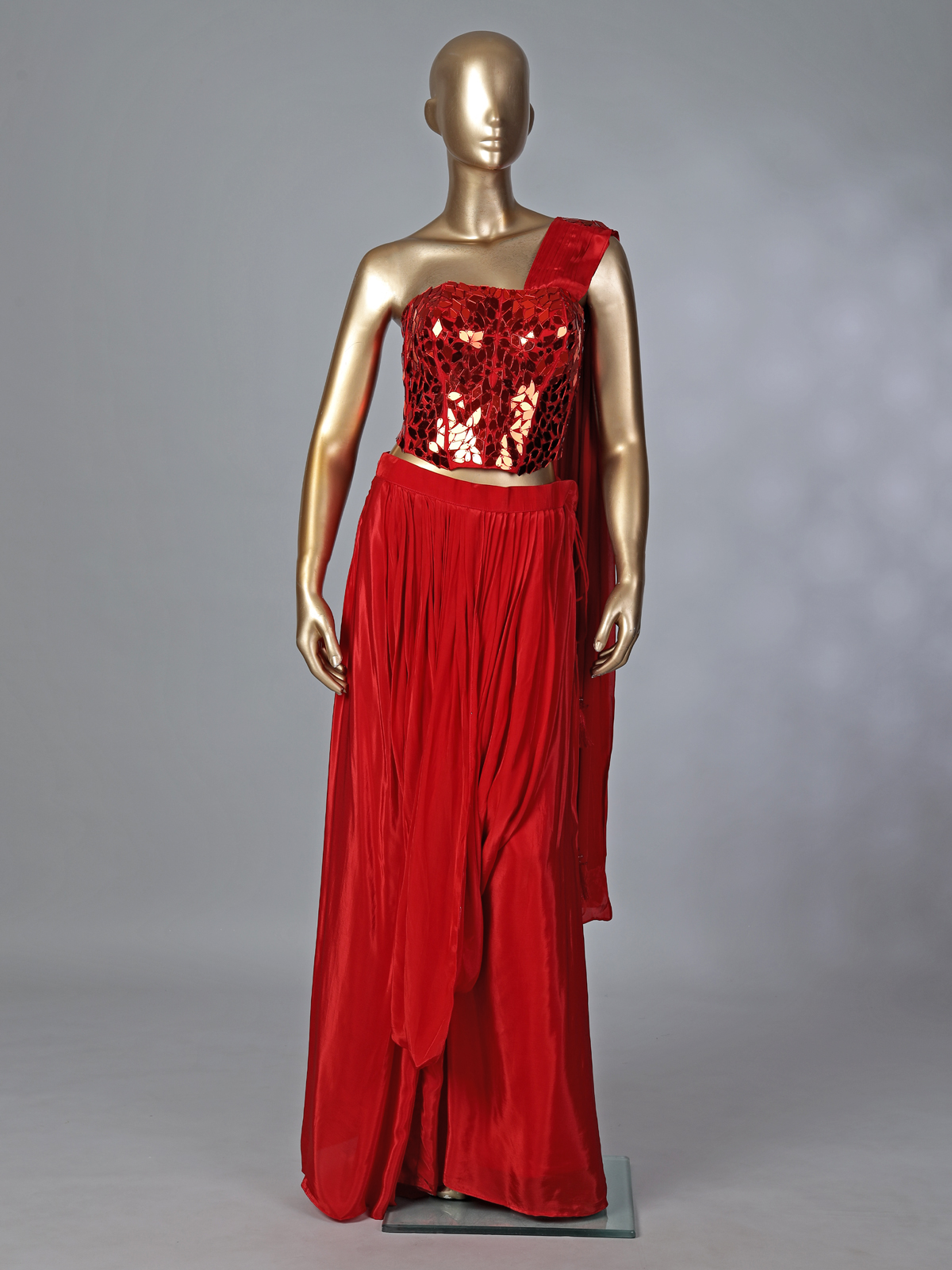 Radiant red satin silk brings bold festive glamour to this designer suit, enhanced with sparkling mirror embellishments that create a luminous effect. Featuring an attached dupatta that drapes effortlessly, this ensemble is perfect for weddings, receptions and celebratory evenings.