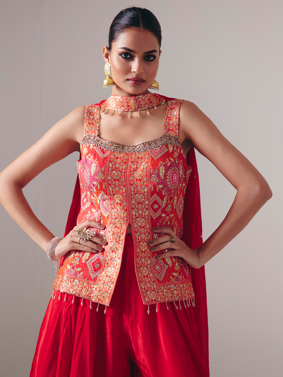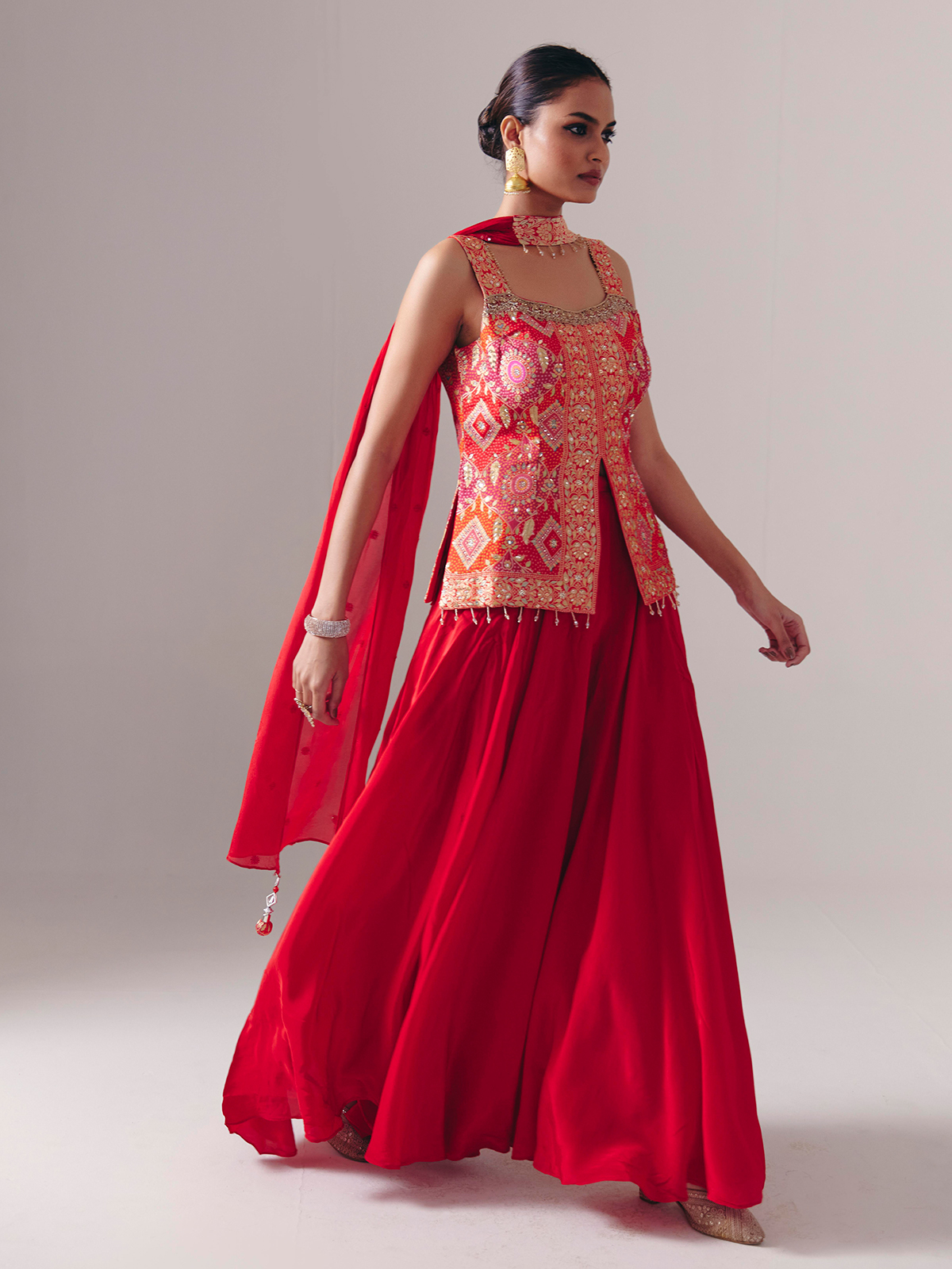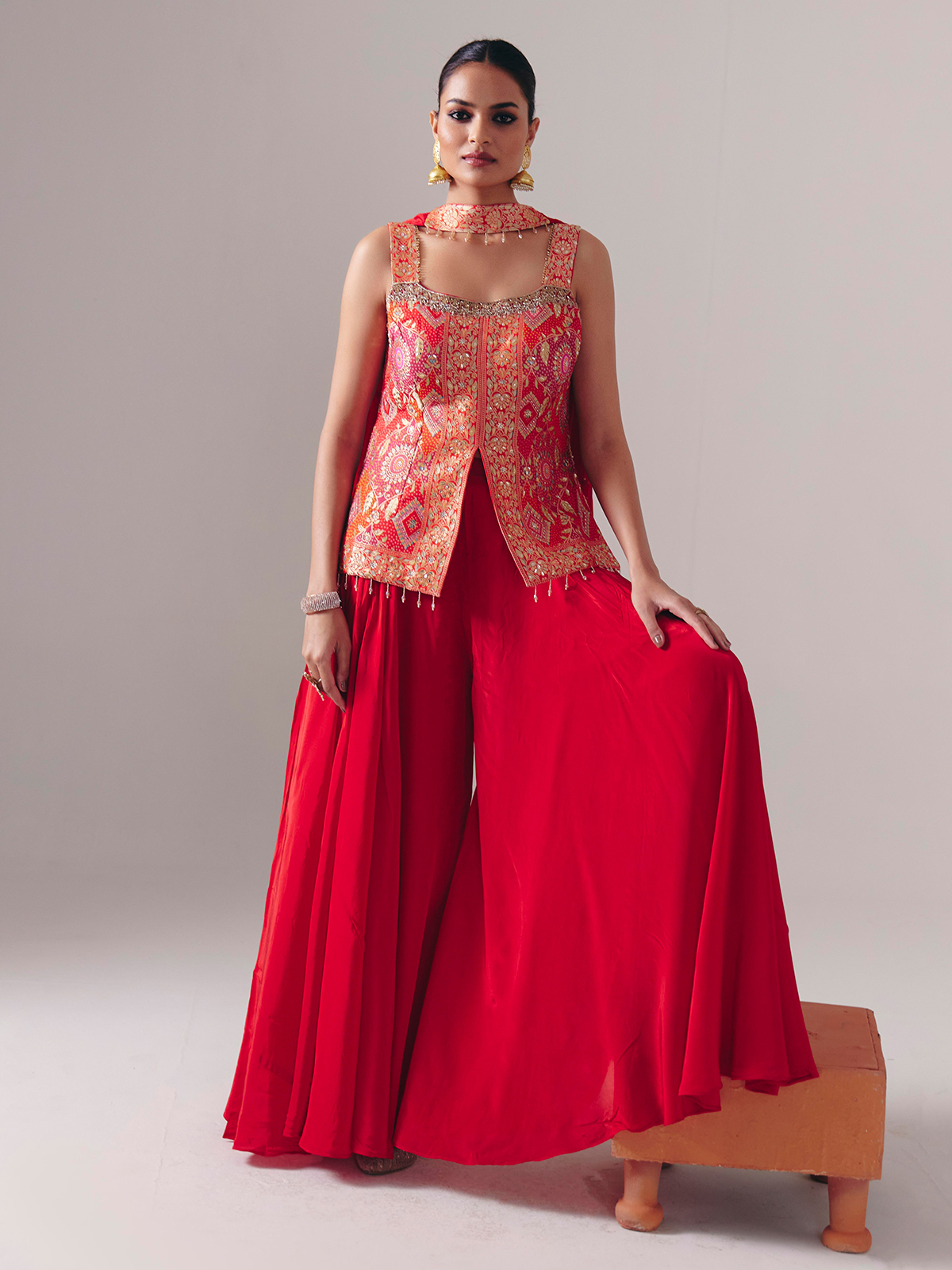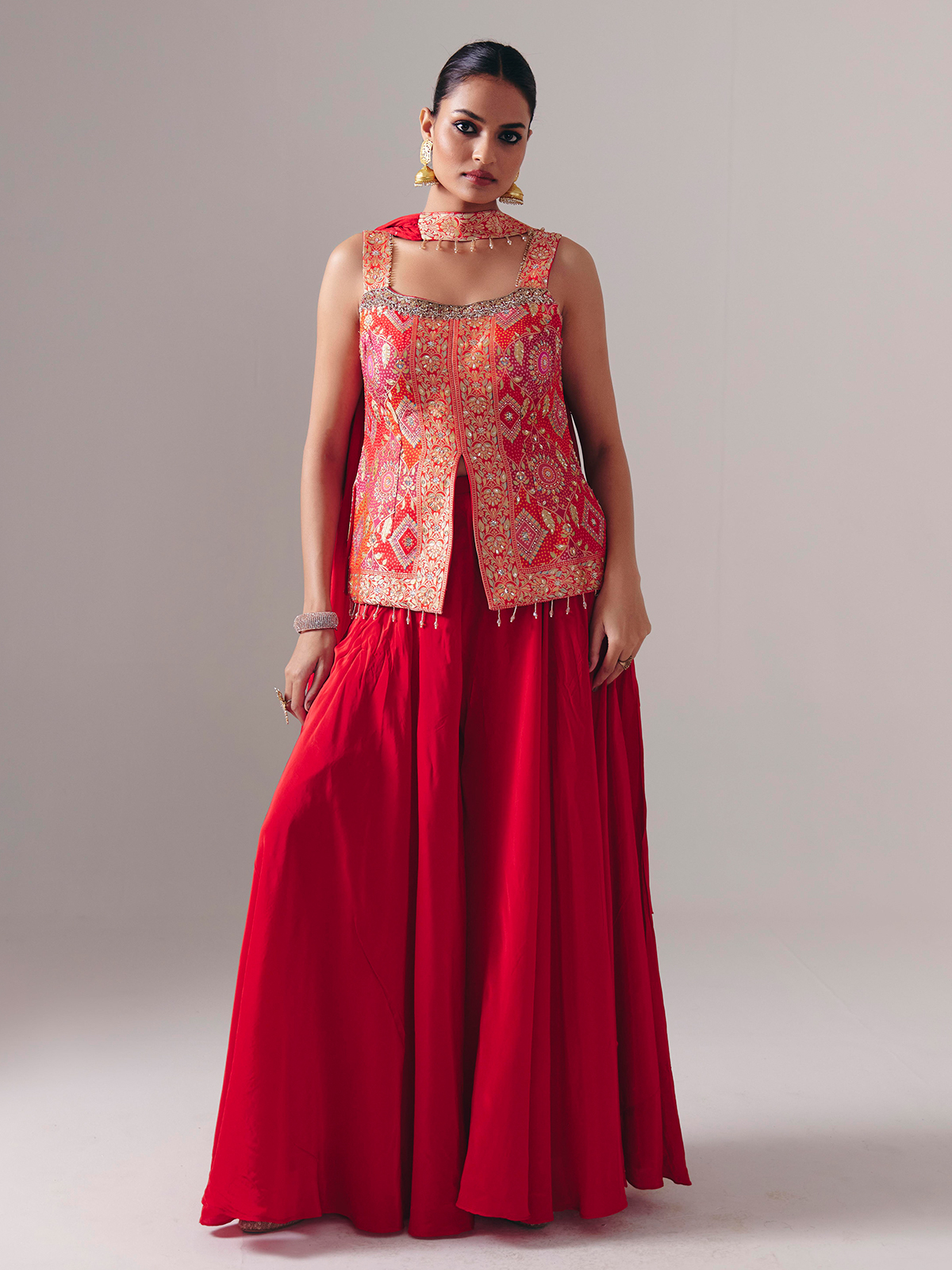 This red satin silk palazzo suit dazzles with stone, sequins, zari, mirror, beads, and zardosi embellishments. Designed sleeveless with a square neckline and finished with a dupatta, it is ideal for weddings and festive events, exuding bold traditional allure.