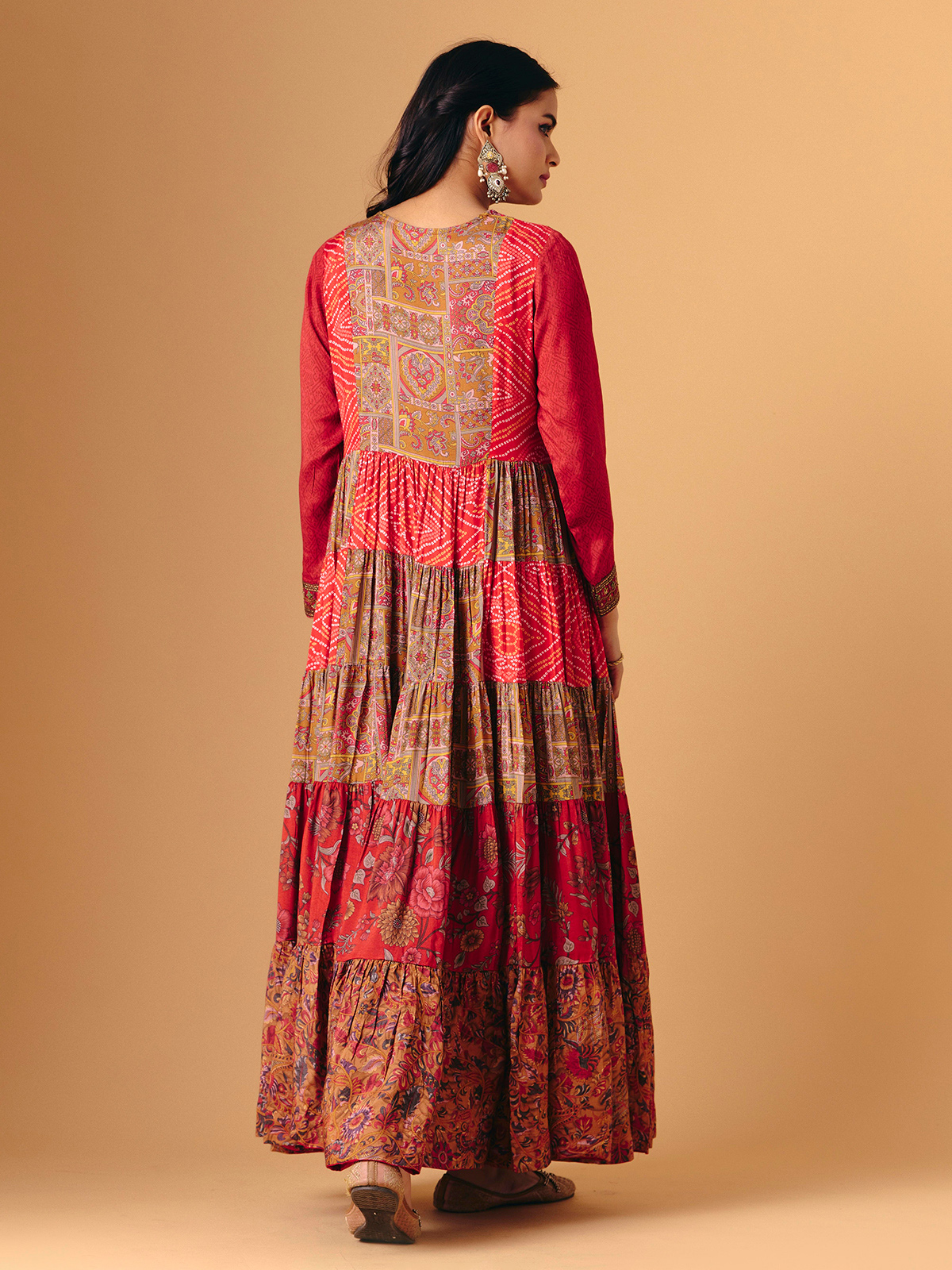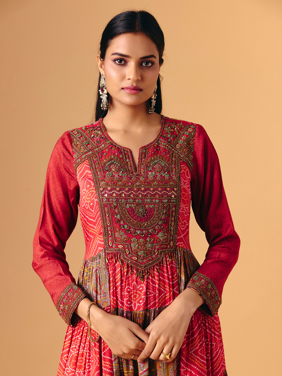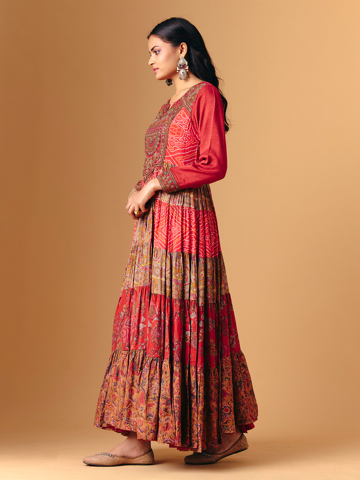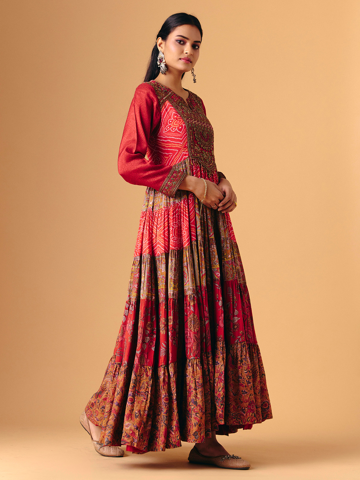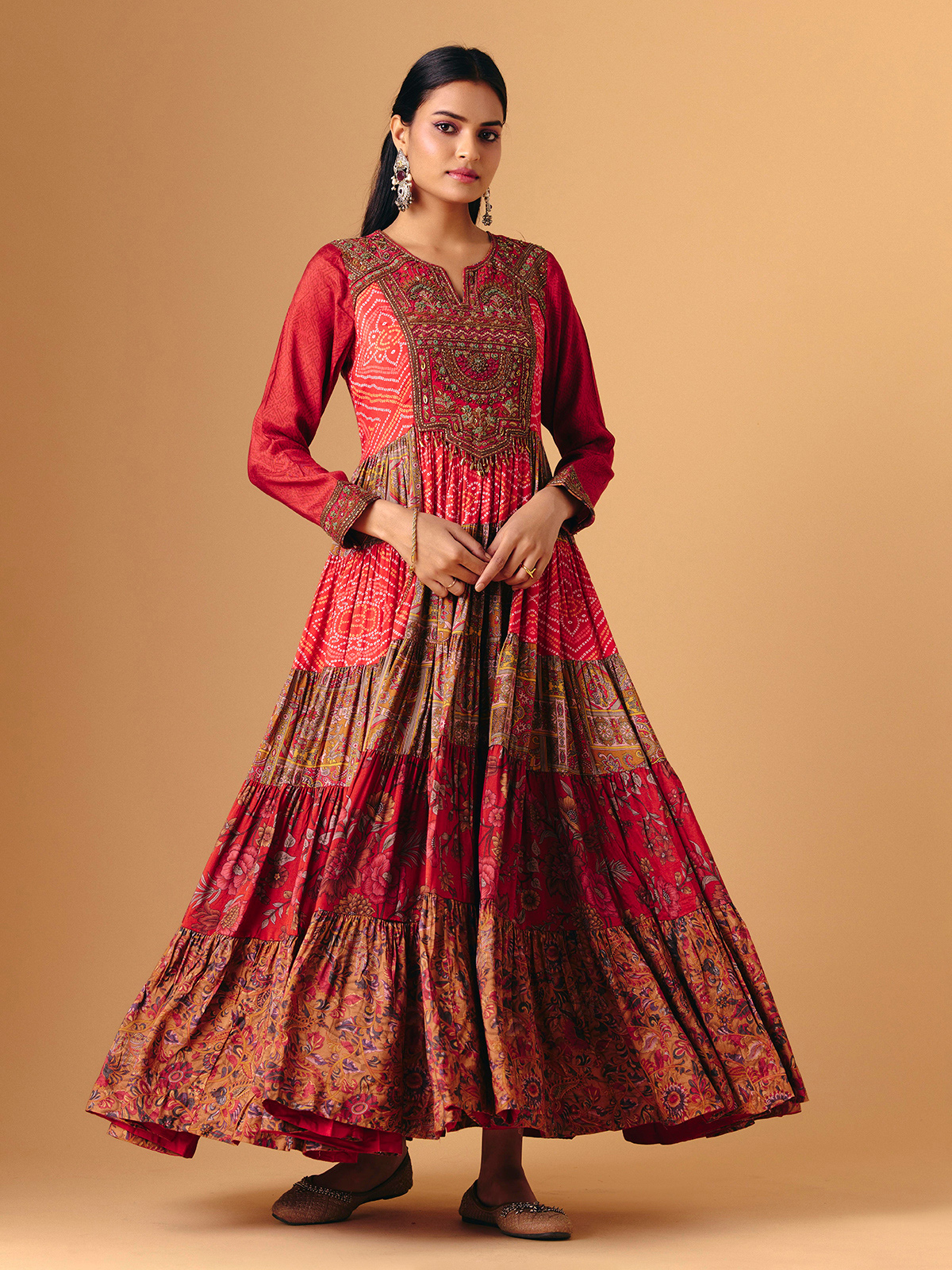 Vibrant red silk forms this elegant anarkali, enhanced with bandhani and floral prints accented by beads, sequins, embroidery and cutdana work. Quarter sleeves add graceful balance, while the flowing silhouette creates regal movement. A beautiful harmony of colour, print and traditional artistry.