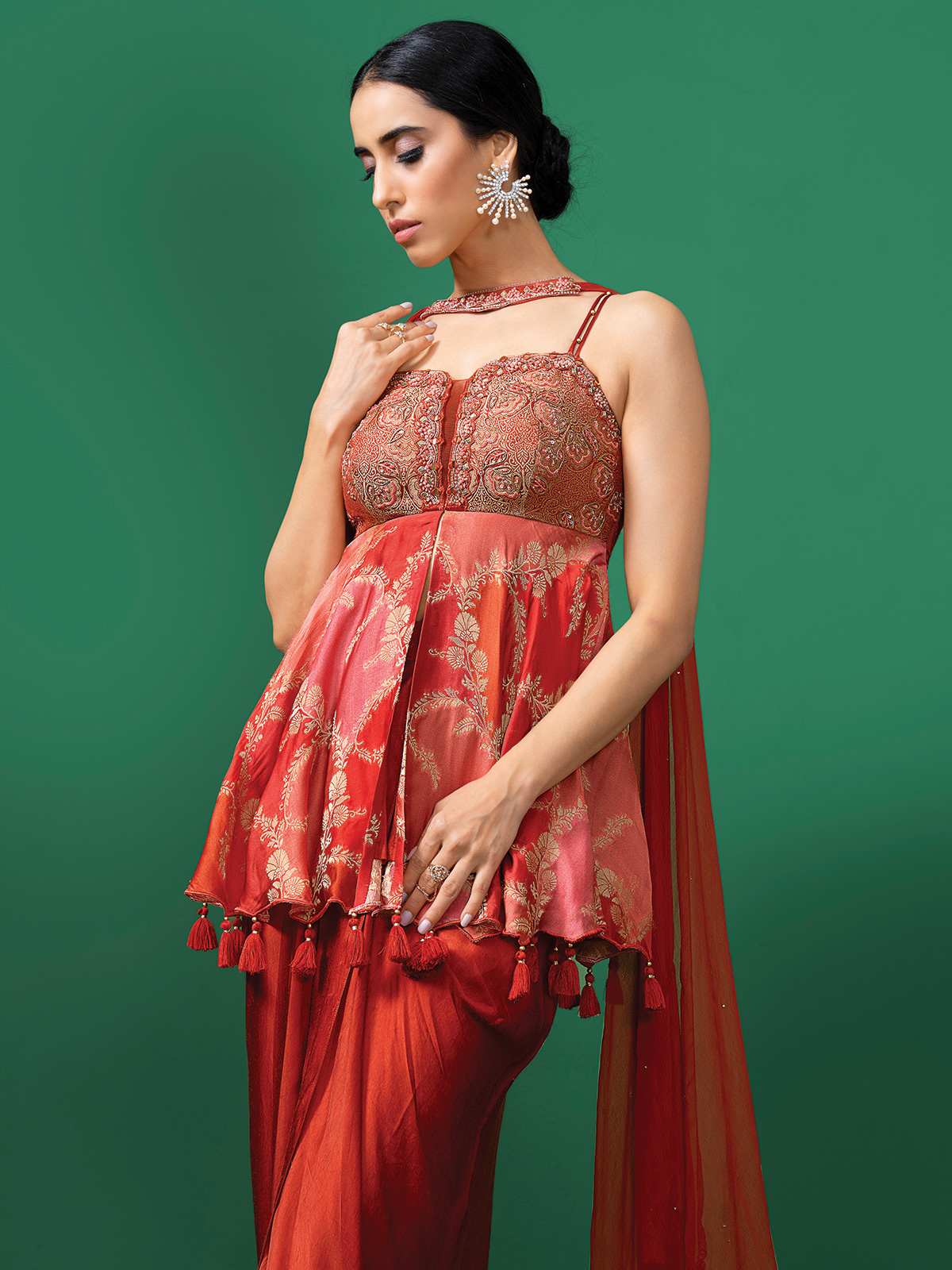For sophisticated festive attire, this red silk designer Indowestern is ideal. Features a sleeveless design and is embellished with eye-catching cutdana, zardosi, aabla, zari, and beaded work detailing. Includes a dupatta.