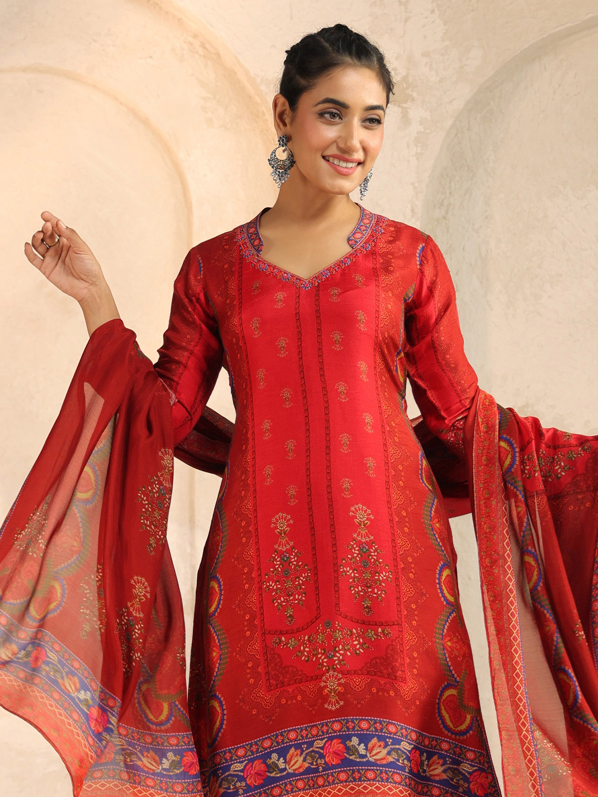 Made from red silk, this printed salwar suit sparkles with sequins, thread, and beads. Featuring a sweetheart neckline and quarter sleeves, it is paired with pant and dupatta. A romantic festive attire that blends elegance with vibrant energy.