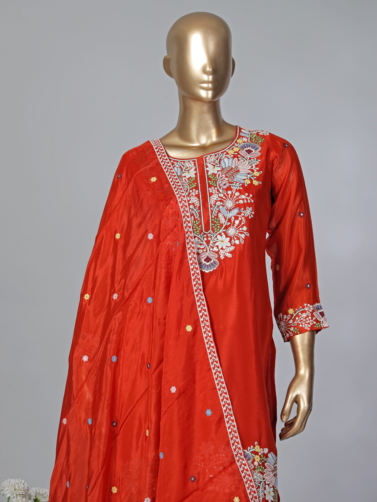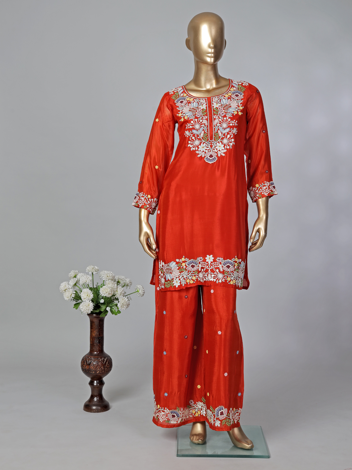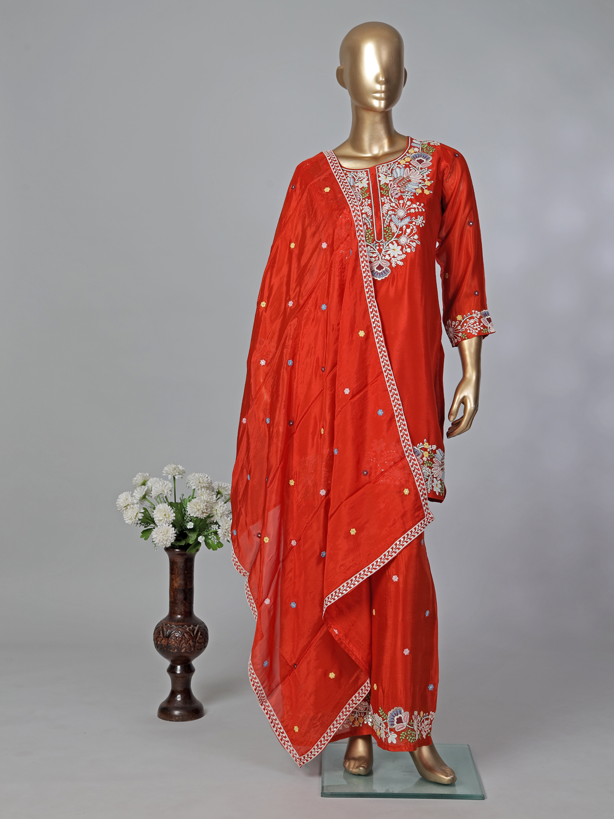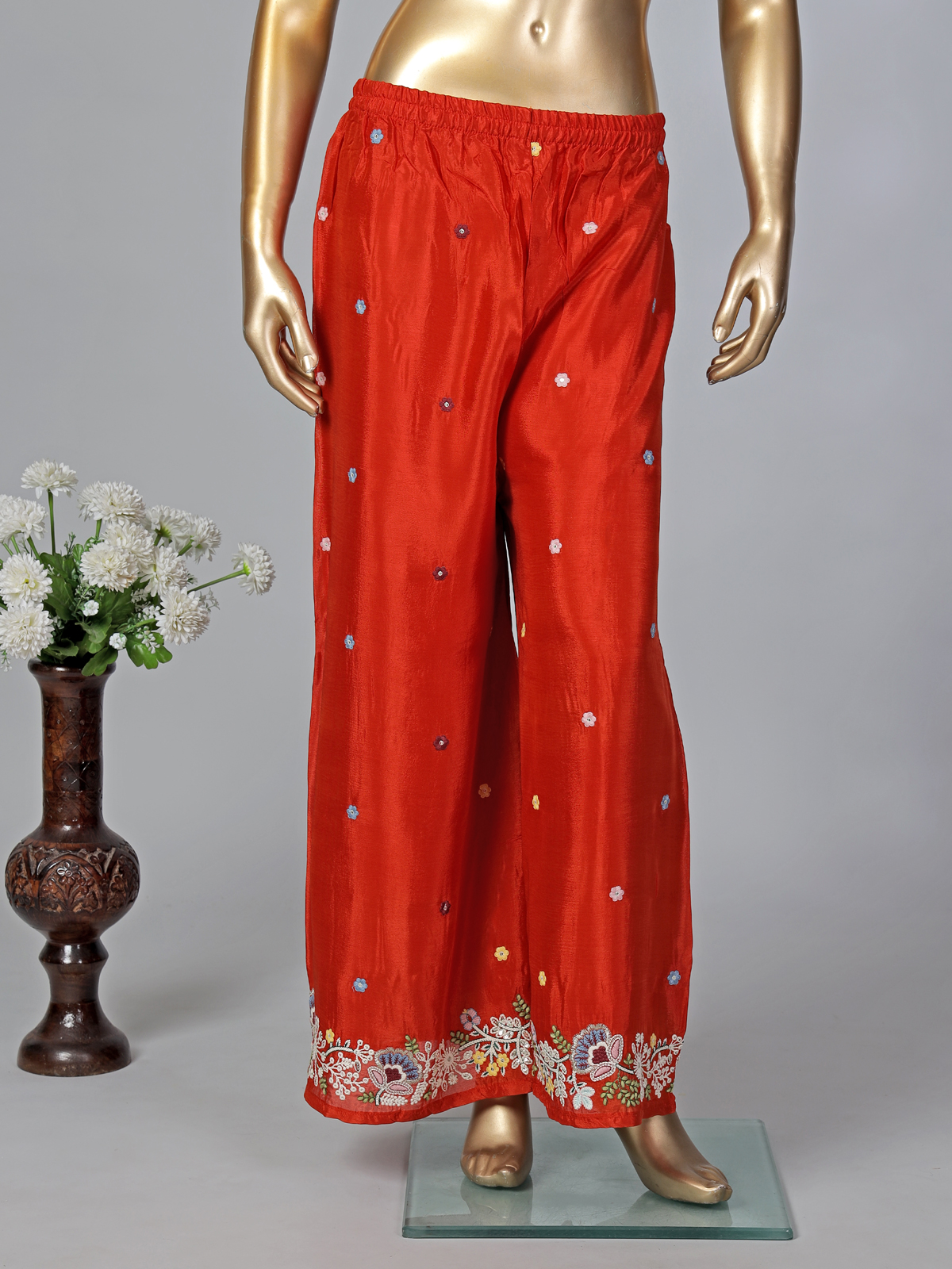 Command attention and look effortlessly beautiful in this rich red silk palazzo suit. It features a classic round neck and quarter sleeves, adorned with intricate sequins and thread work. Ideal for festivals, weddings, and eid, this stunning look includes flowing palazzos and a beautifully embellished dupatta.