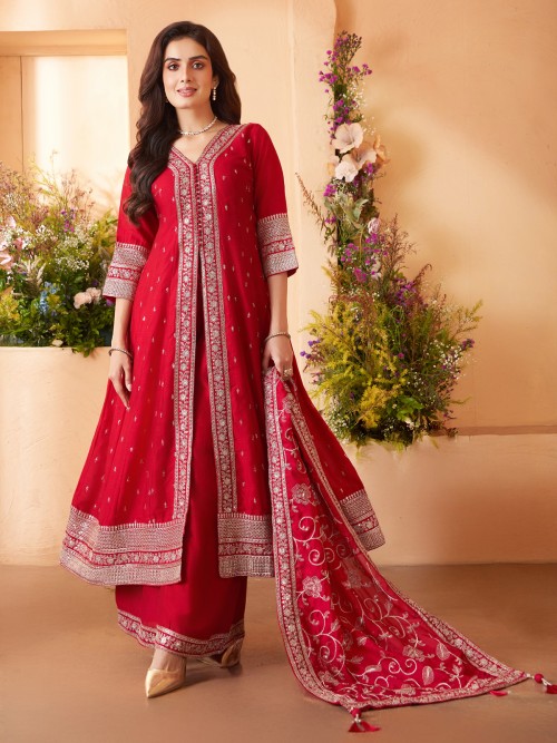 Red Silk Palazzo Suit With Enduring Festive Brilliance