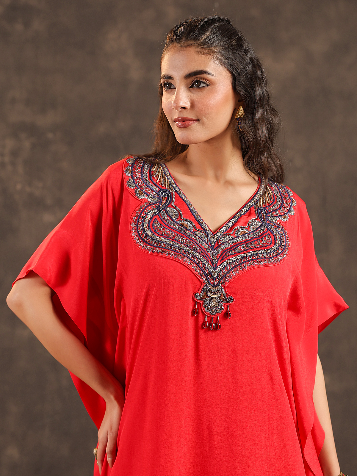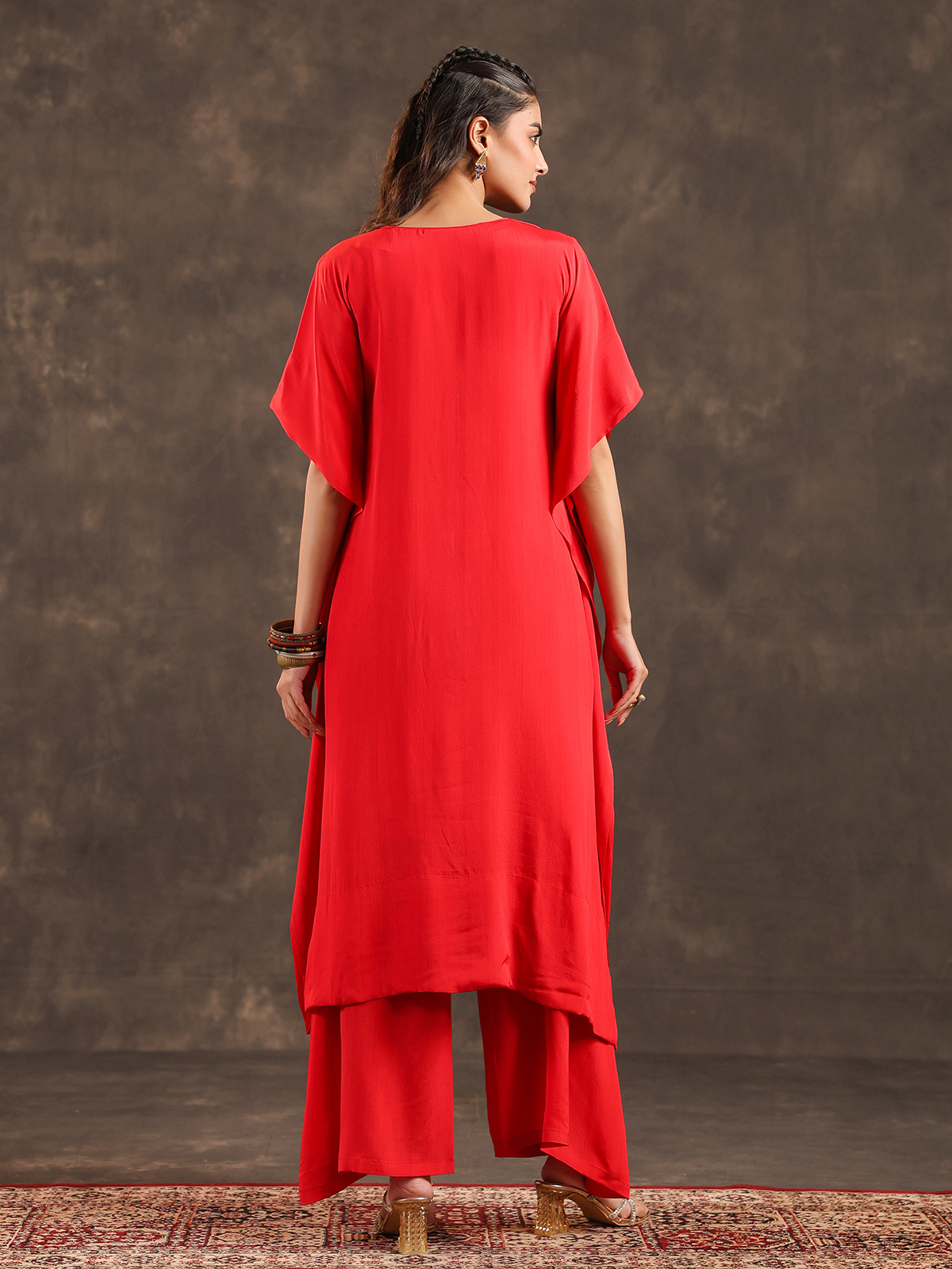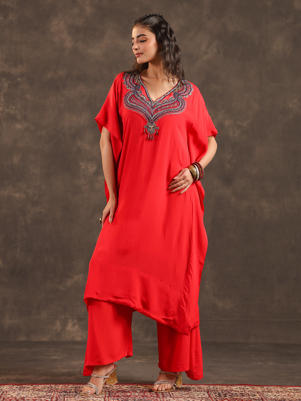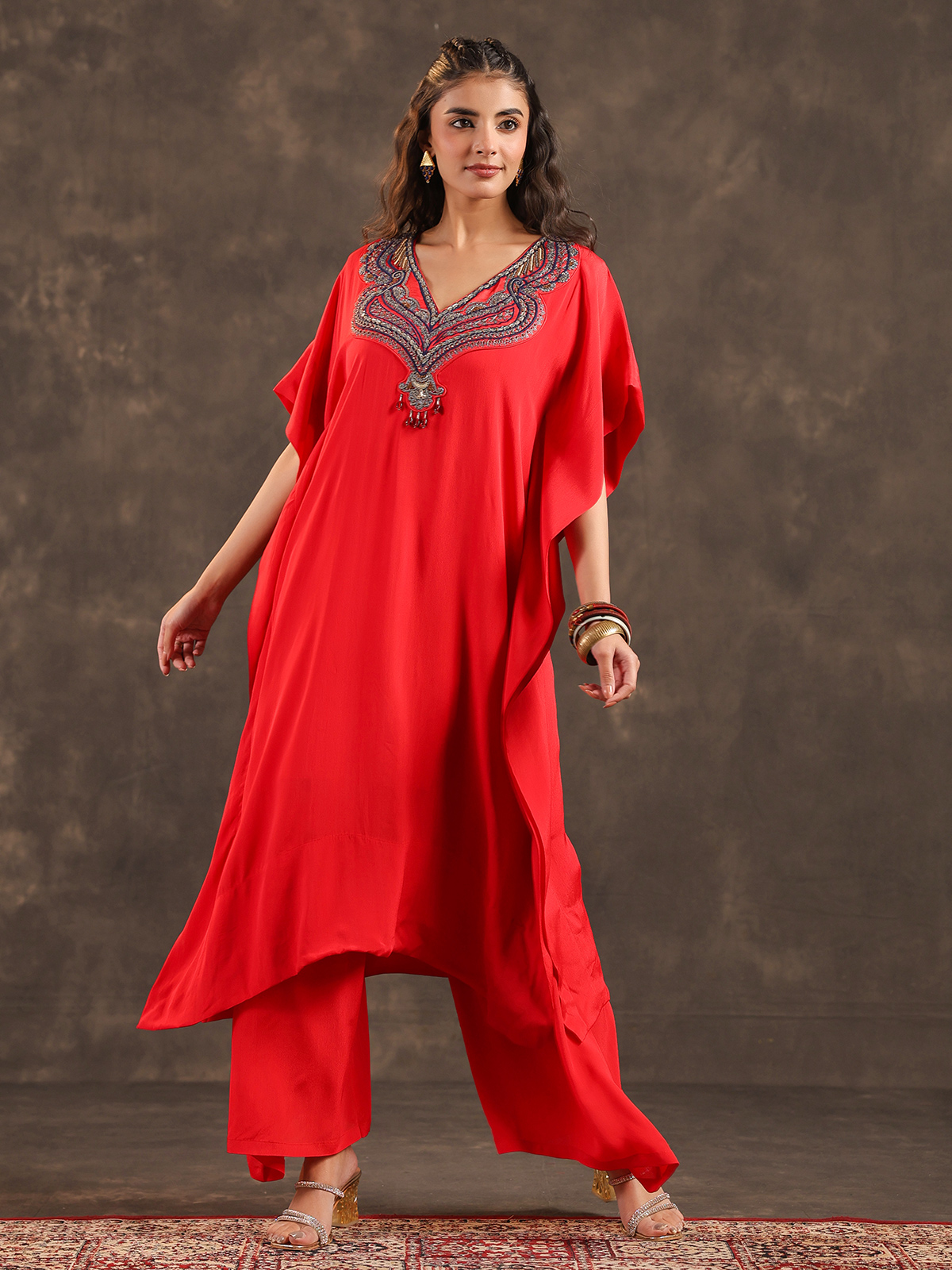 Radiant and celebratory red viscose crepe kaftan suit reflects timeless festive elegance. The V neck silhouette is delicately enhanced with thread, sequins and bead detailing that adds refined sparkle. Styled with flowing palazzo pants, the ensemble creates a striking yet graceful ethnic look, making it an ideal choice for weddings, sangeet celebrations and vibrant festive gatherings.