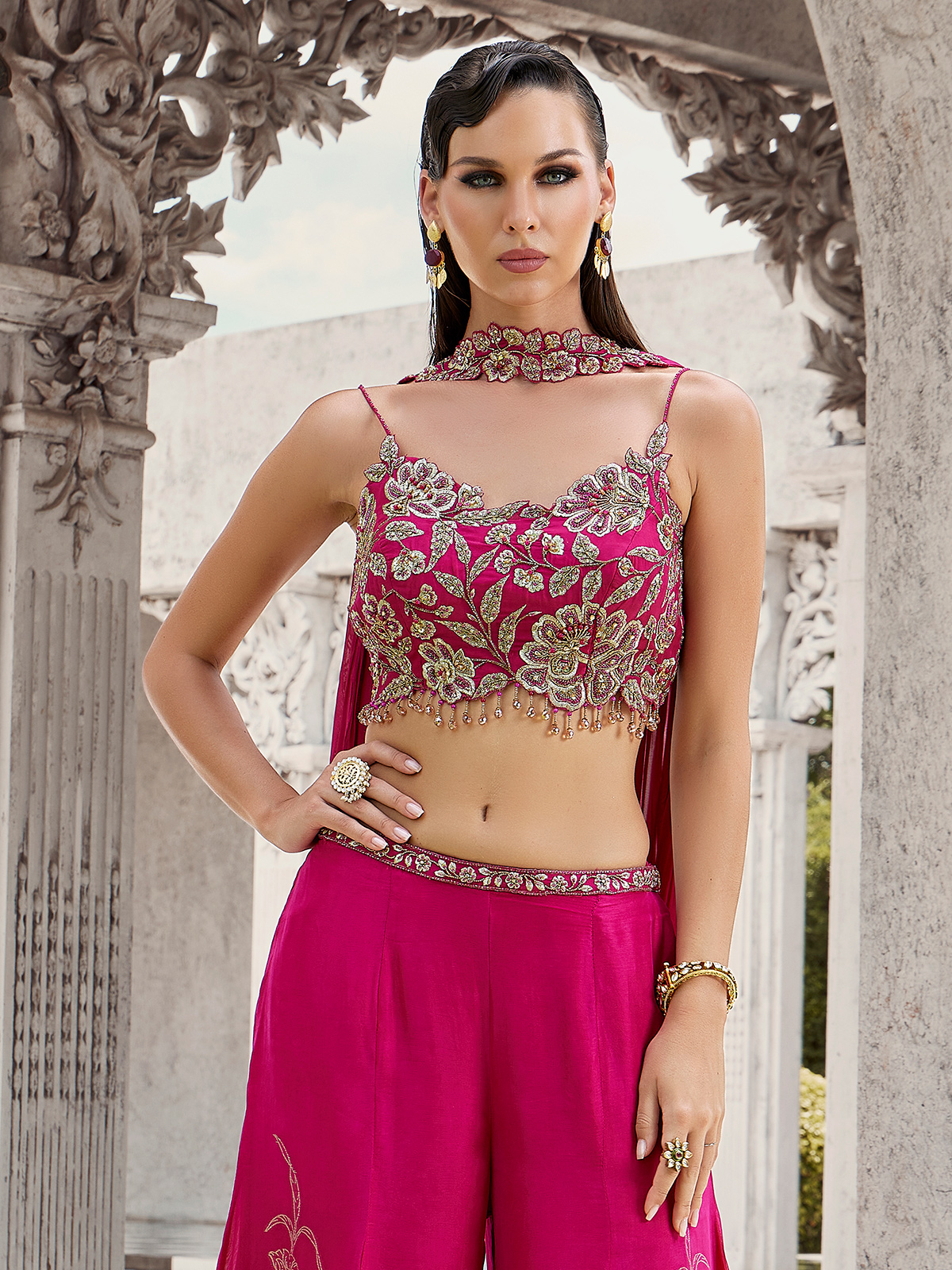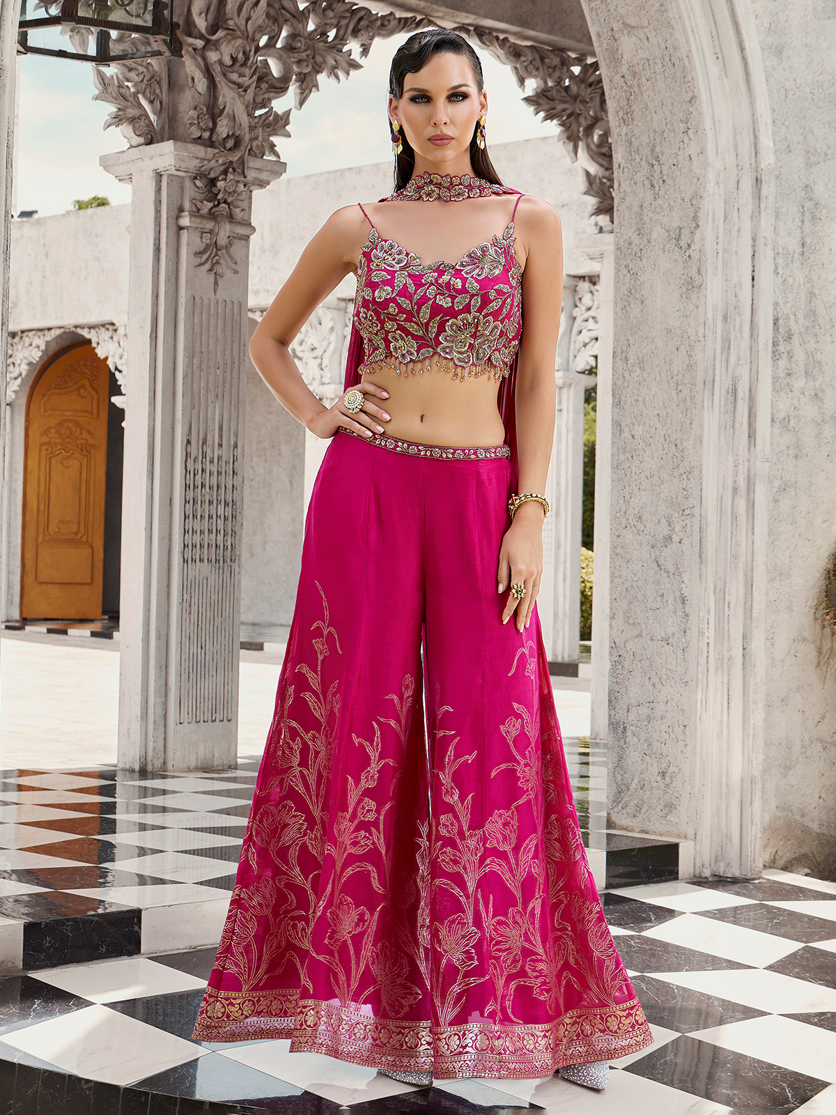 This rani-pink silk palazzo suit glistens with cutdana, sequins, beads, zari and pearl work. The round neckline and sleeveless design bring contemporary charm, finished with a dupatta and palazzo perfect for weddings, festive occasions and receptions.