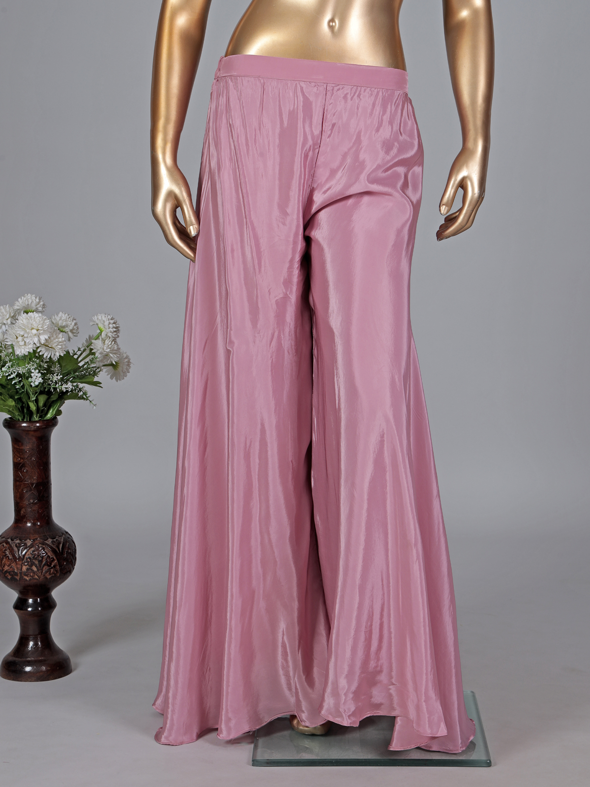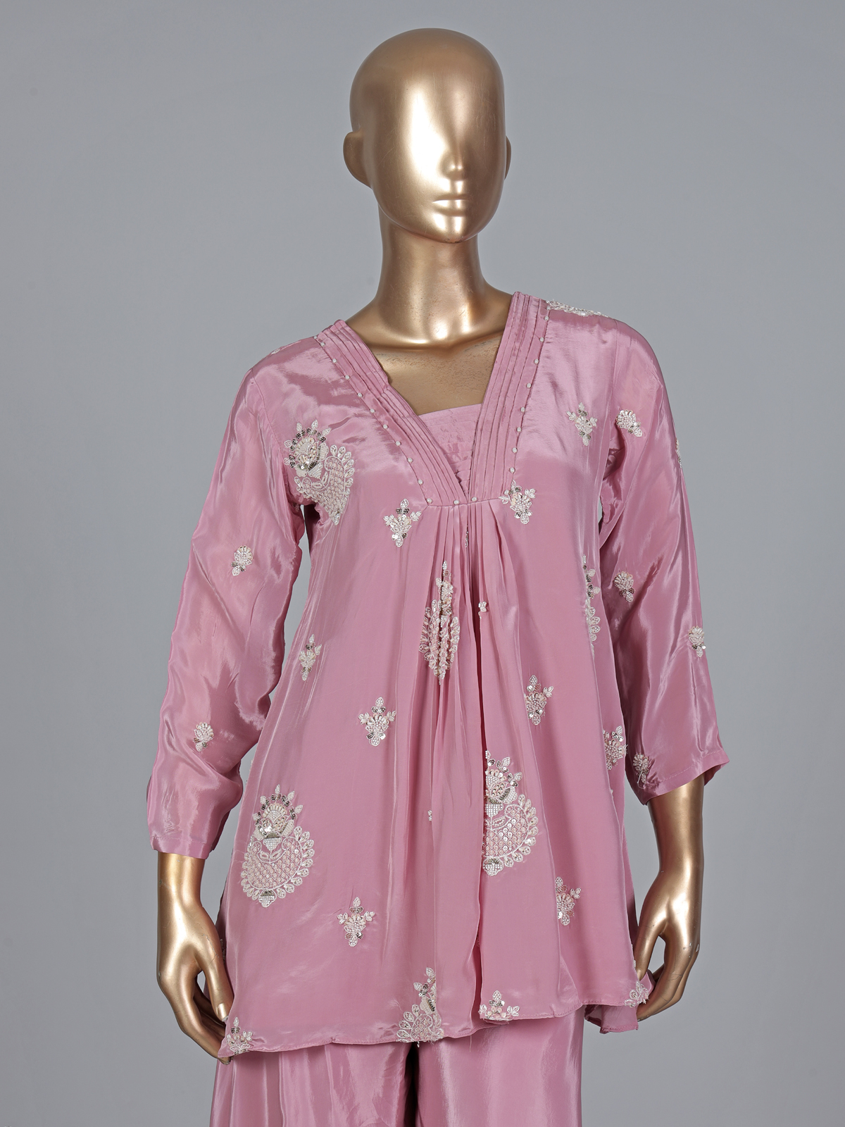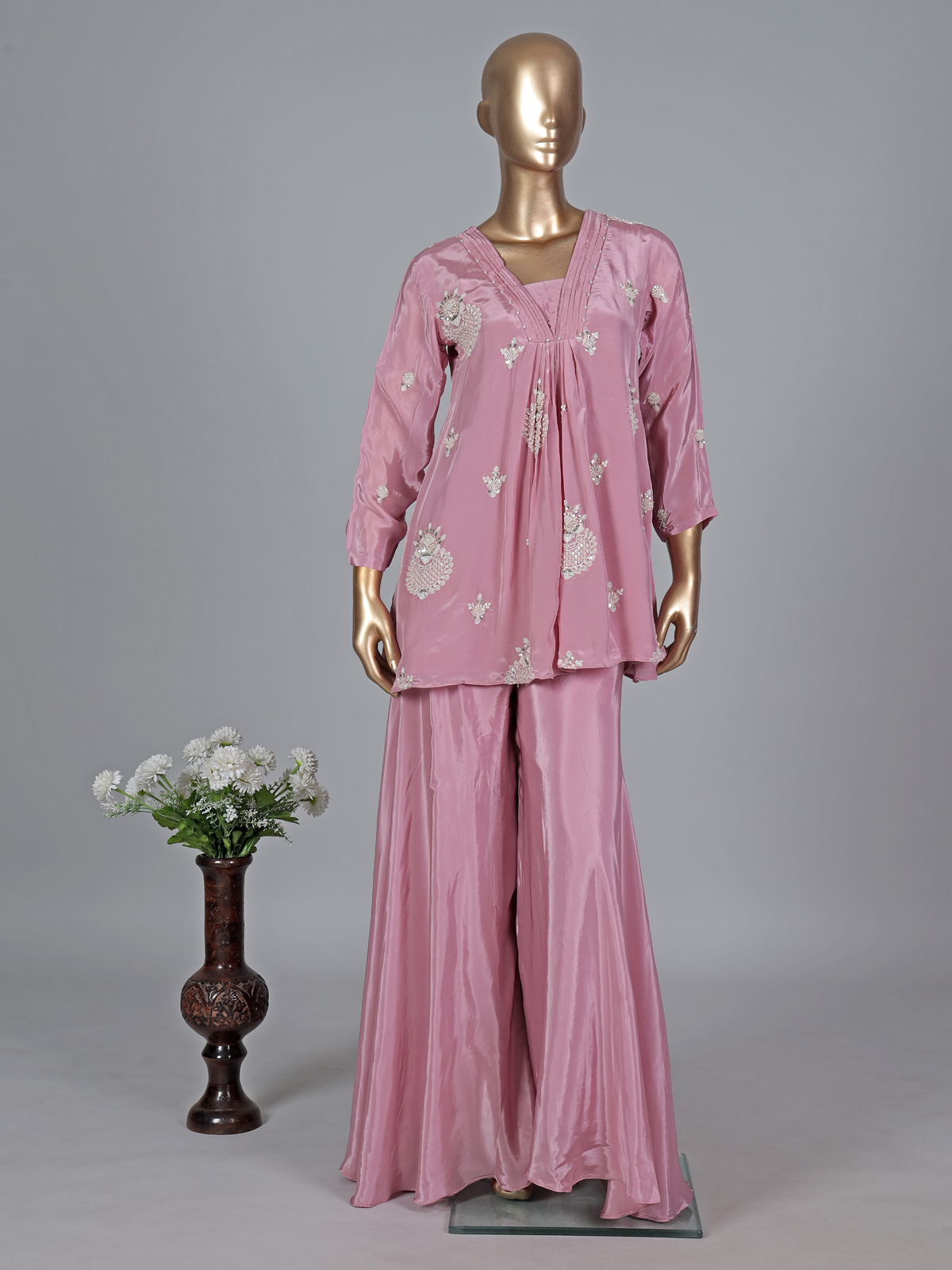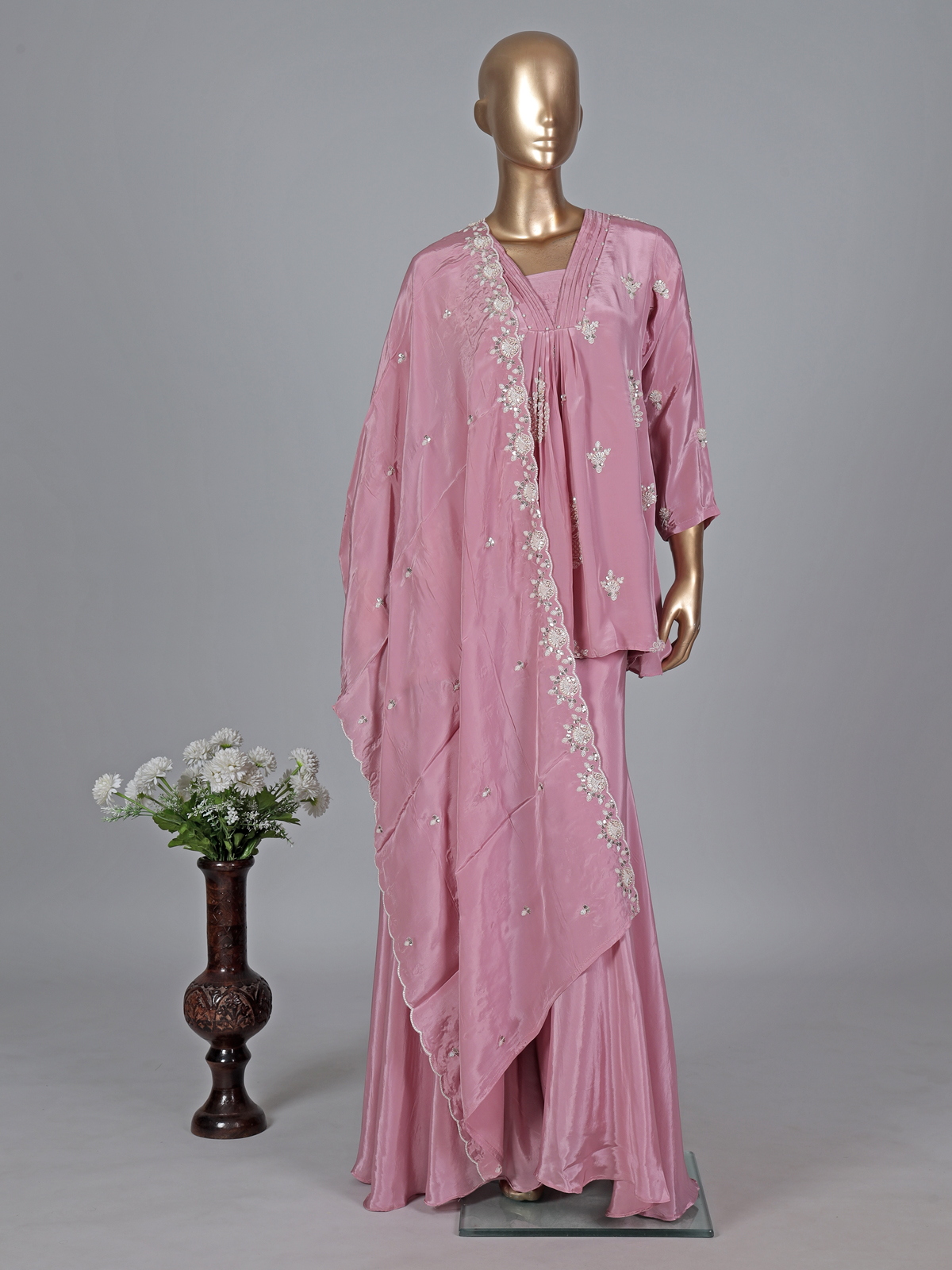 Soft and feminine, this rose pink sheen georgette silk salwar suit features intricate cutdana, sequins, beads, and thread embroidery for a festive glow. Designed with a V-neckline and quarter sleeves, it comes with a palazzo and dupatta, ideal for Eid celebrations, festive gatherings, and weddings.