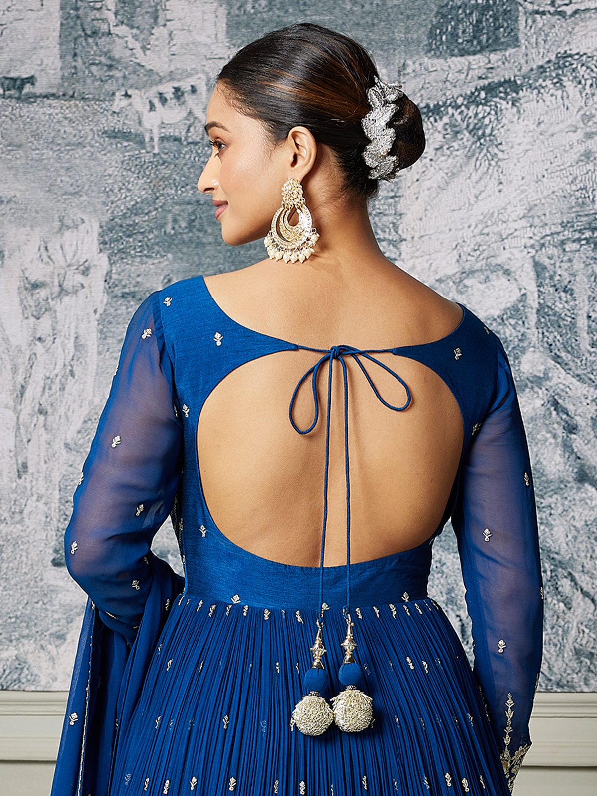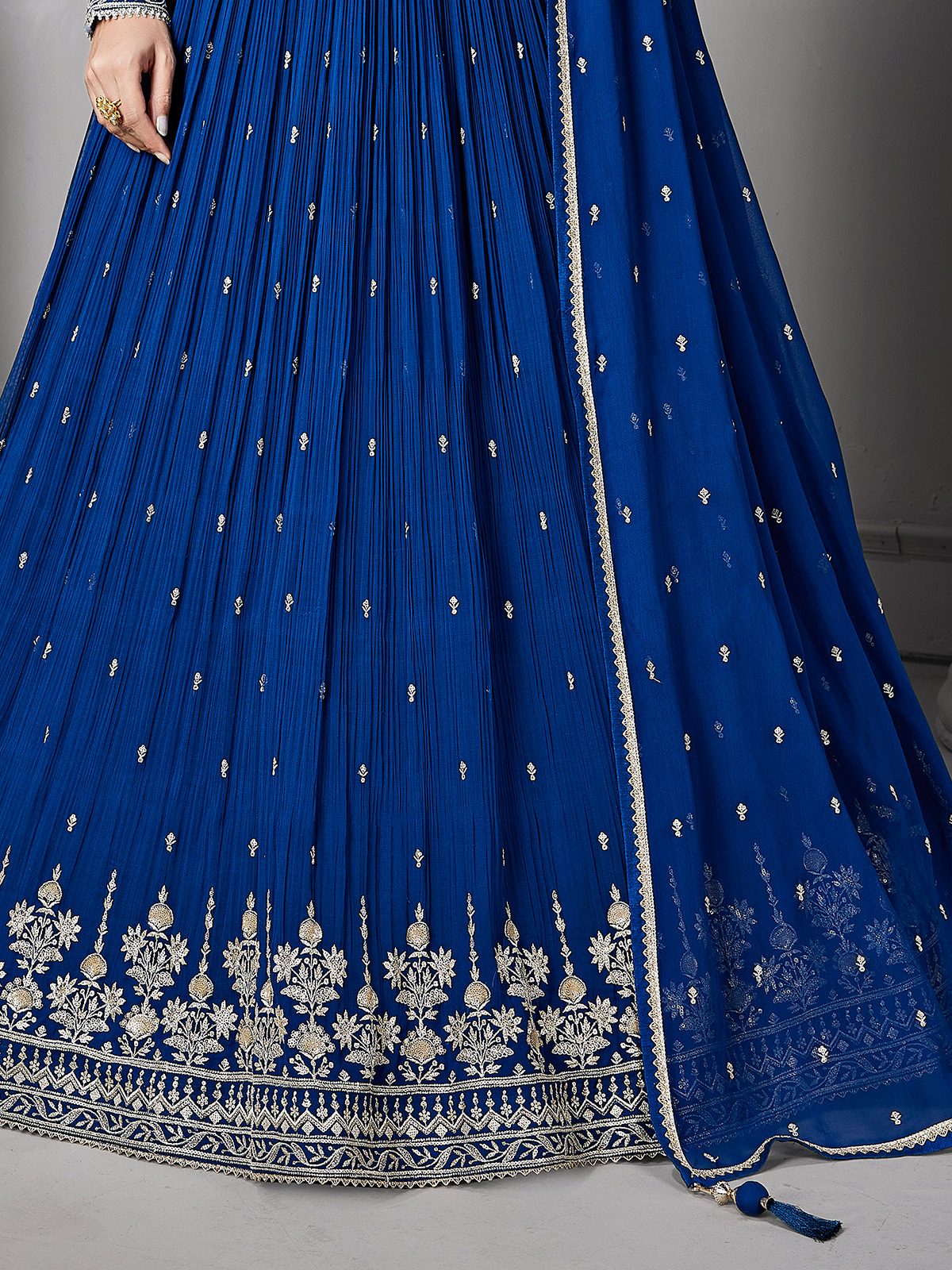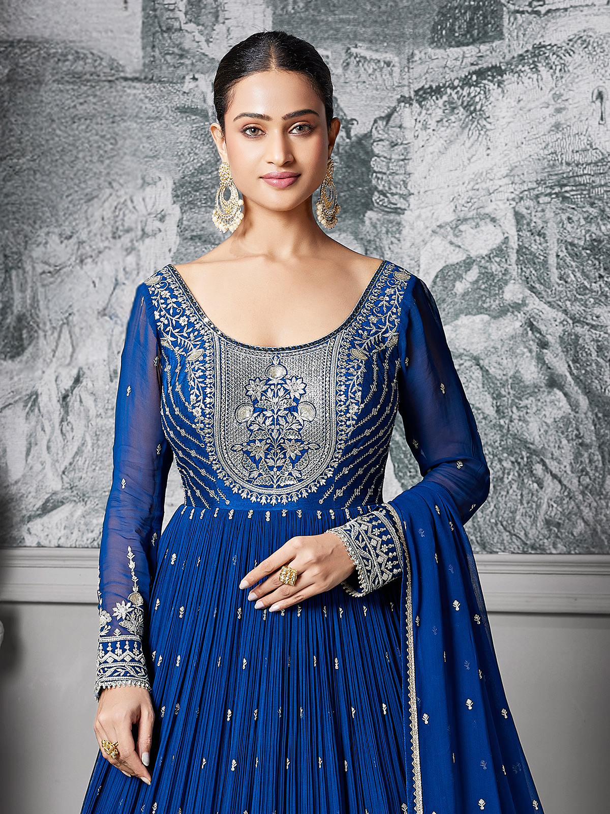 Crafted in rich royal blue georgette, this Pakistani-style Anarkali suit is enhanced with refined embroidery, sequins and stone embellishments. Featuring a round neckline and full sleeves, it is paired with a dupatta, creating timeless elegance for wedding and reception occasions.