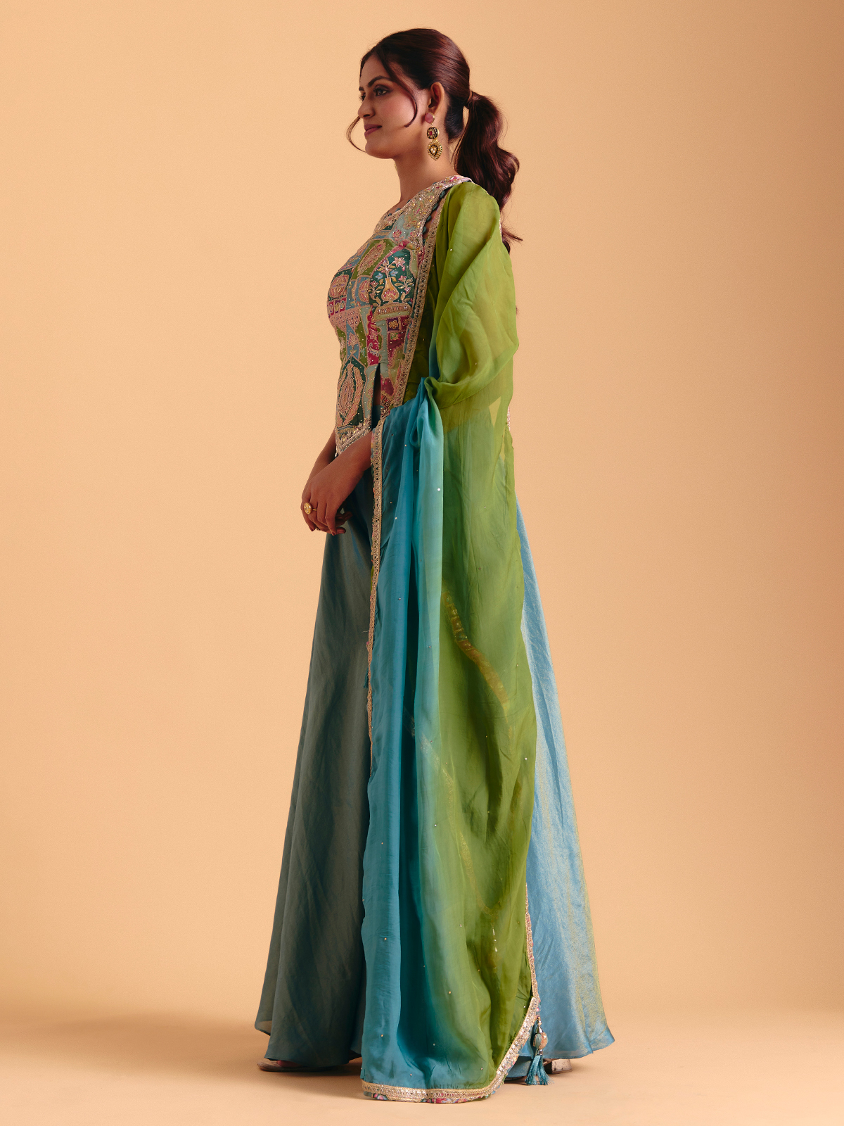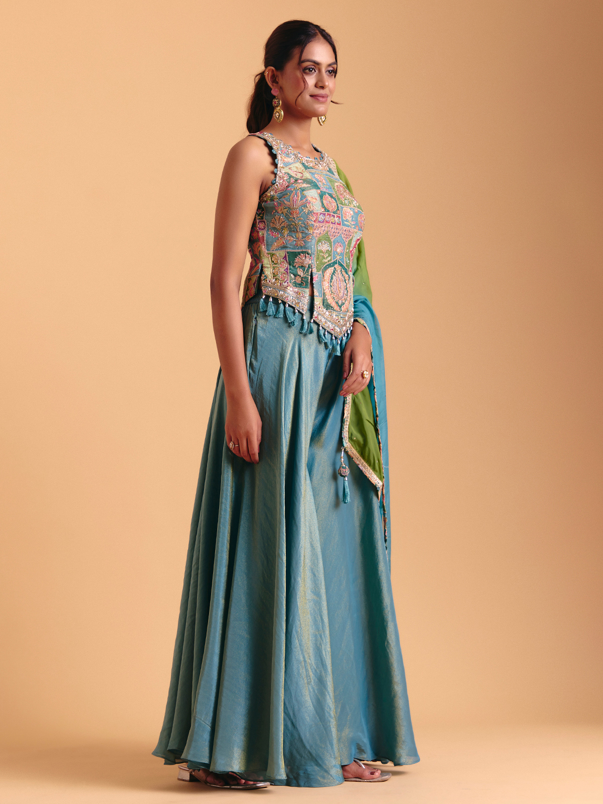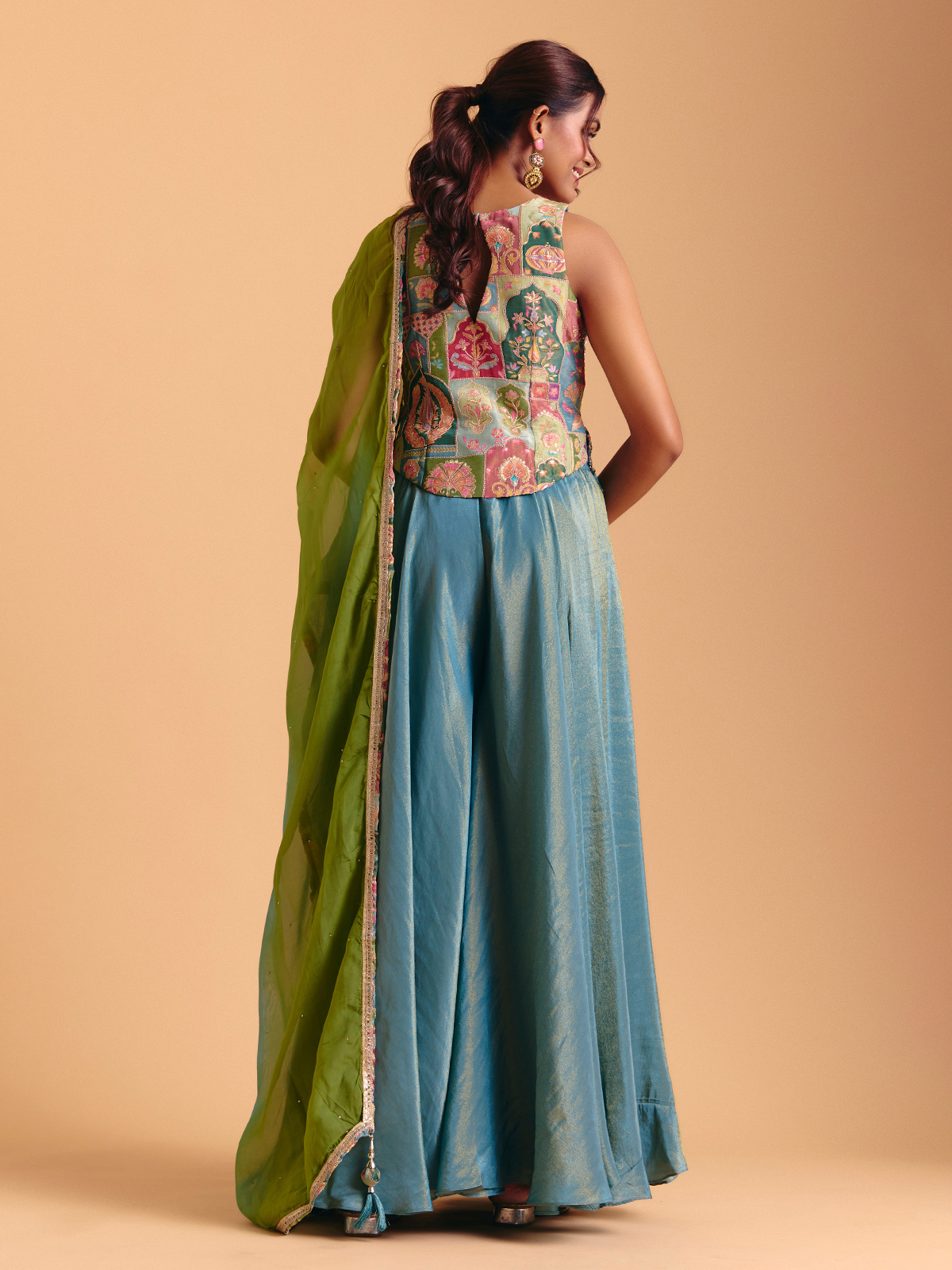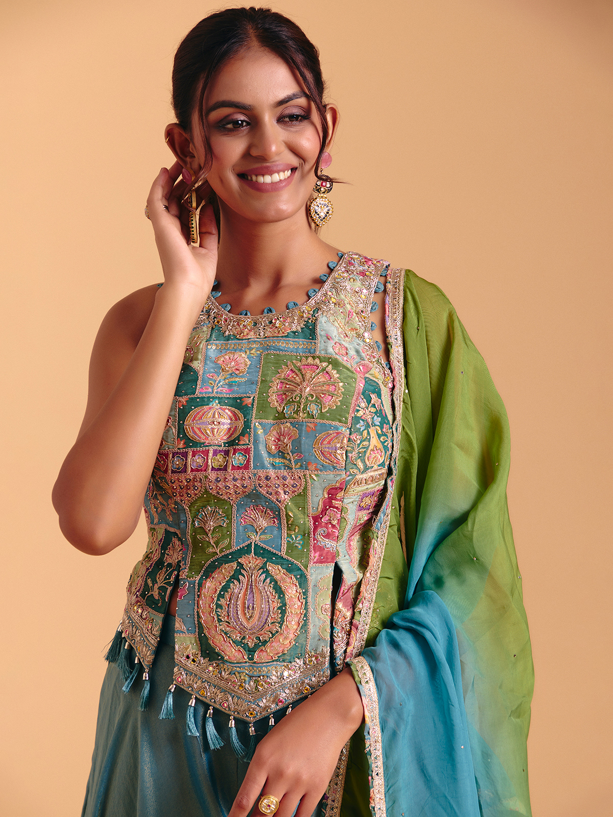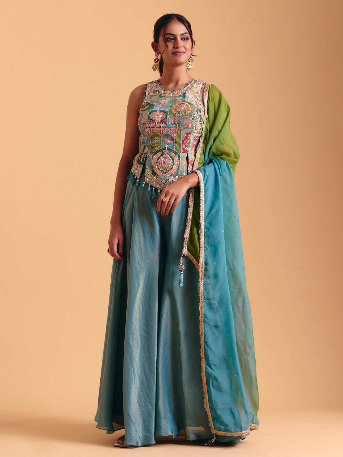 Crafted in luxurious silk in a serene blue tone, this palazzo suit exudes an elegant festive aura. Resham, sequins, stone, mirror, zardosi and cutdana illuminate the round neckline and sleeveless silhouette with delicate artistry. A soft-flowing palazzo pairs beautifully with the gracefully draped dupatta, completing its refined charm.