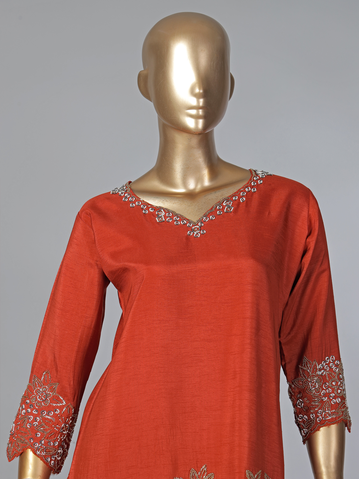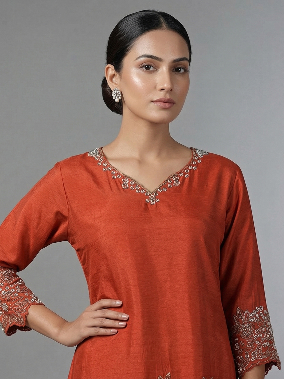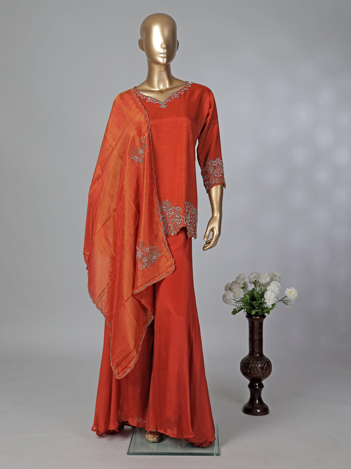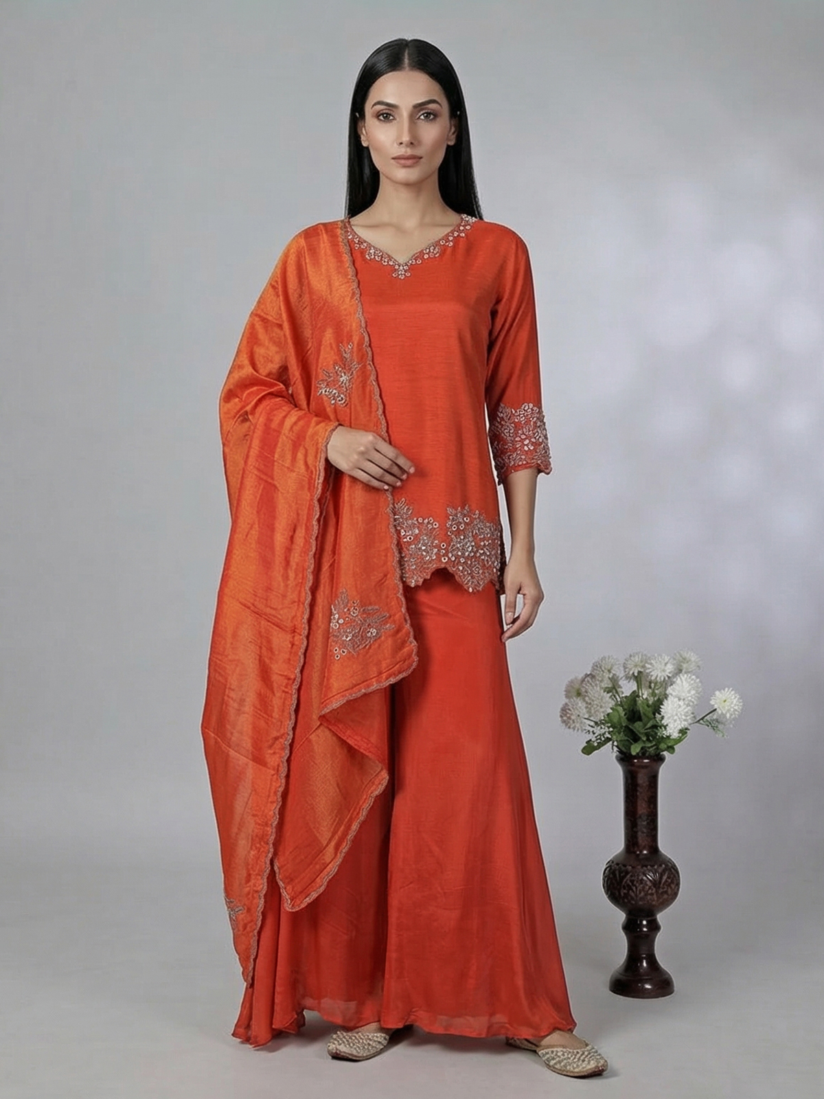 Warm rust orange tones elevate this chiffon silk palazzo suit with delicate cutdana, bead and thread detailing. The sweetheart neckline and quarter sleeves add charm, while the palazzo and dupatta complete this elegant festive outfit.