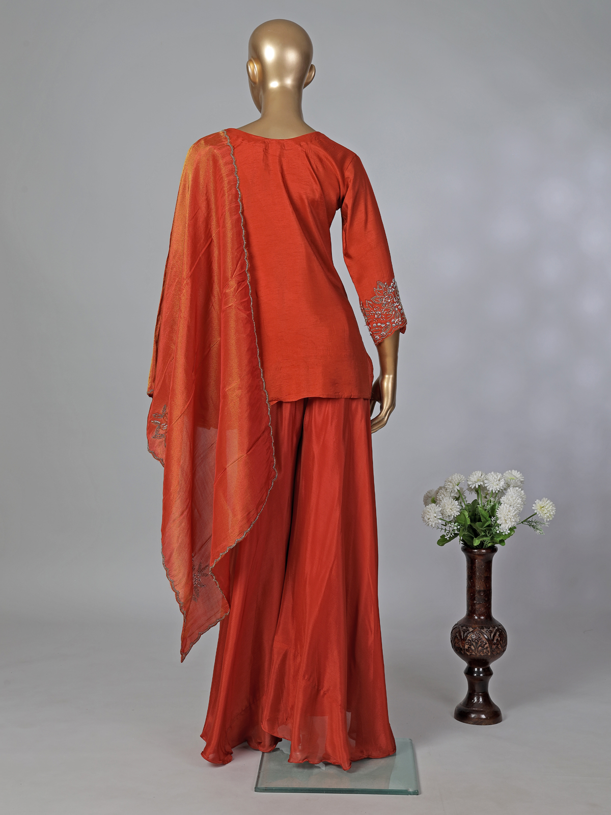 Rust Orange Chiffon Silk Festive Palazzo Suit With Embellishments