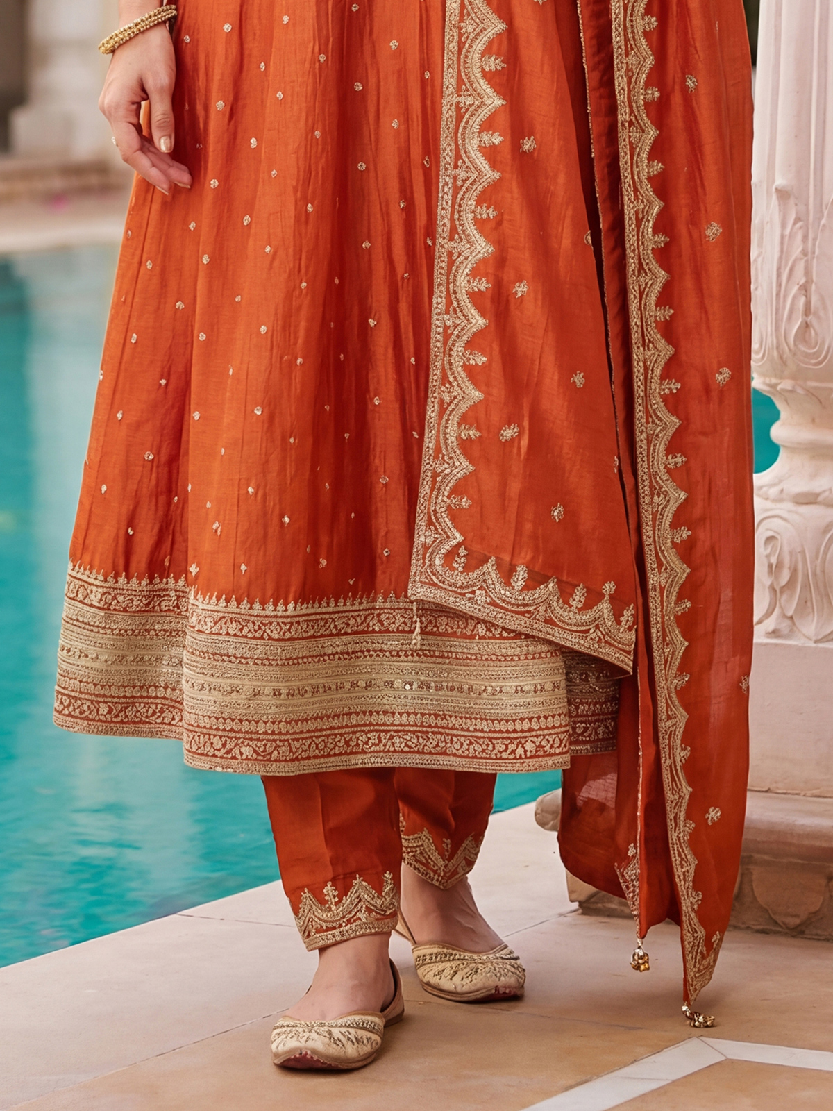 This rust orange silk anarkali suit. Features rich resham and sequin embellishments for a festive glow. Styled with a round neckline and sleeveless pattern, it is paired with pants and a dupatta, offering effortless elegance for weddings, sangeet and grand celebrations.