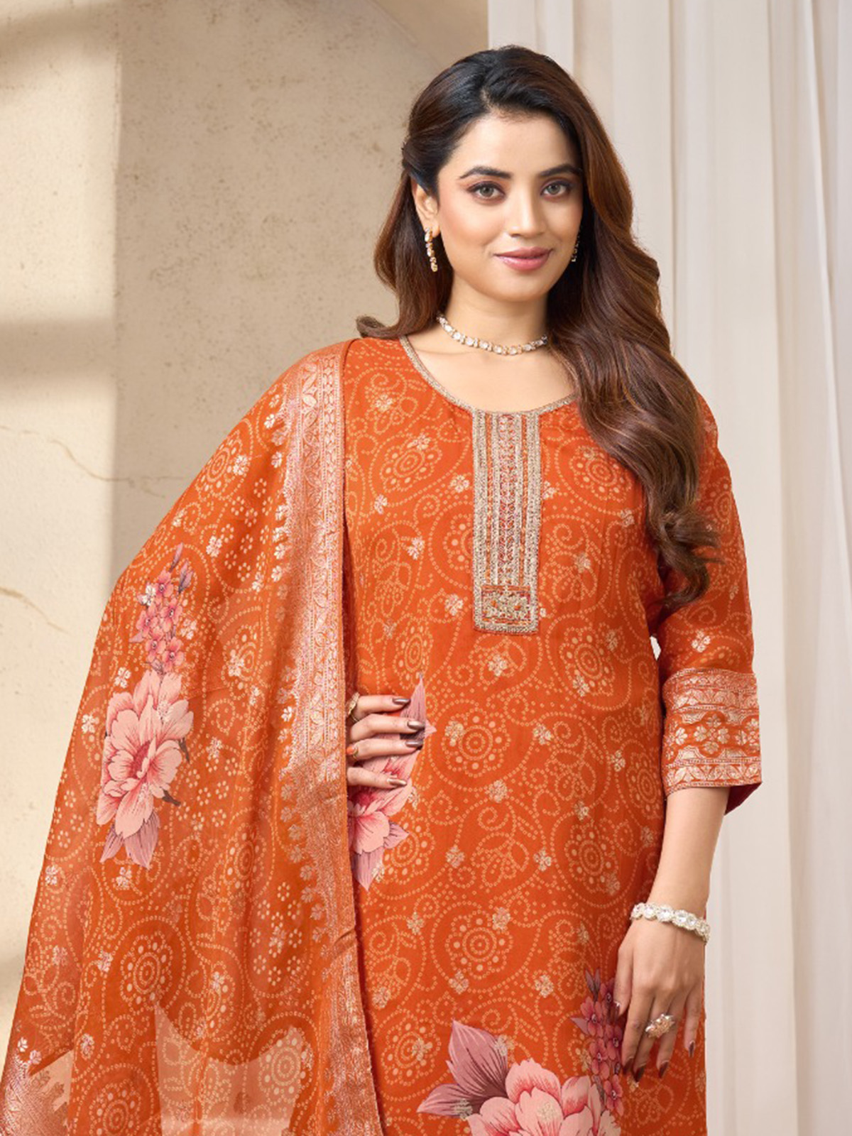 Rich rust orange hues enhance the beauty of this silk bandhej printed salwar suit. The straight cut kurti features a classic round neckline with quarter sleeves. Adorned with thread, cutdana, sequins and zari embellishments. Styled with comfortable pants and a graceful dupatta, the ensemble forms a lively festive look perfect for celebrations.