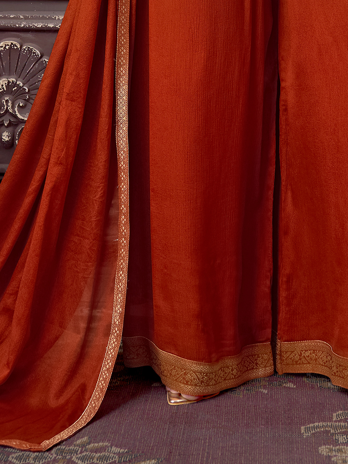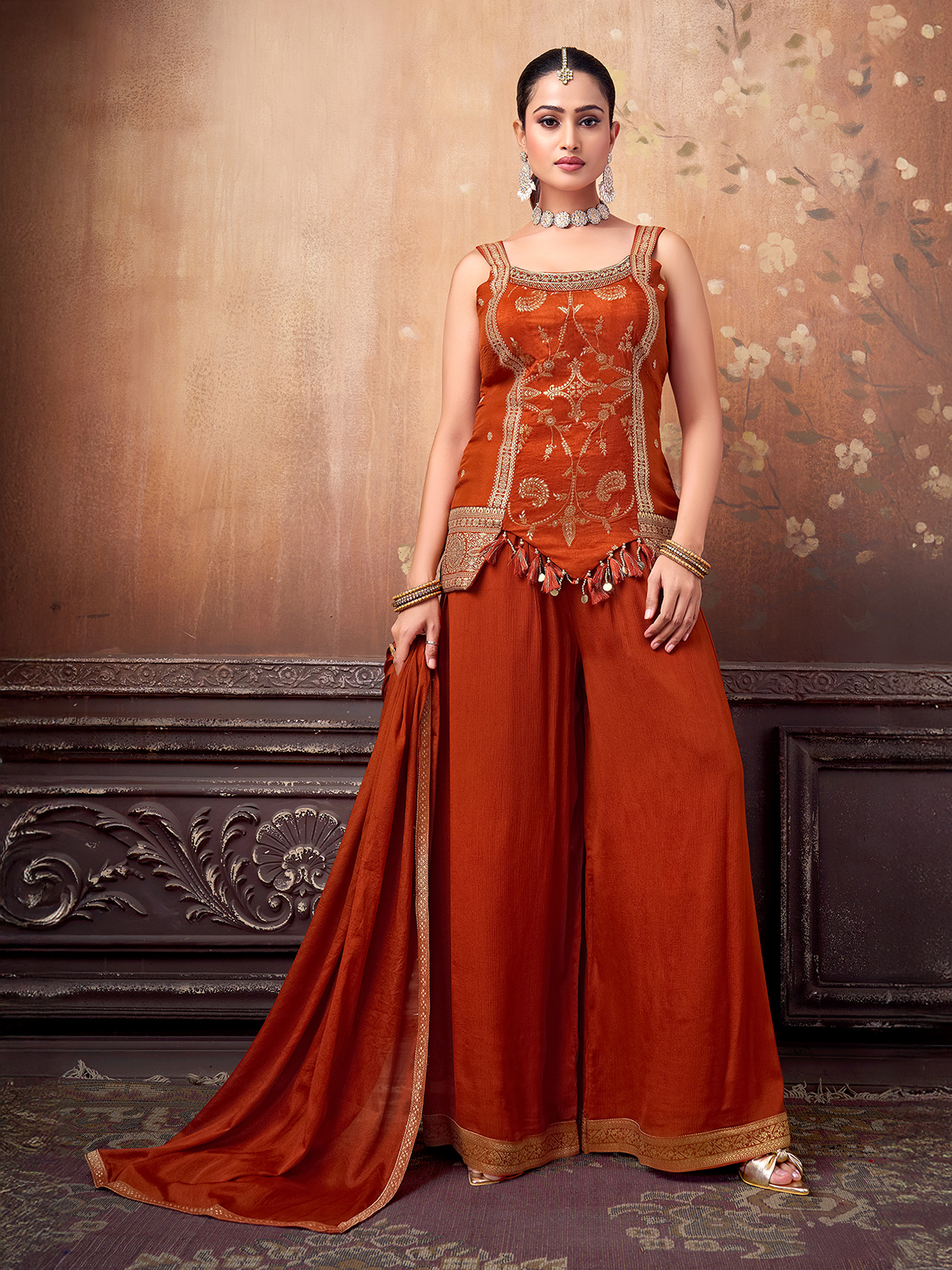 Rust Orange Silk Embellished Palazzo Suit