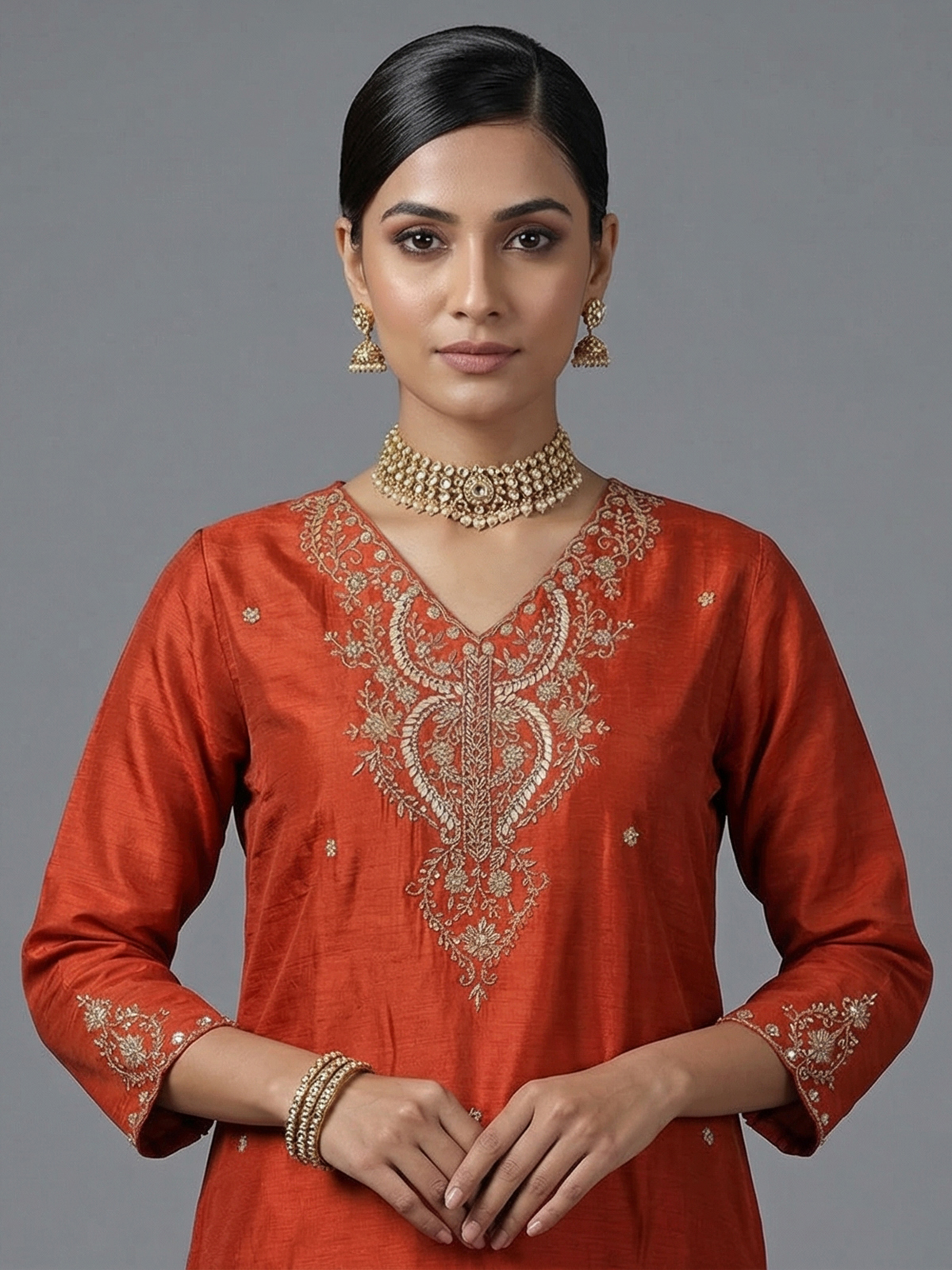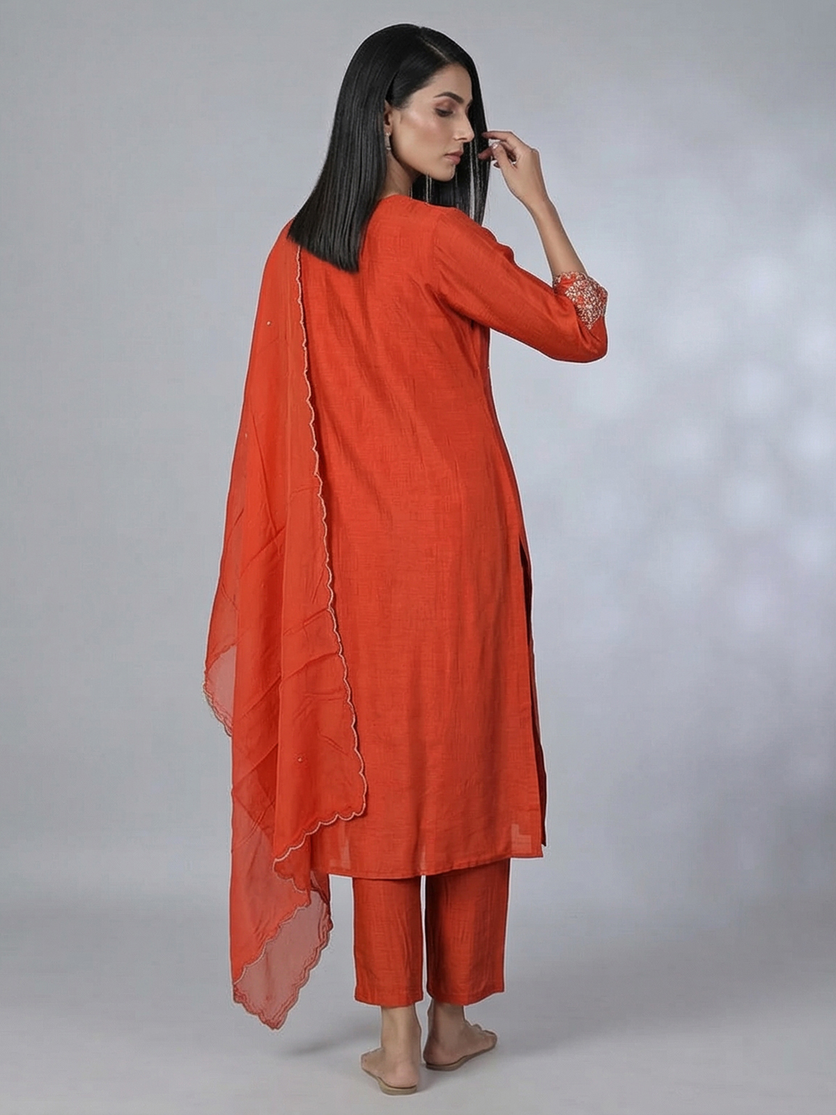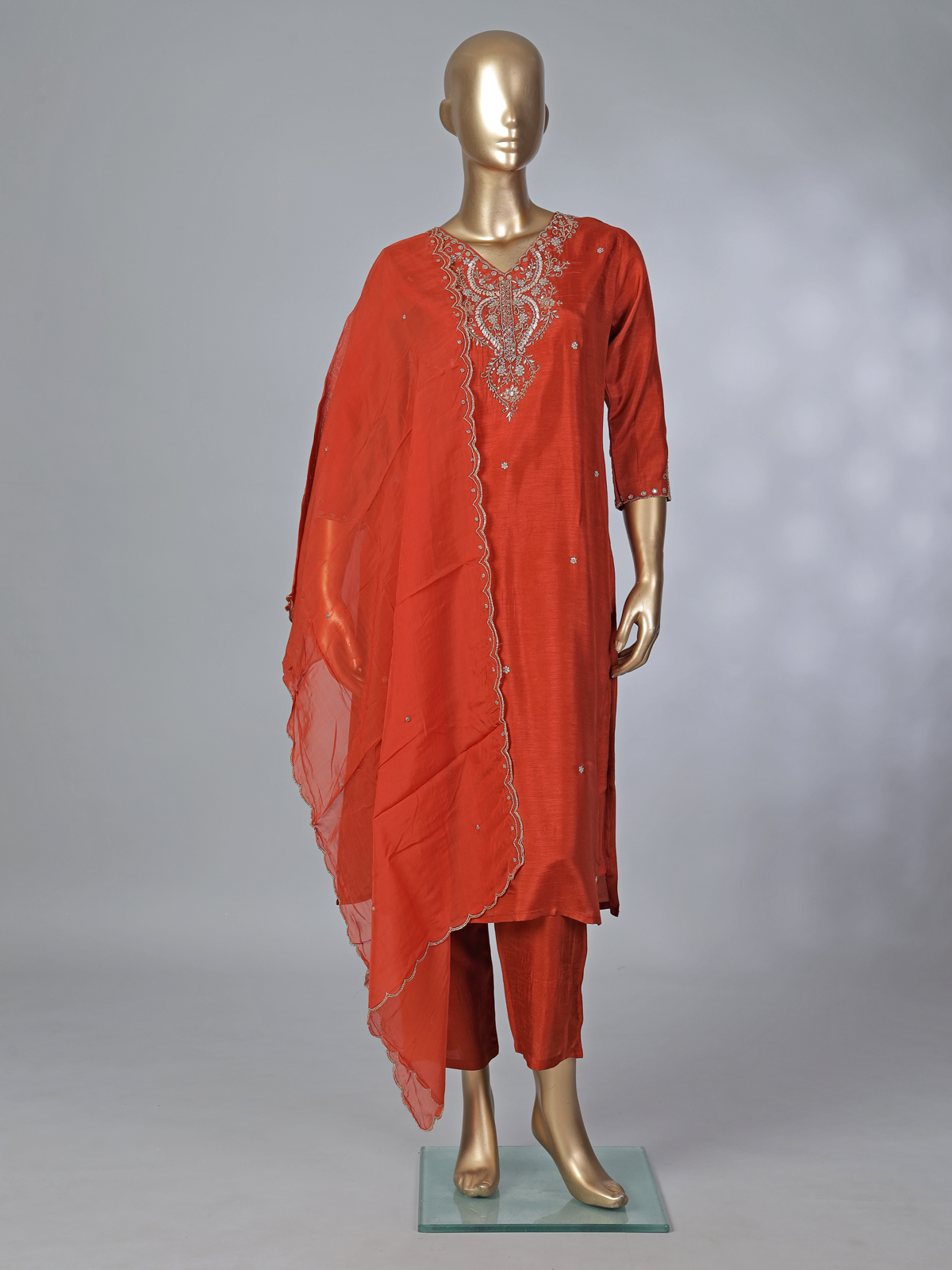 Rich rust orange hues define this silk salwar suit, enhanced with cutdana, beads, sequins and zardosi detailing. The V neckline and quarter sleeves create a flattering silhouette, paired with pants and a dupatta for festive elegance.