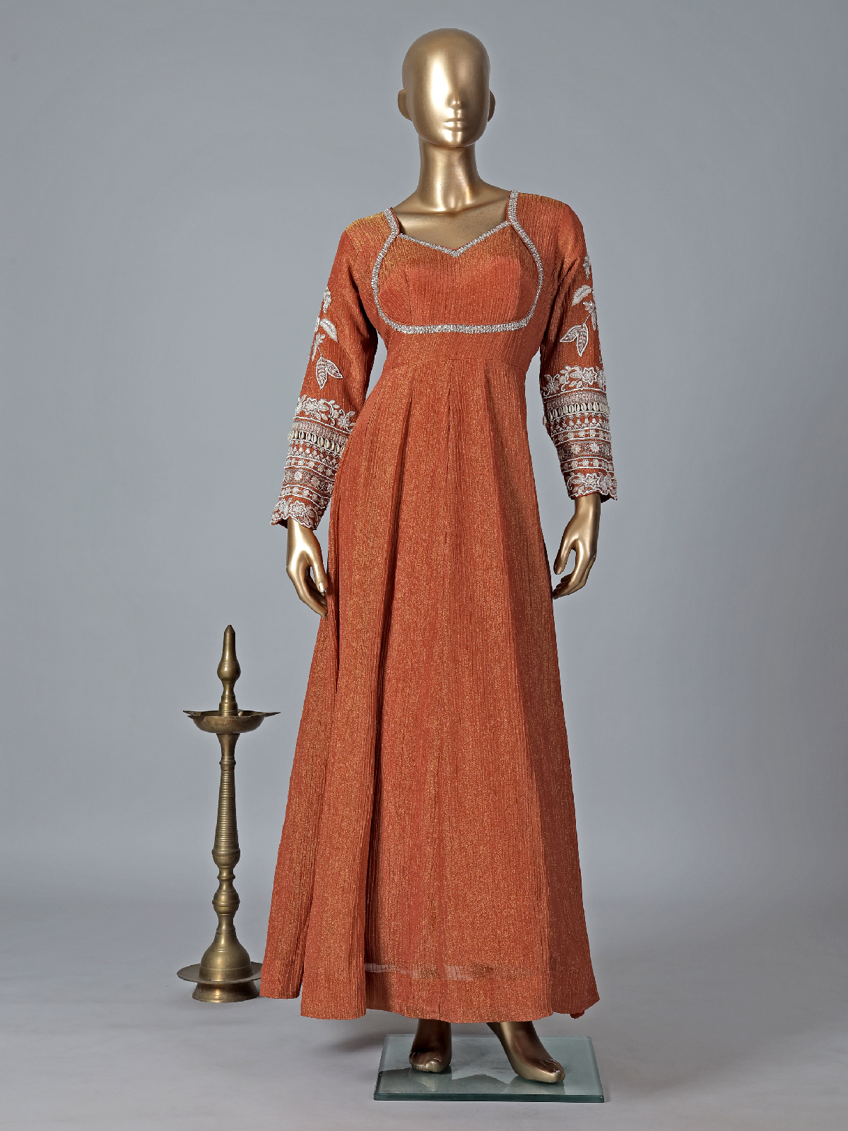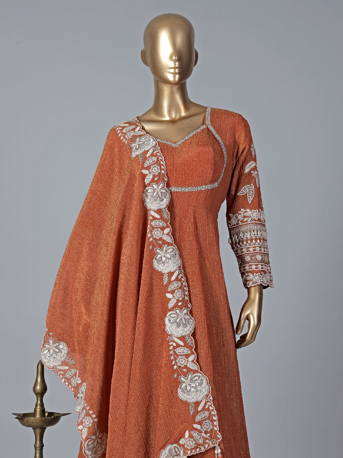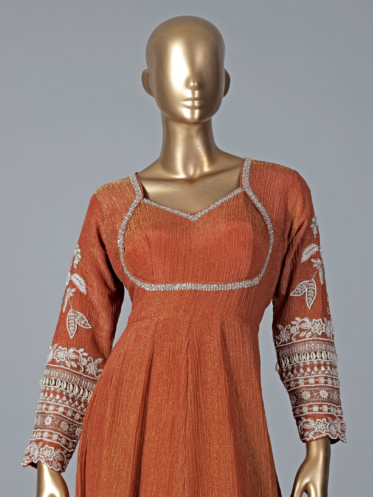 Dress up in this stunning floor length rust orange anarkali suit. It is enhanced with embroidery, sequins and beads work detailing, has a sweetheart neckline and full aleev pattern. It comes along with a dupatta.