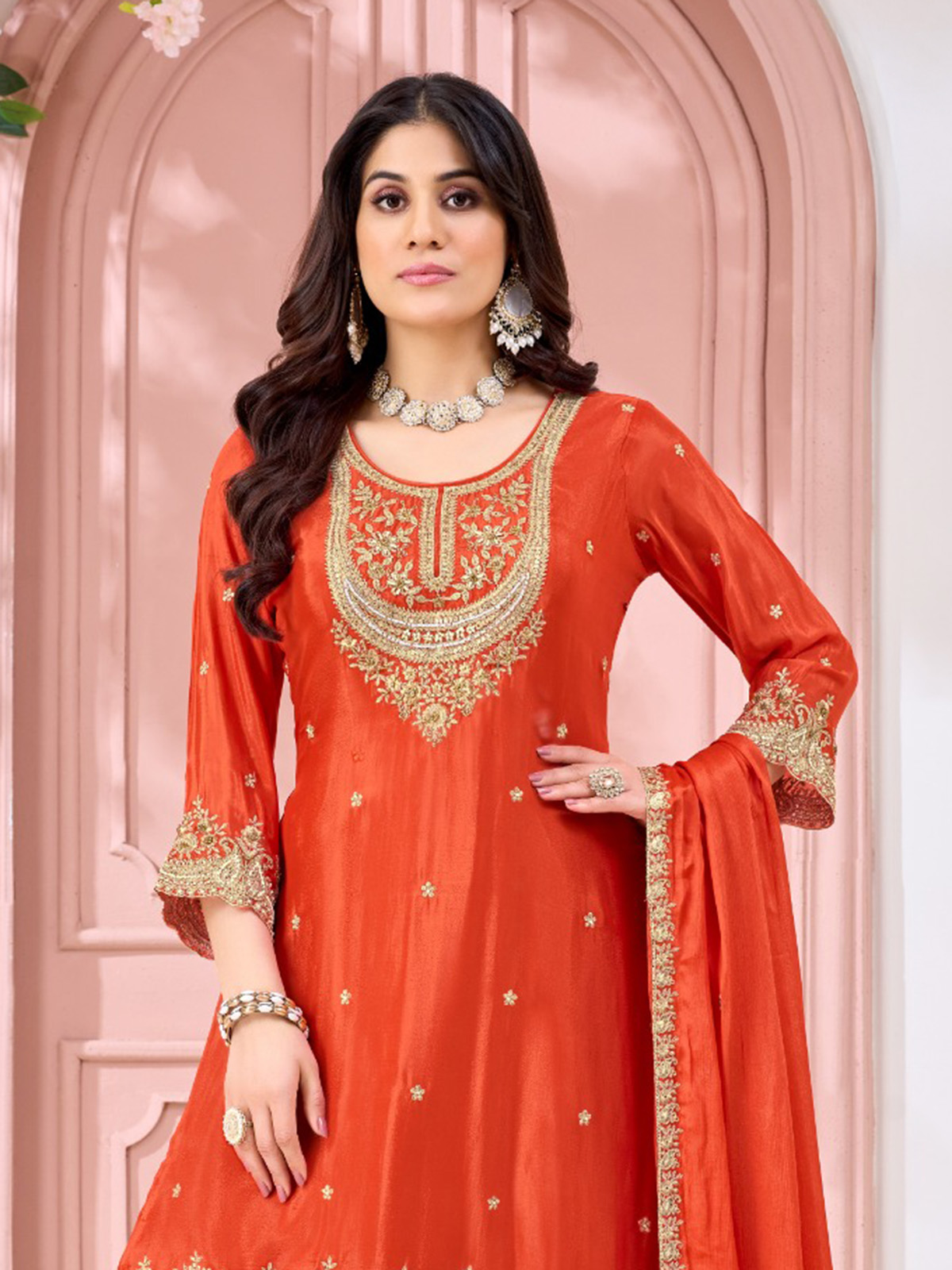 Warm festive tones define this rust orange silk pakistani style palazzo suit. The kurti features a refined round neckline with quarter sleeves and an elegant yoke design, beautifully adorned with cutdana, sequins, beads and resham work. Styled with flowing palazzo pants and a graceful dupatta, the ensemble creates a vibrant ethnic look perfect for weddings, receptions and sangeet celebrations.