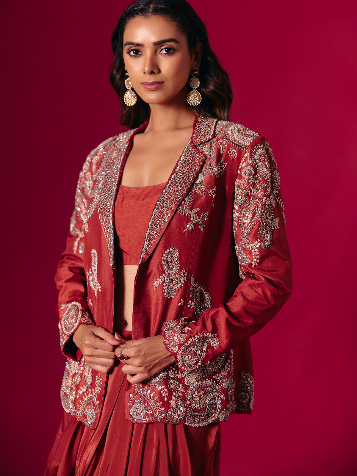 A fusion of strength and elegance, this rust red satin silk indo-western suit dazzles with zardosi, sequins, and beadwork. The jacket-style silhouette defines royal grandeur—perfect for receptions and wedding celebrations where tradition meets a bold, modern spirit.