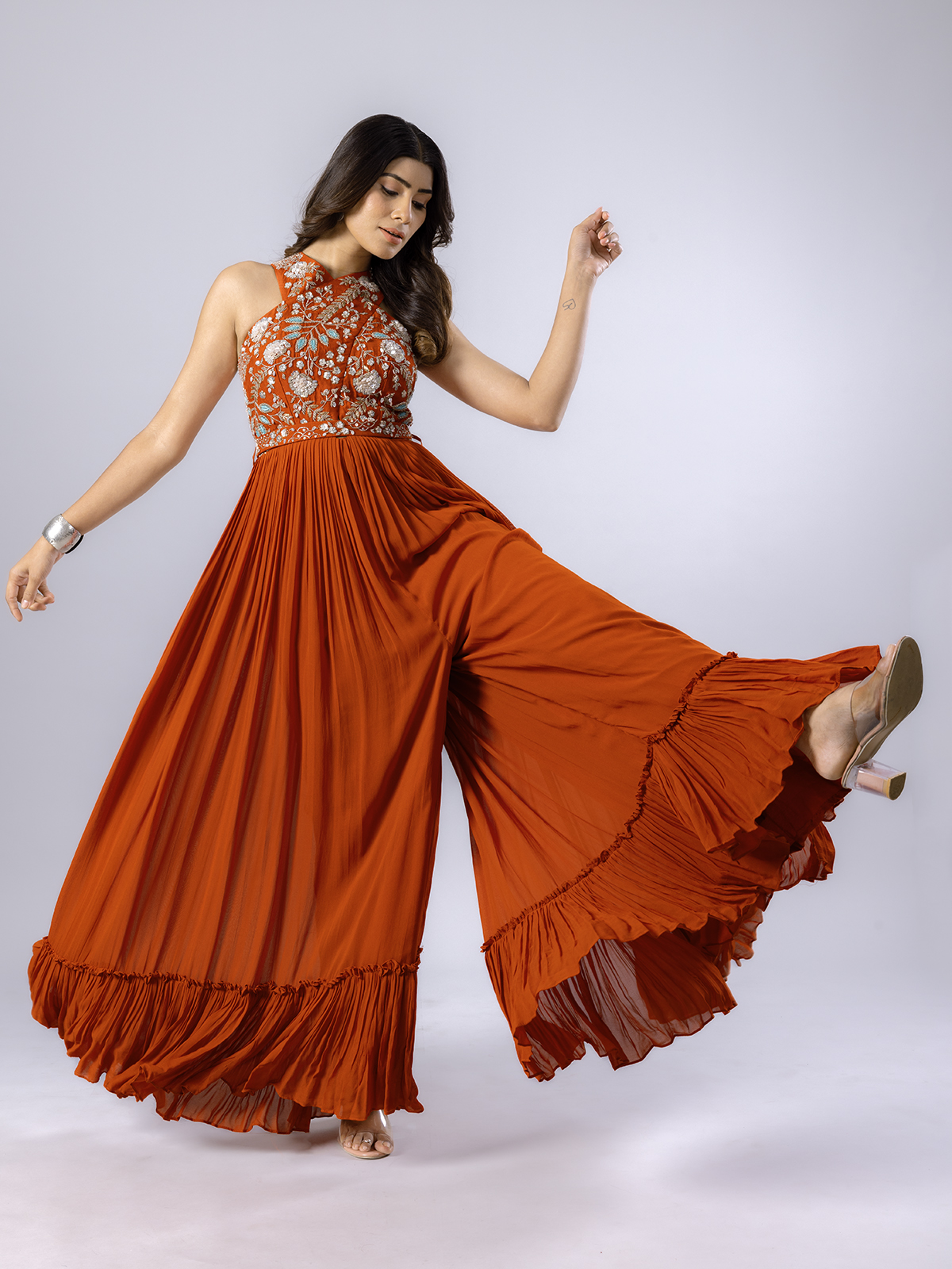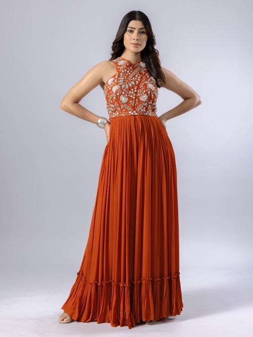 Embrace festive elegance with this rust red georgette palazzo suit, designed to make you shine. Embellished with resham, cutdana, sequins, thread, and bead work, it reflects celebratory charm. Styled in a sleeveless pattern for modern appeal, this ensemble is perfect for festive gatherings, offering comfort and timeless sophistication in one.