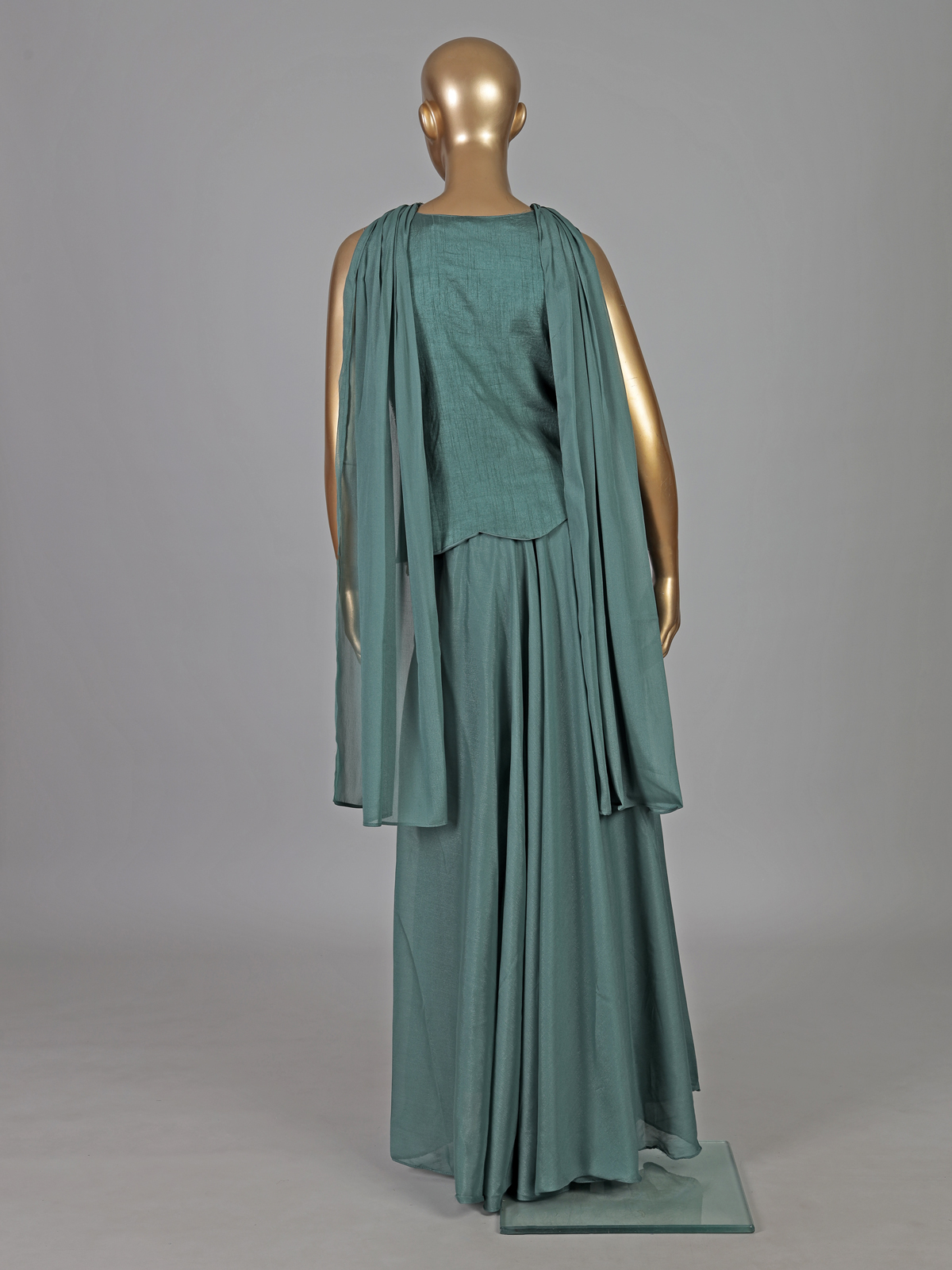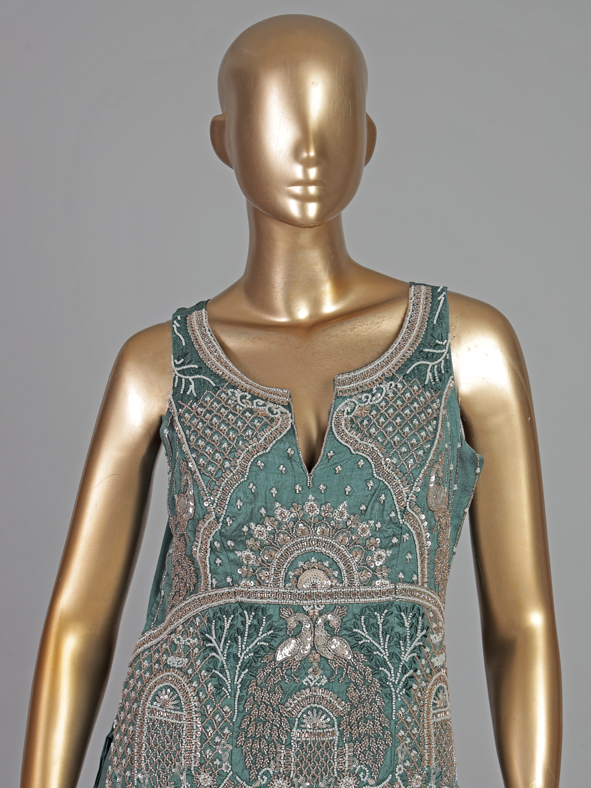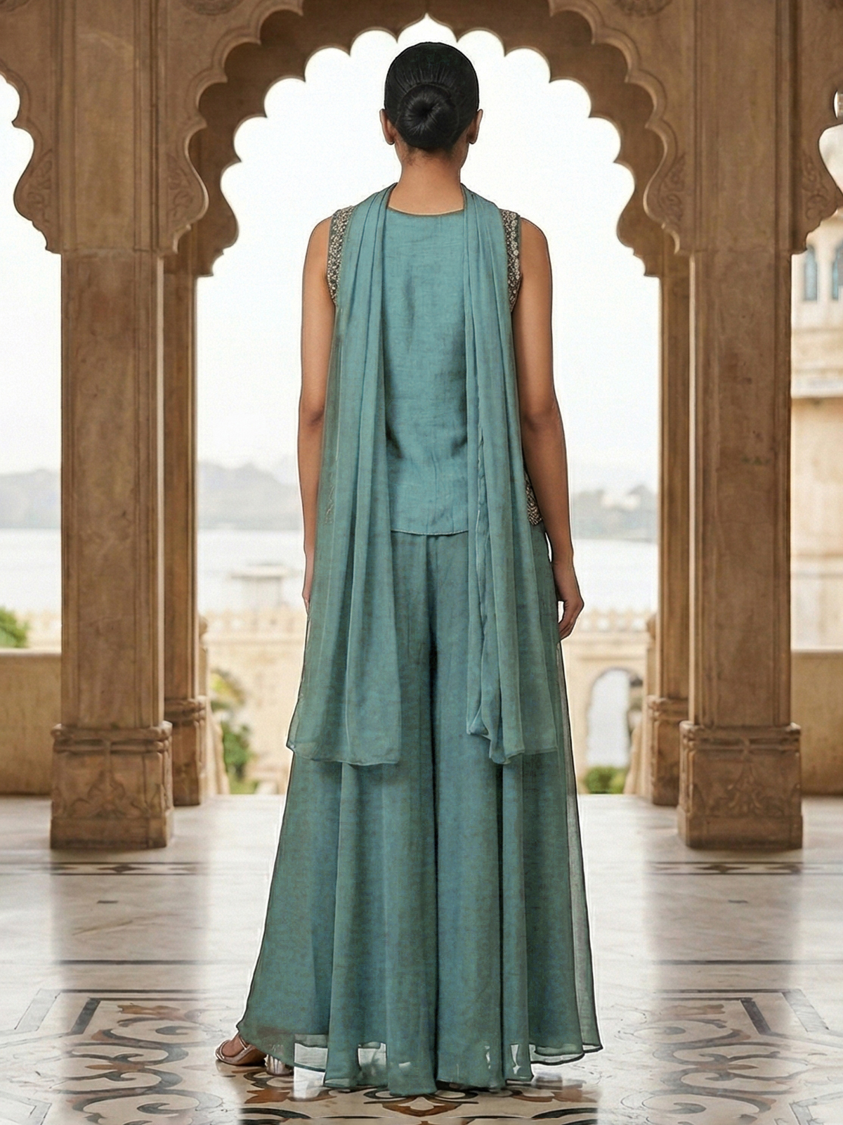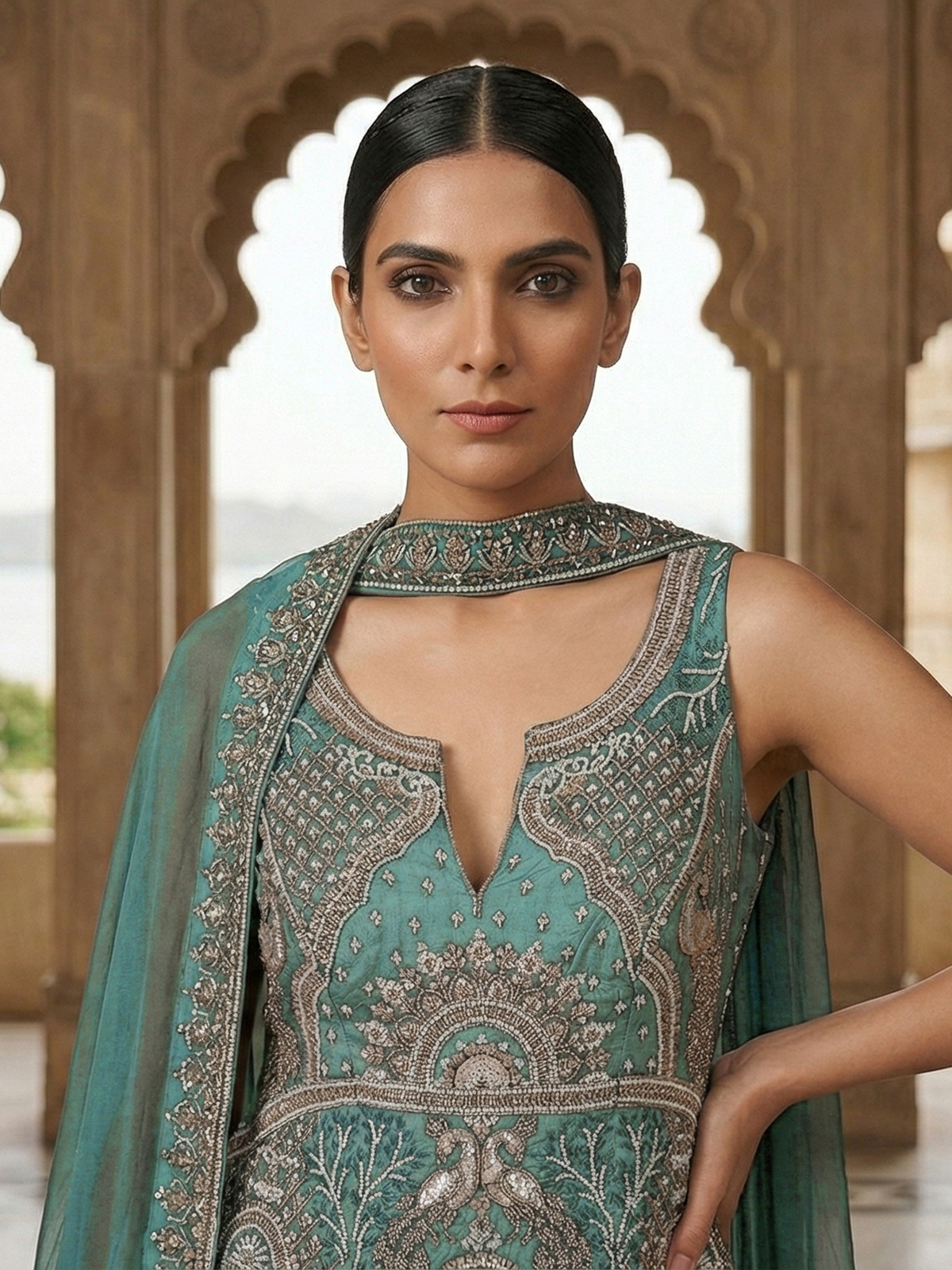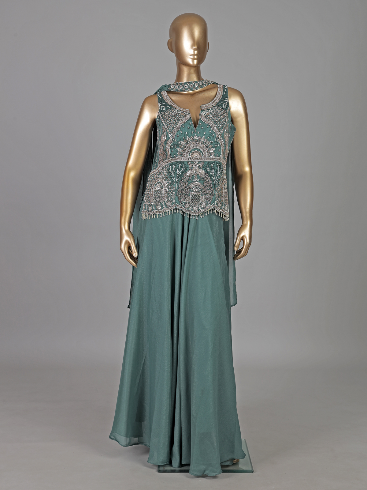 Elegant sage green tones define this silk palazzo suit crafted for refined occasions. Embellished with cutdana, sequins, beads, pearls and thread work. It radiates subtle luxury. The sweetheart neckline and sleeveless silhouette enhance its graceful appeal. Paired with a dupatta. This outfit is ideal for weddings and sangeet celebrations.