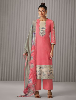 Salmon Pink Printed Cotton Salwar Suit For Women