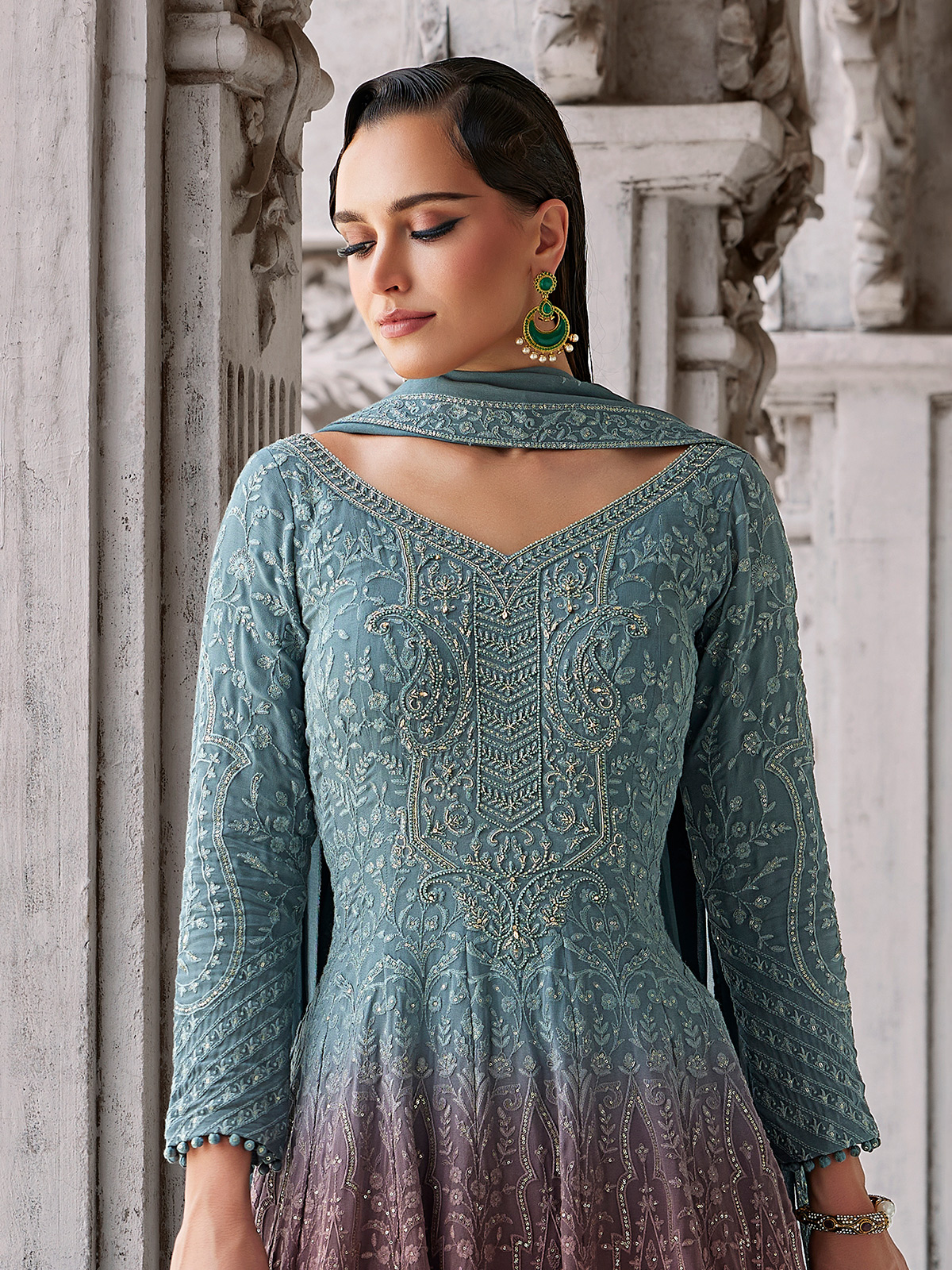 A shaded wine and blue Pakistani-style georgette palazzo suit adorned with embroidery, sequins, beads, zardosi, stone and cutdana. The V neckline and quarter sleeves add elegant depth, paired with a dupatta and palazzo suitable for weddings, receptions and festive nights.