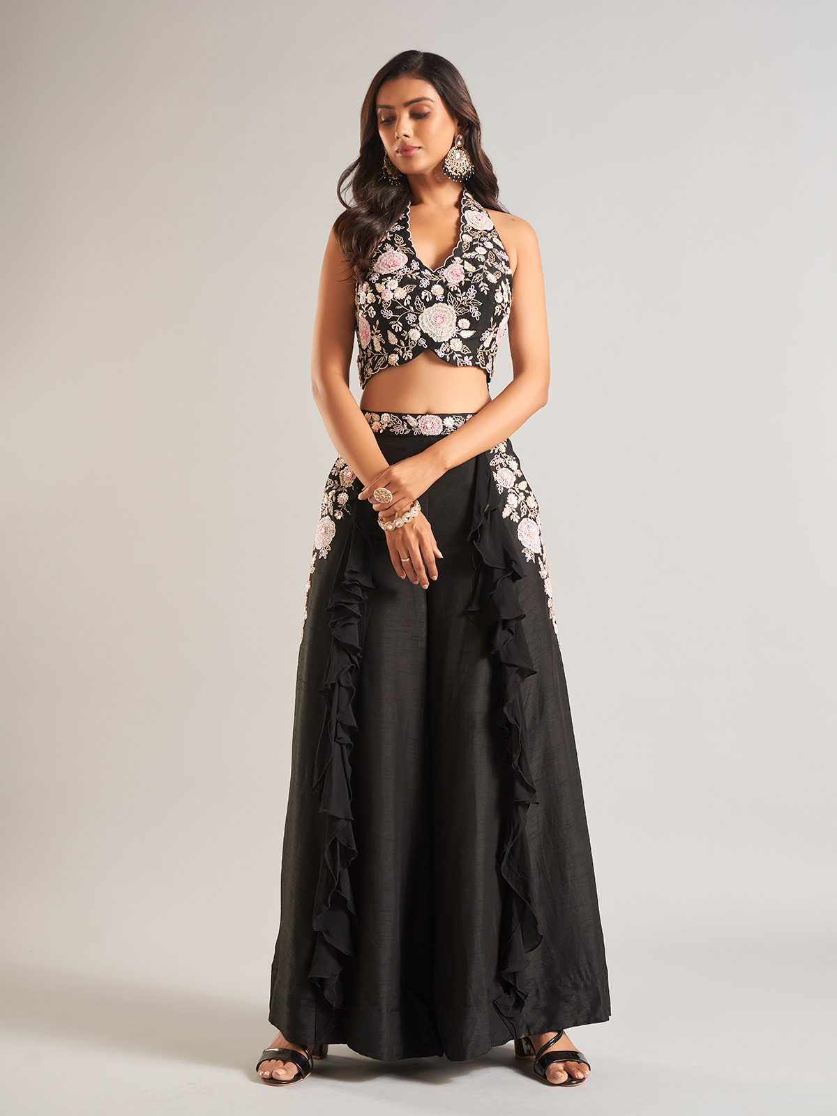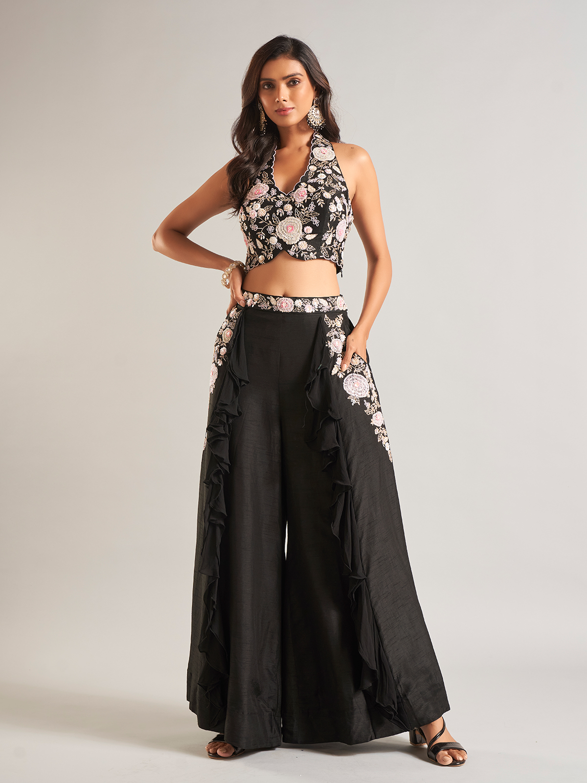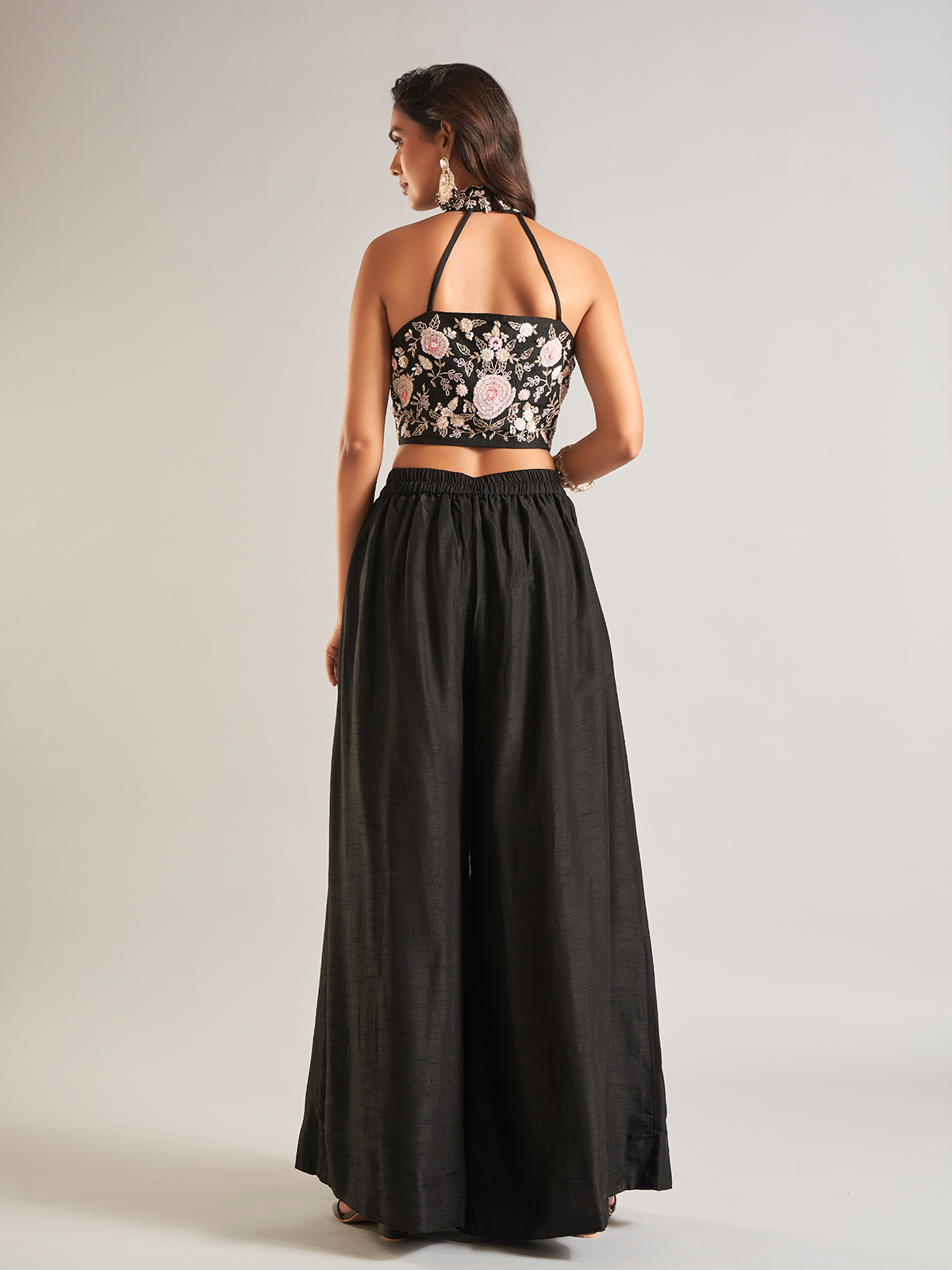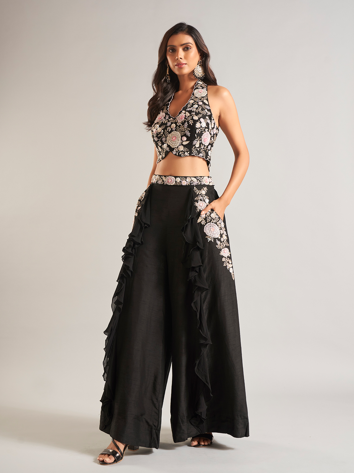 Opt for timeless elegance in our black silk palazzo salwar suit. Adorned with exquisite cutdana, beads, sequins and thread work design. The V neck and sleeveless pattern design lend a modern edge.