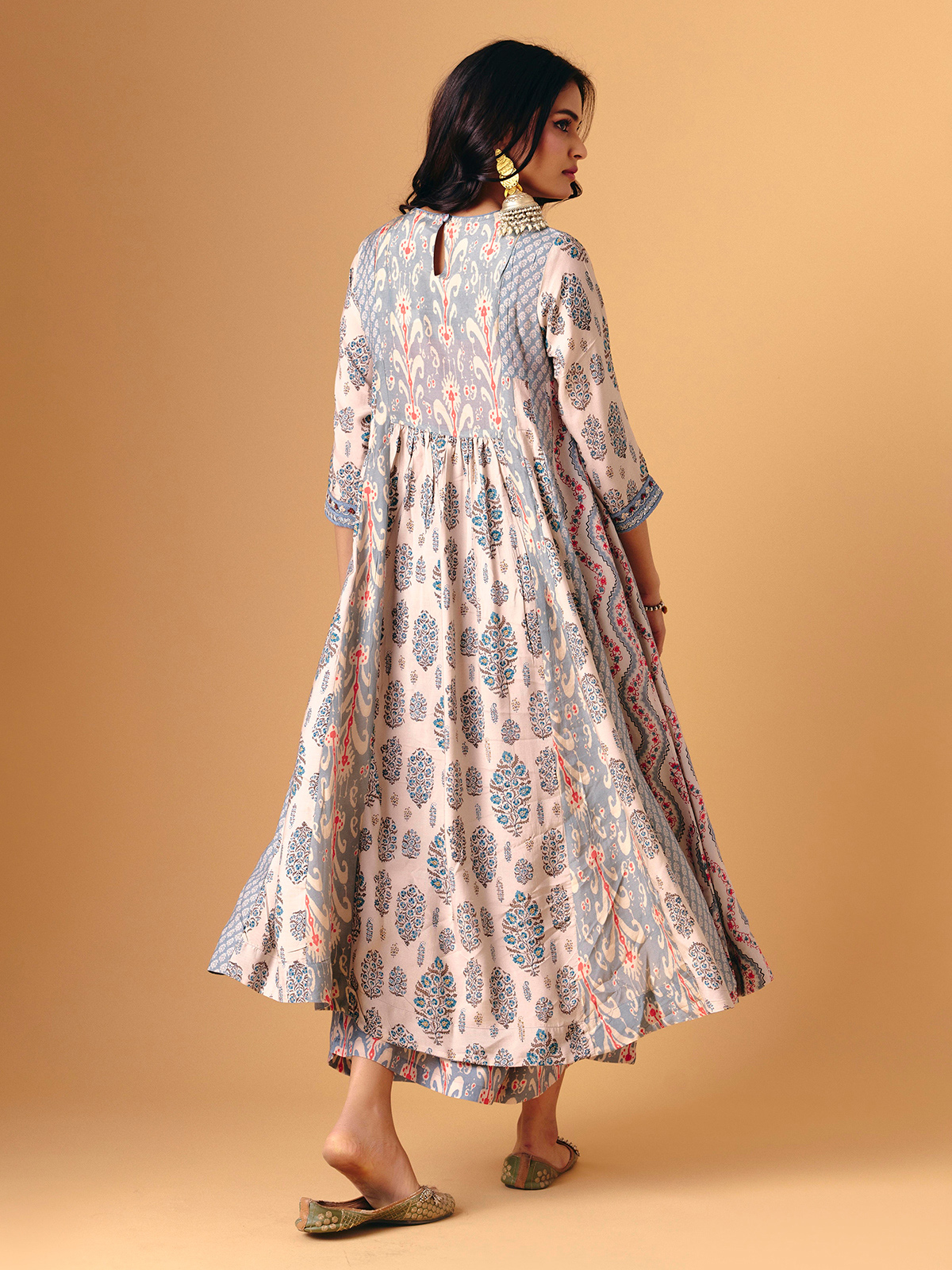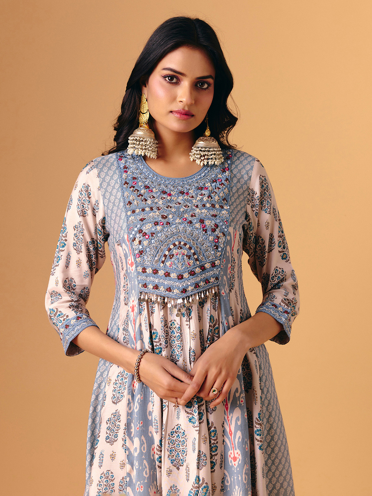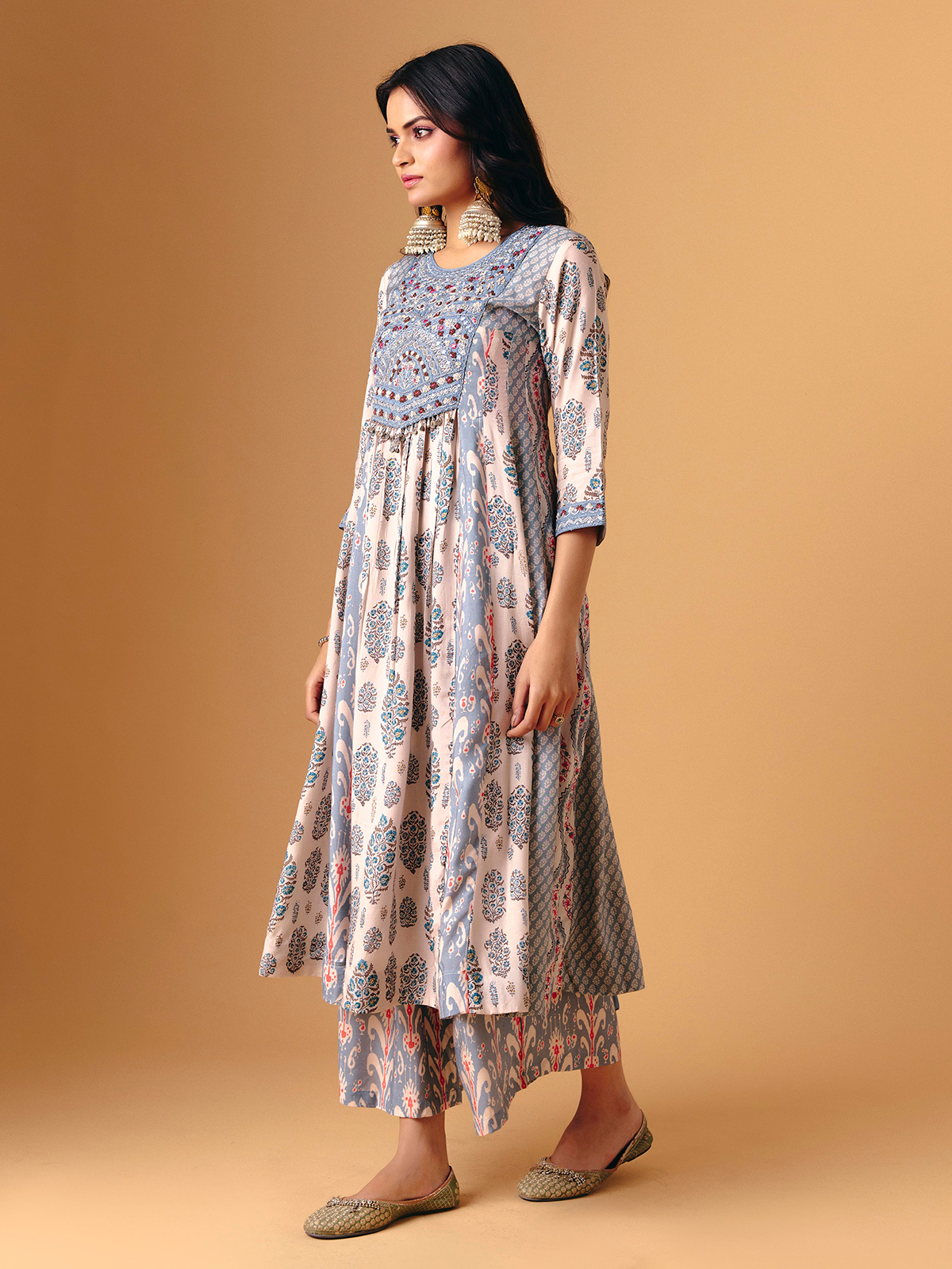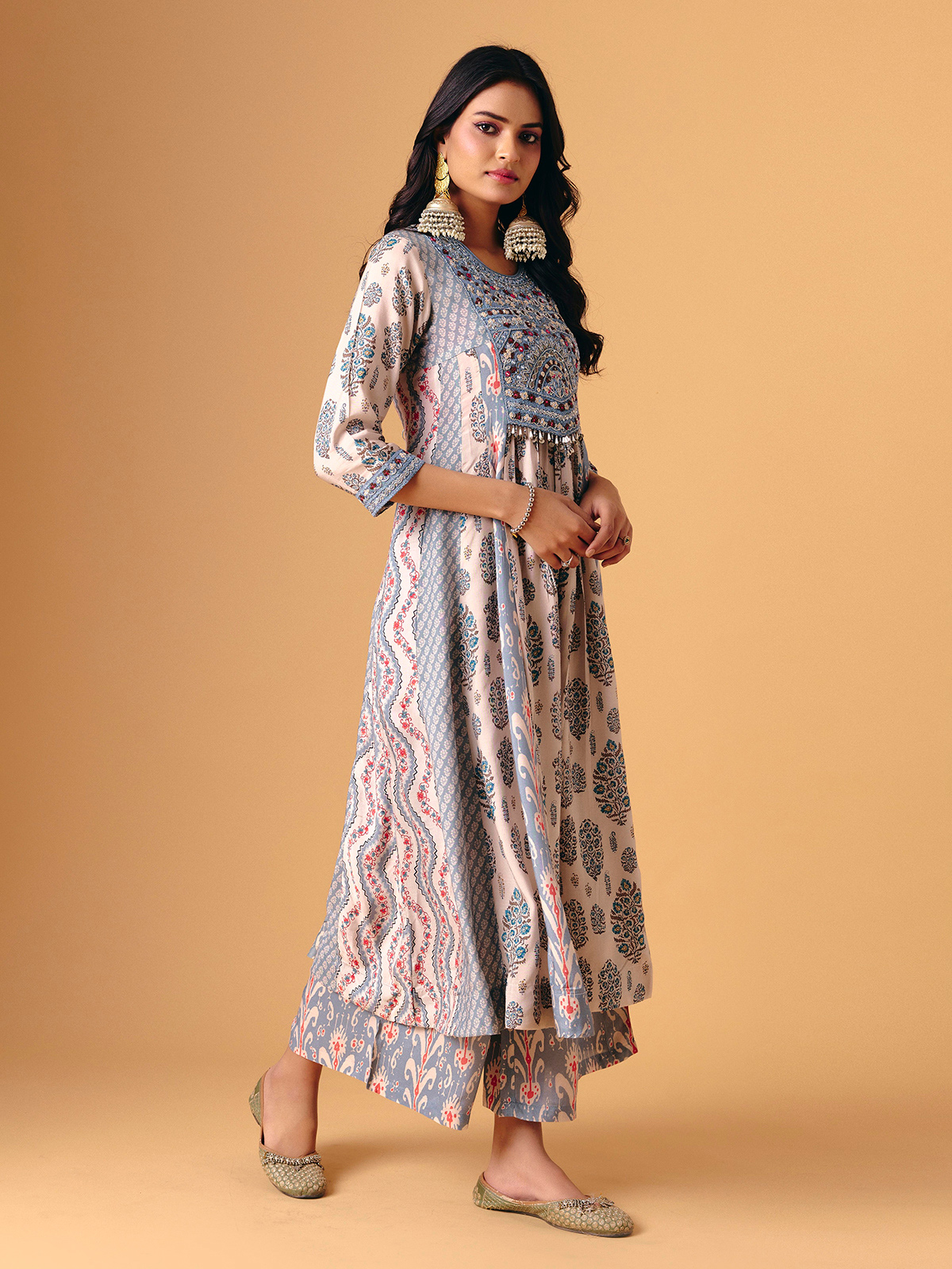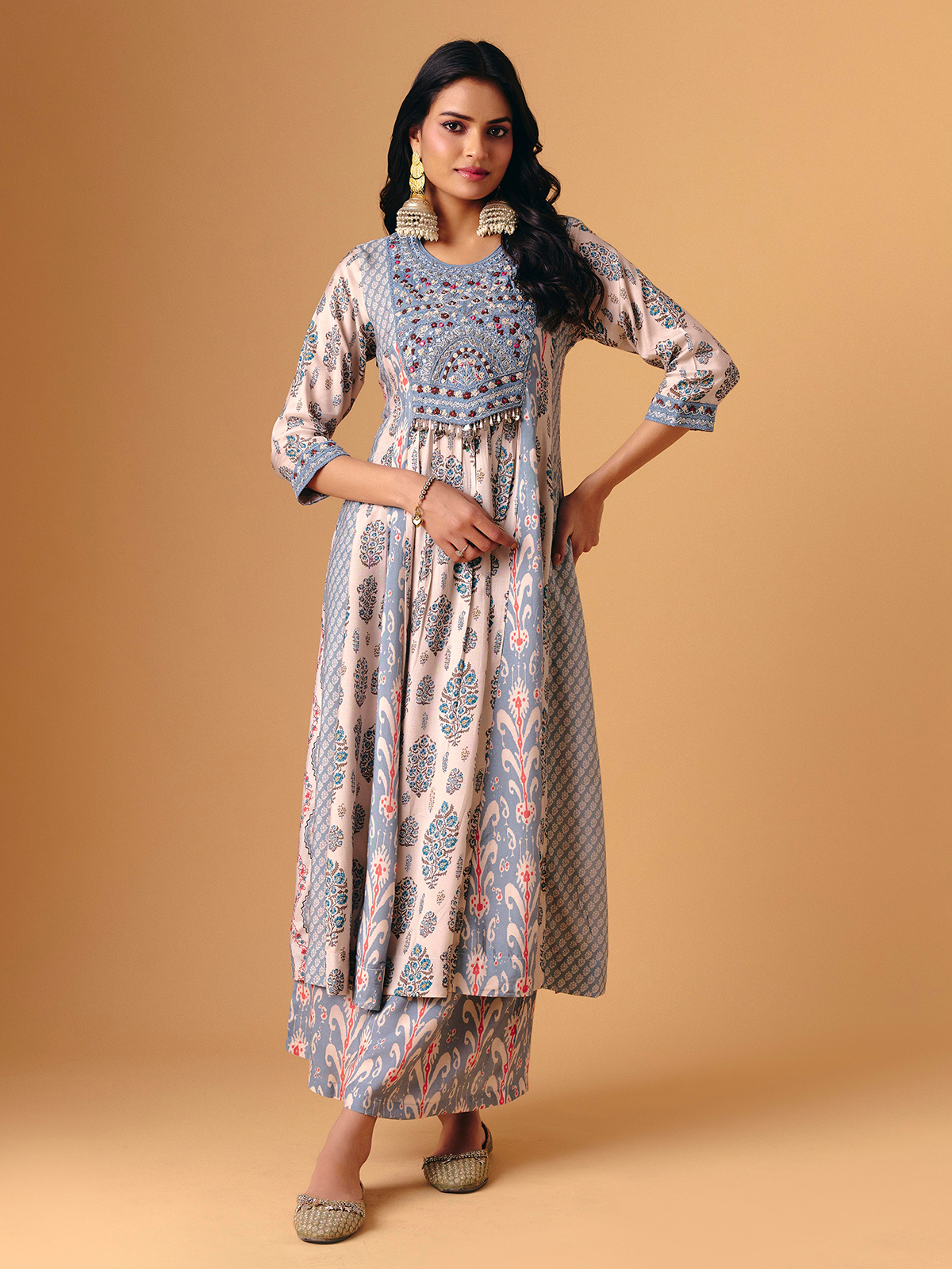 Soft sky blue cotton silk defines this palazzo suit, adorned with aabla, beads, sequins, embroidery, and zardosi detailing. Round neckline and quarter sleeves add classic elegance, while flowing palazzo bottoms enhance graceful movement. Finished with a matching dupatta, it exudes handcrafted artistry, festive shimmer, and serene sophistication for sangeet, festive, and eid occasions.