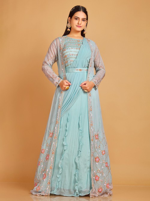 Dazzle in the captivating sky blue jacket style floor length suit, meticulously crafted in silk and adorned with sequins, cutdana and zardosi work. The sleeveless pattern, round neck, along with the attached drape, creates an alluring ensemble. The outfit is accompanied by a full sleeve shrug.