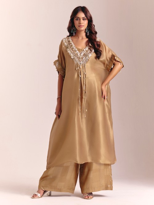In soft beige tissue silk, this kaftan-style palazzo set features mirror, cutdana, pearls, sequins, zardosi, thread and cowrie shell highlights. With a V-neckline and palazzo bottoms, it delivers a breezy, sophisticated festive charm.