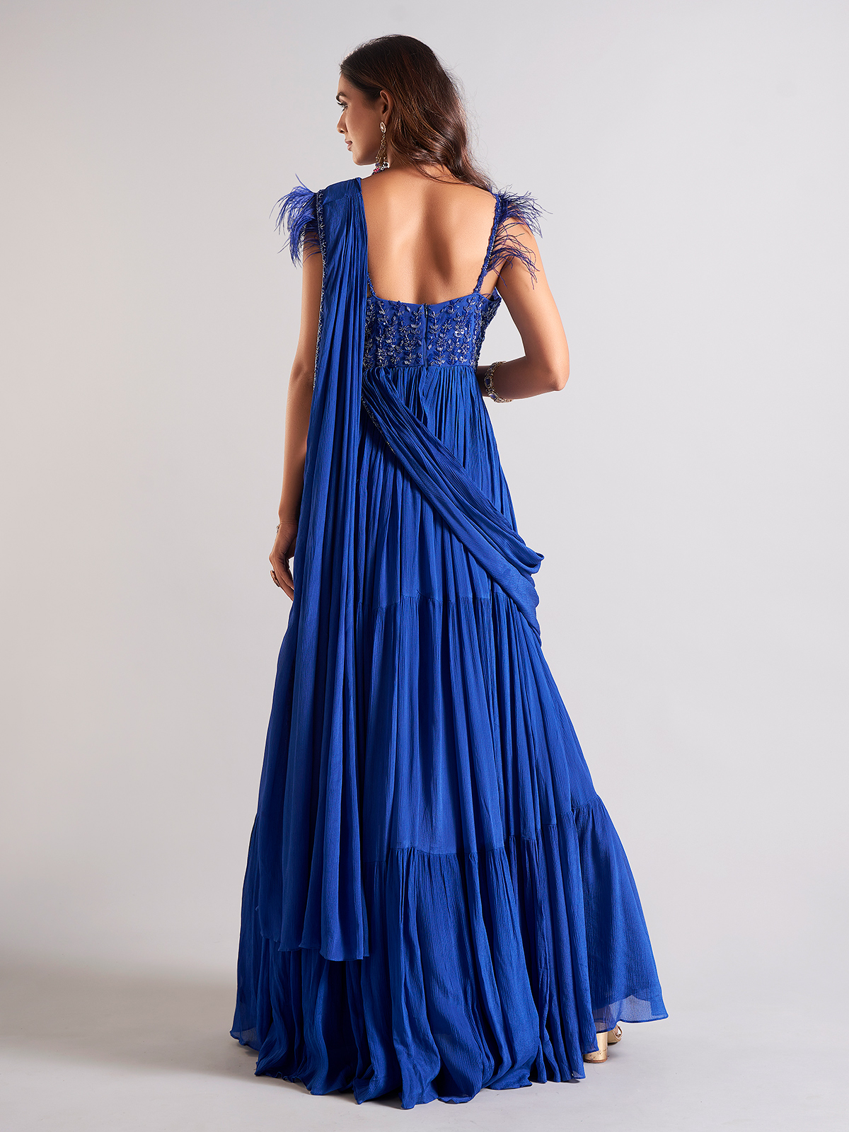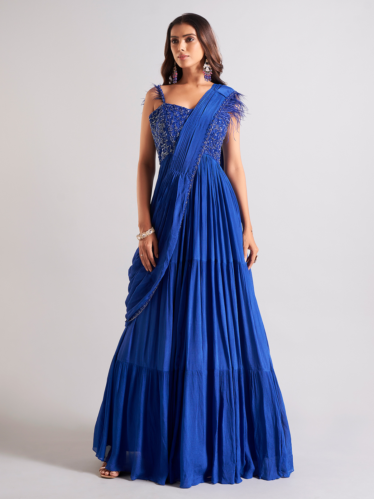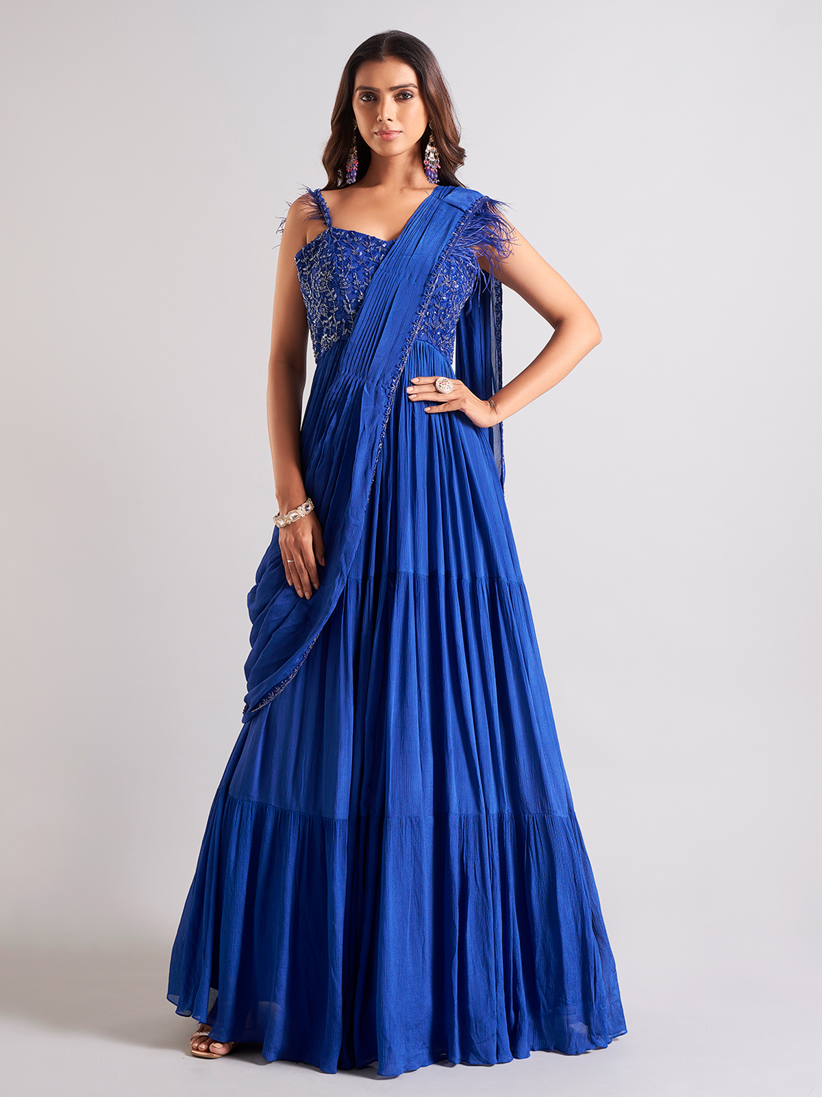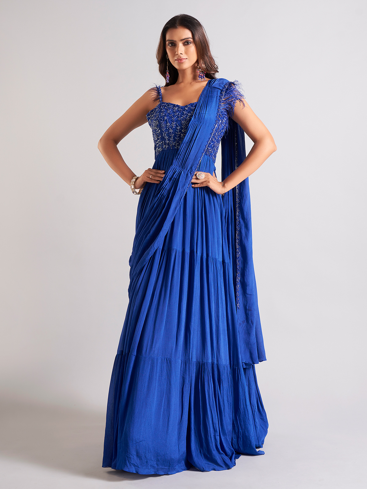Experience the trendy appeal of this blue georgette floor-length salwar suit with an attached dupatta. Featuring detailed cutdana, sequins, and beads work, it’s sure to impress.