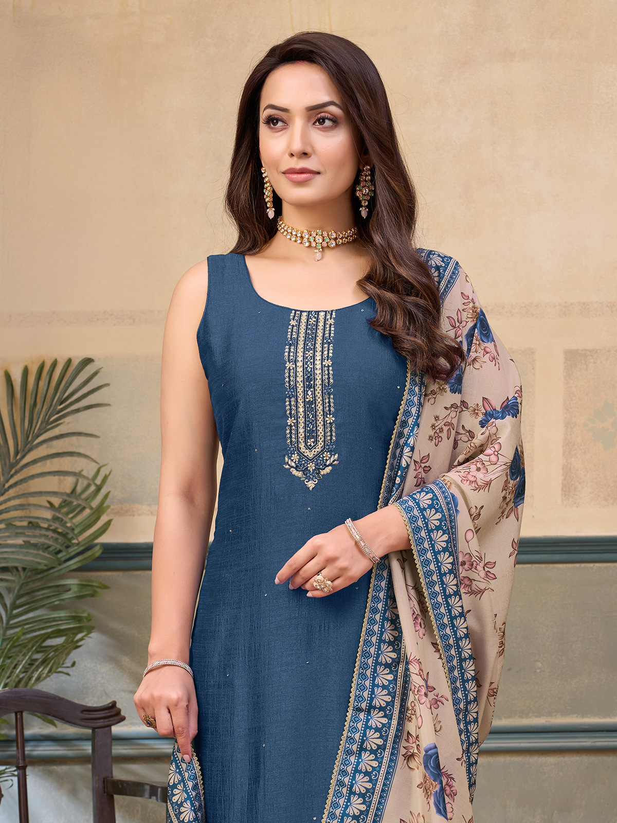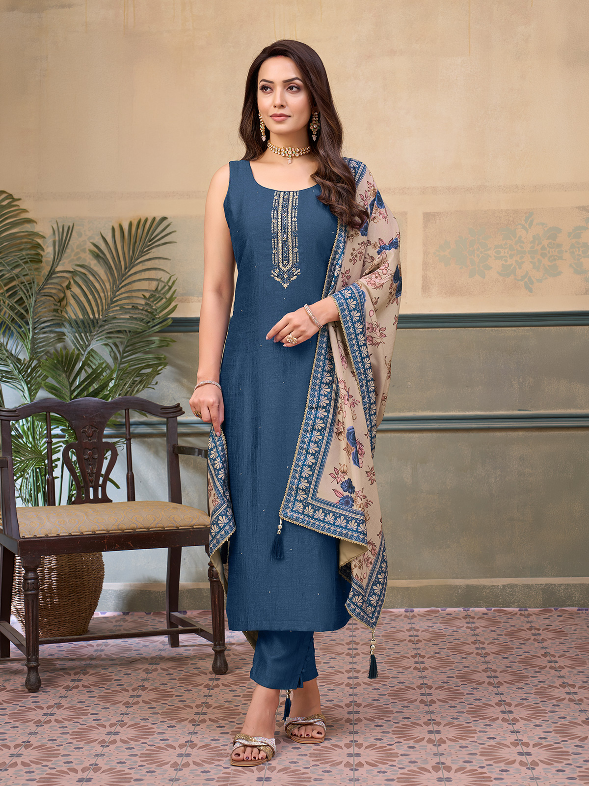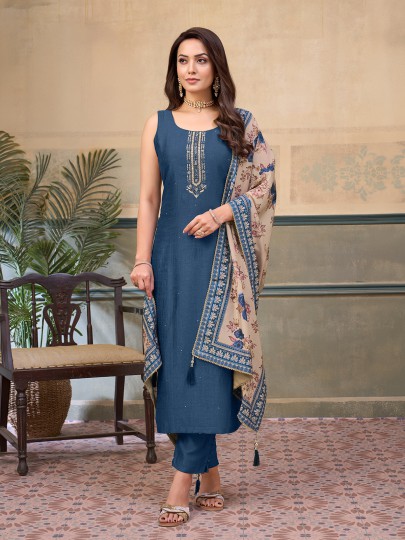 Soft stone blue tones bring subtle elegance to this silk straight cut salwar suit crafted for festive wear. Designed with a round neckline and sleeveless silhouette, the kurti is adorned with thread, bead, zardosi, sequin and mirror detailing that adds gentle shimmer. Styled with pants and a printed contrast dupatta, the ensemble creates a graceful and modern festive silhouette.