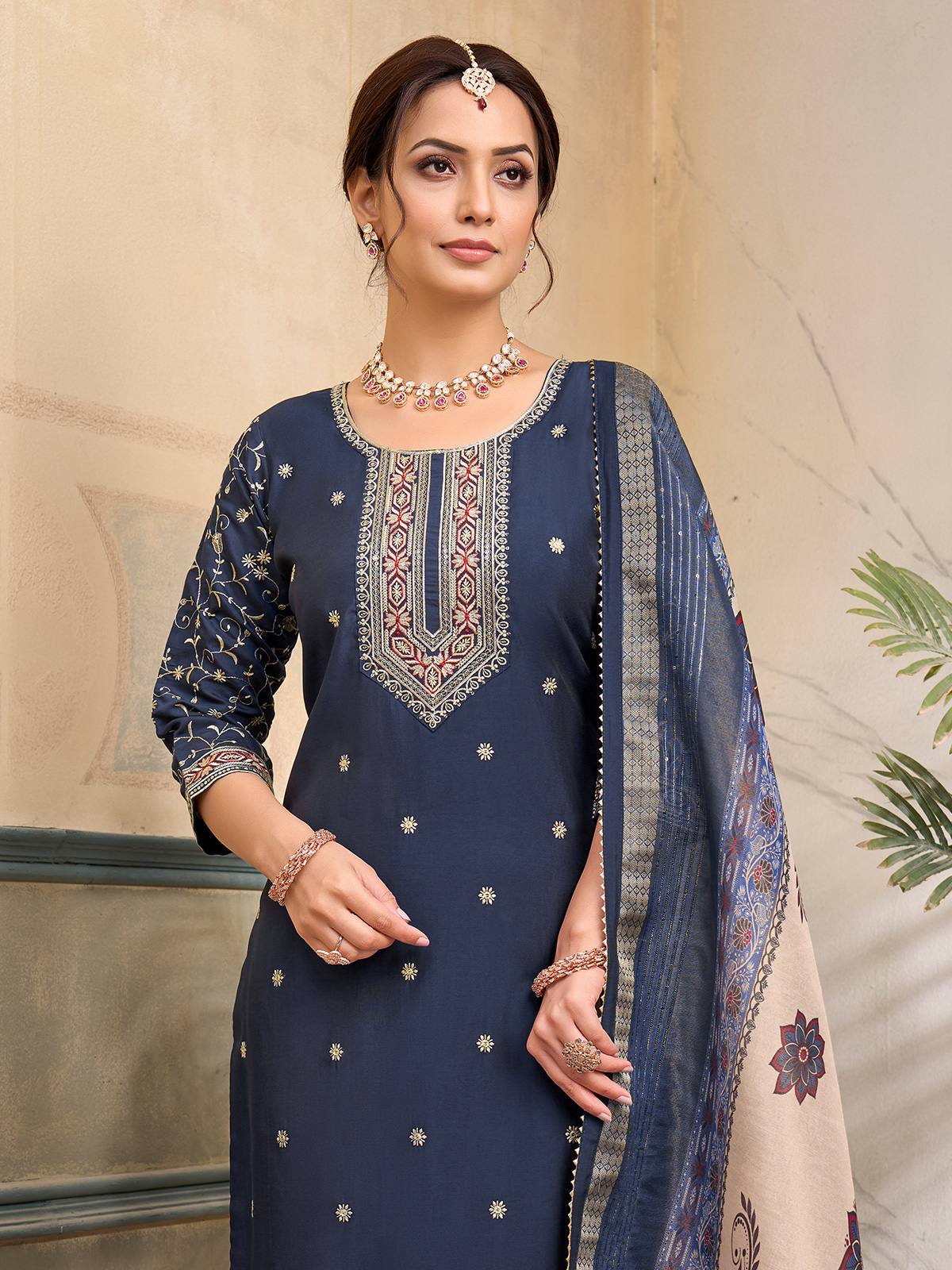 Stone Blue Silk Yoke Style Embroidered Festive Salwar Suit