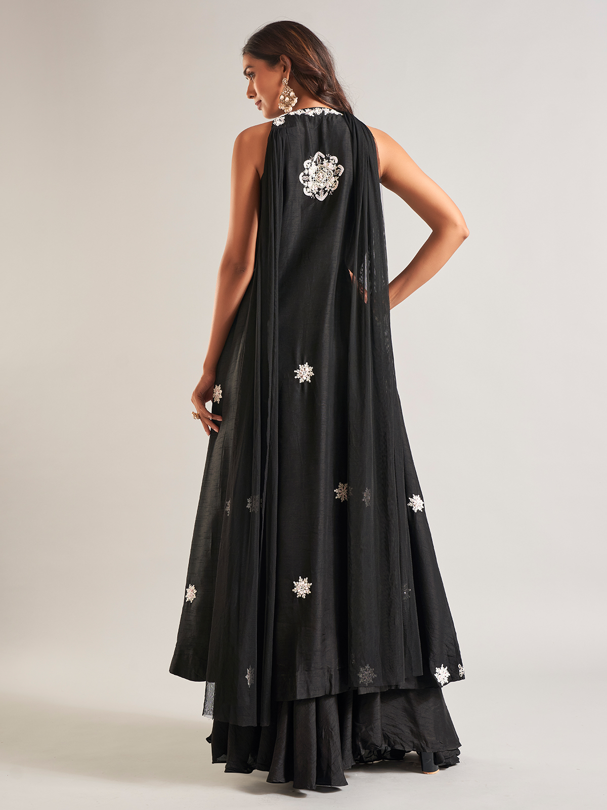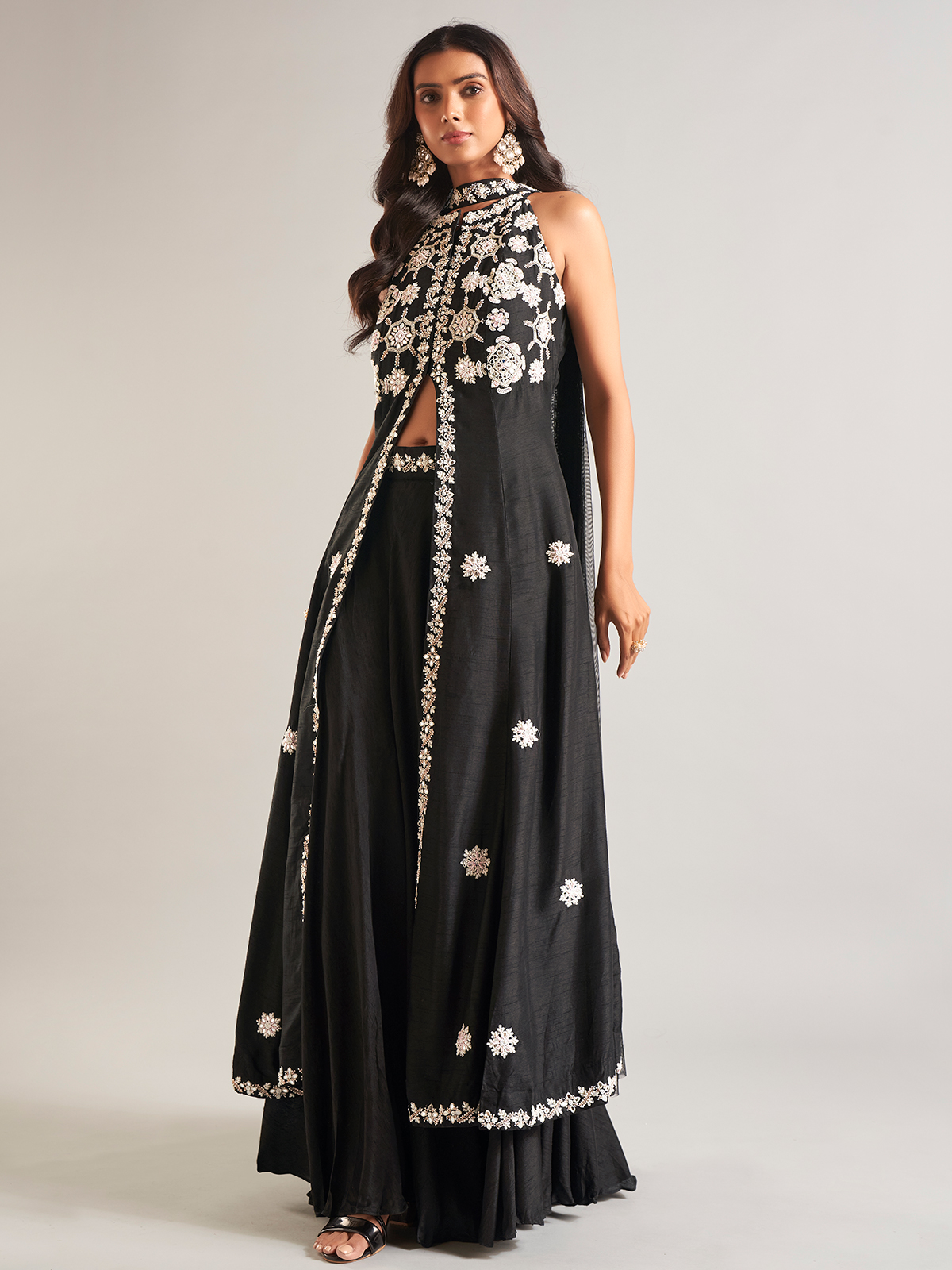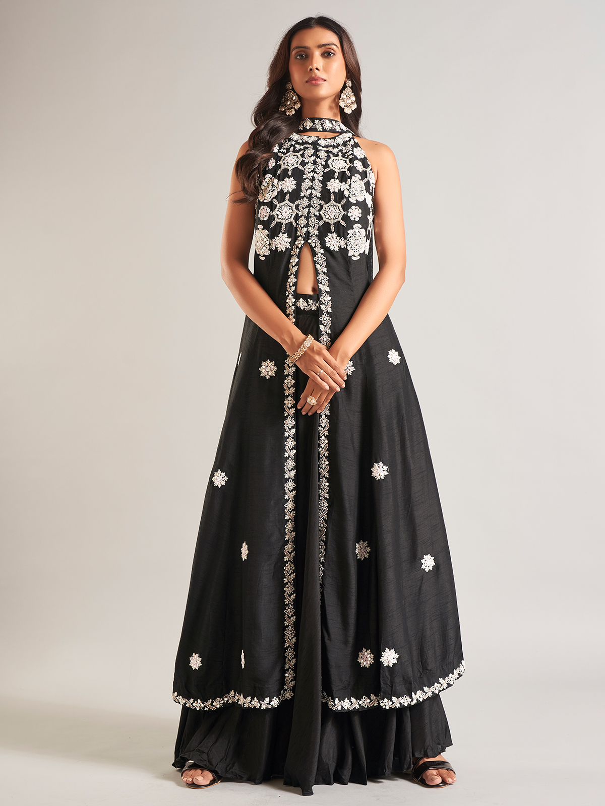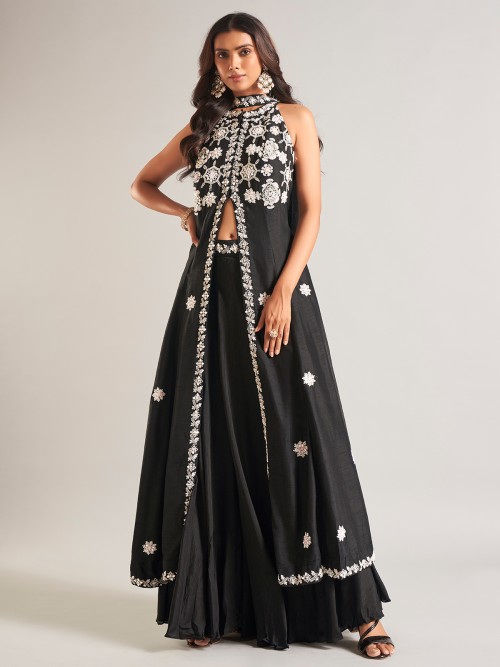 A striking black raw silk lehenga salwar suit, adorned with delicate mirror, zardosi, beads, cutdana, and resham work. Its classic sleeveless design adds to its allure. Comes paired with a matching dupatta.
