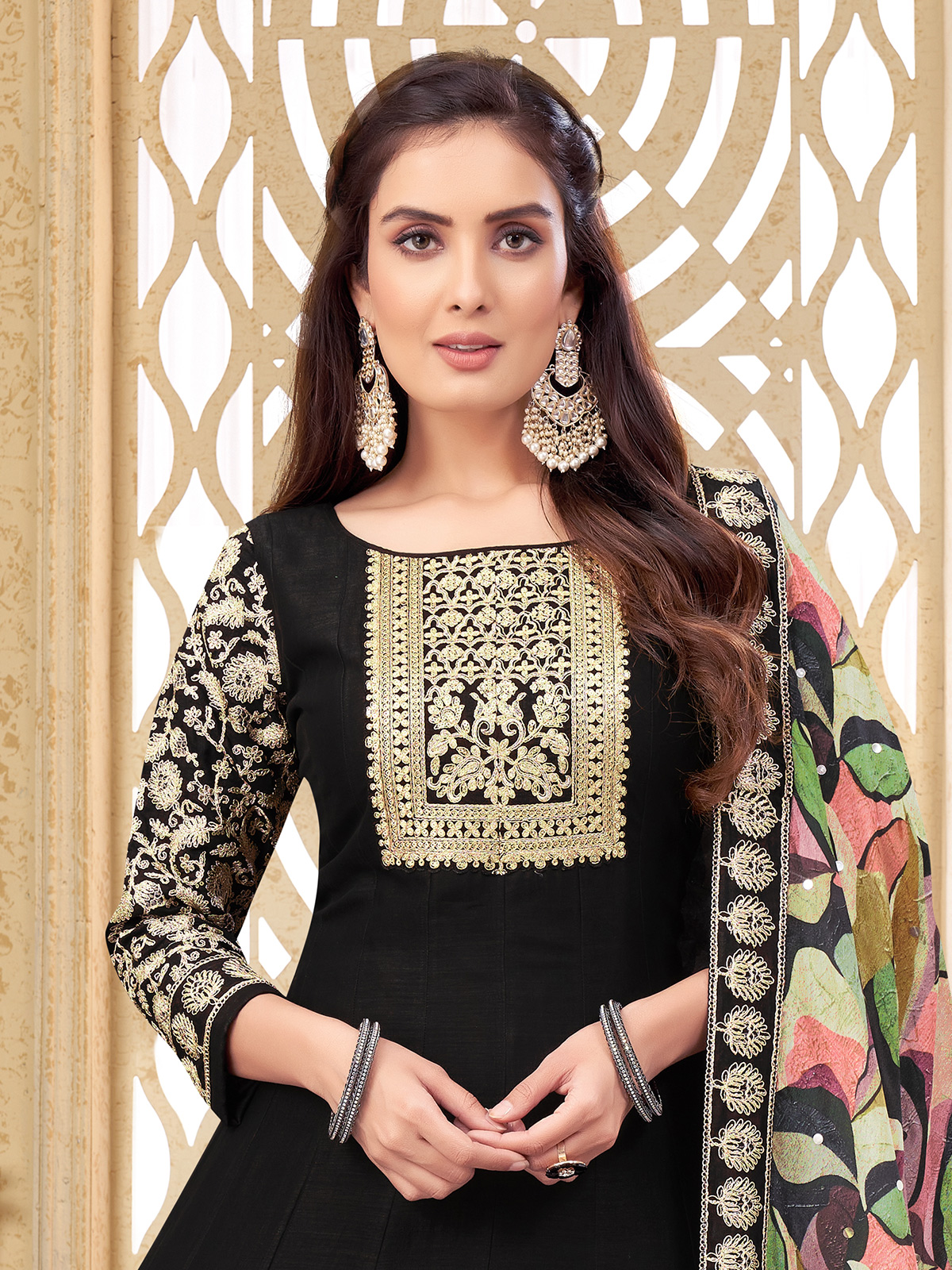 Enhance your style with this captivating black silk salwar suit. Adorned with sequins and resham work, it features a round neckline and quarter sleeves. Complete with a matching dupatta, it’s the perfect addition to your wardrobe.