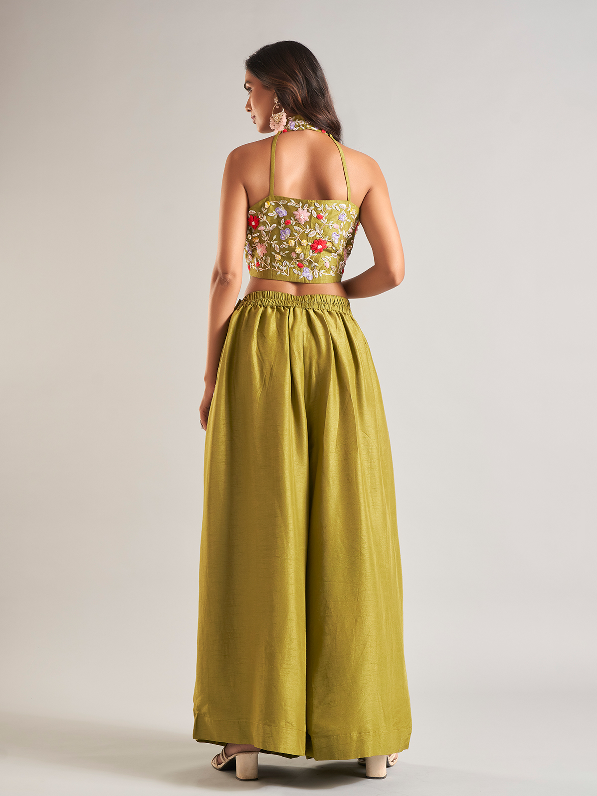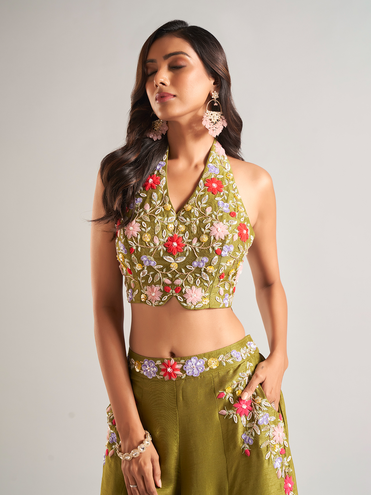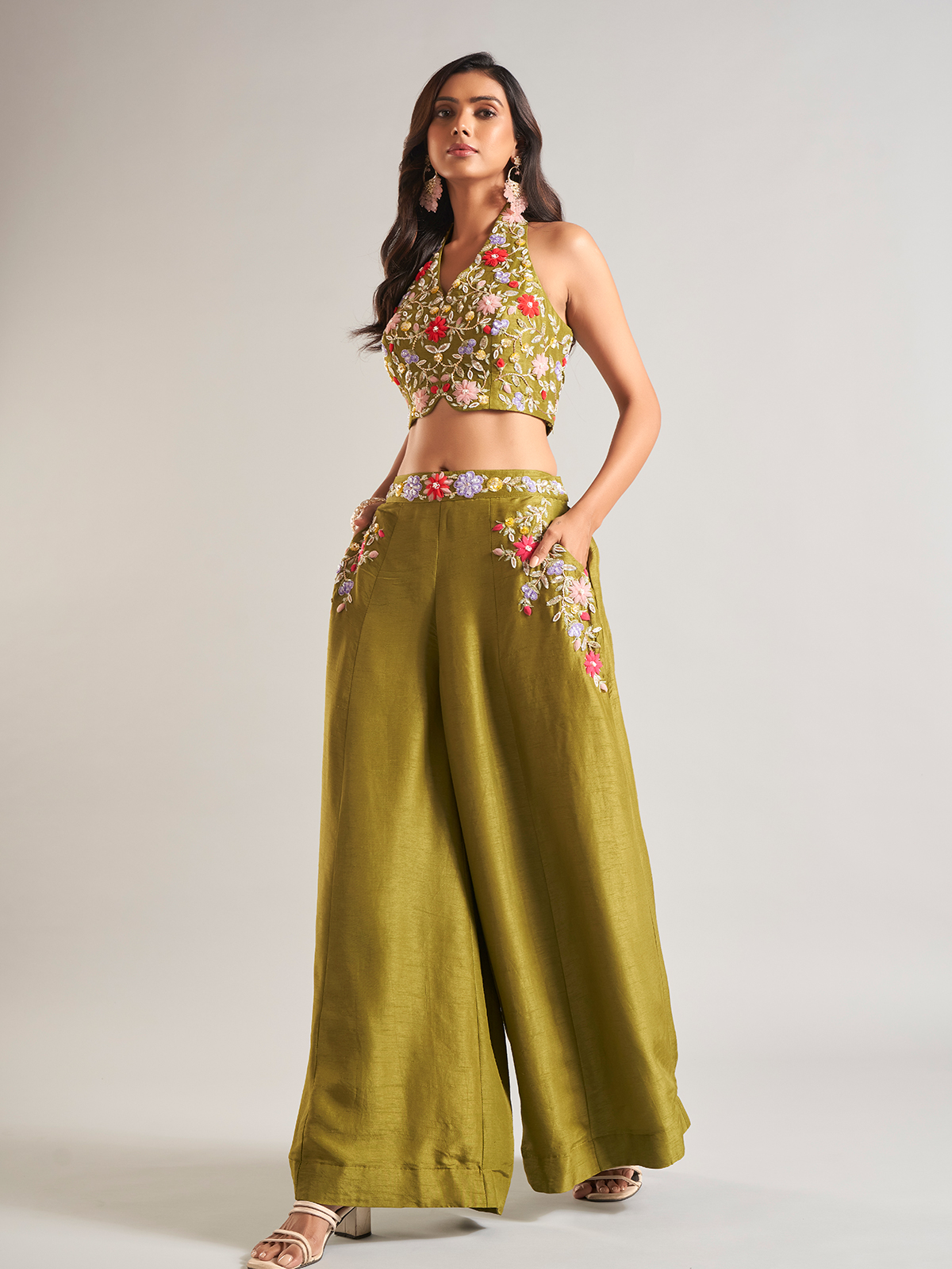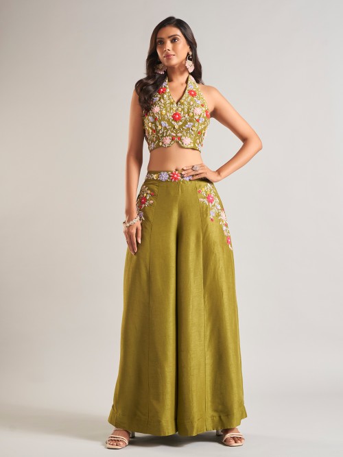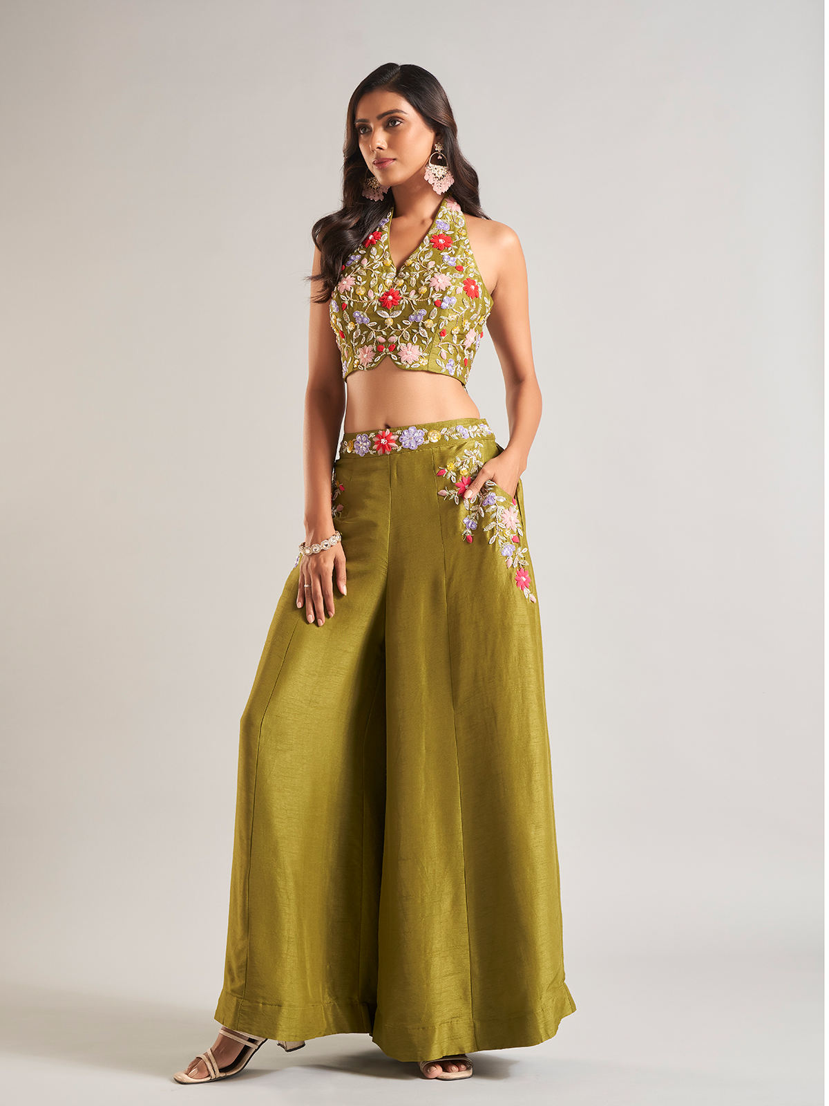 Whether it is a traditional celebration or a wedding day out, you will look stylish best in this dazzling olive silk palazzo salwar suit. Enhanced with cutdana, beads, sequins and zardosi work, it has a V neck and sleeveless pattern.