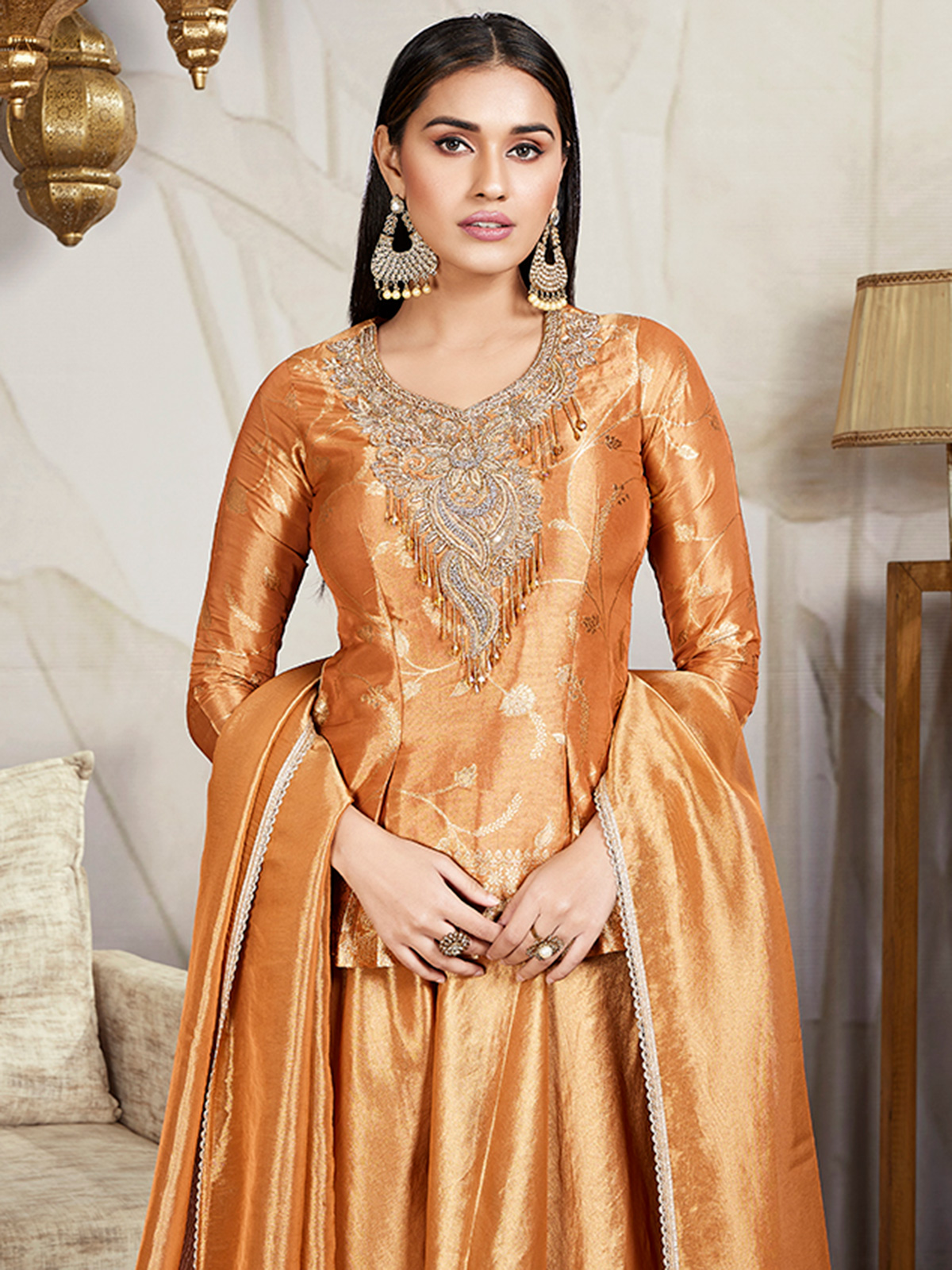 Add a touch of enchantment to your wardrobe with this orange silk palazzo suit. Adorned with cutdana, sequins, beads, zari, and thread work, it creates a captivating and vibrant appearance.