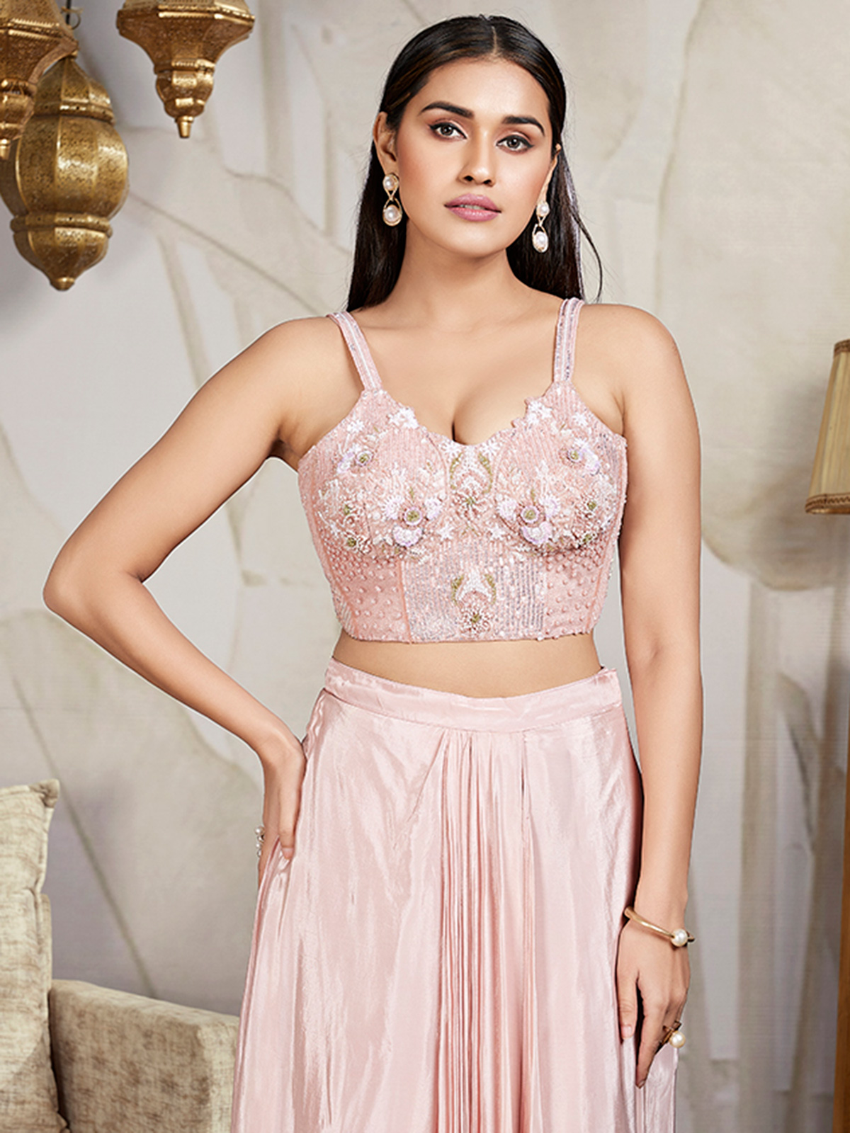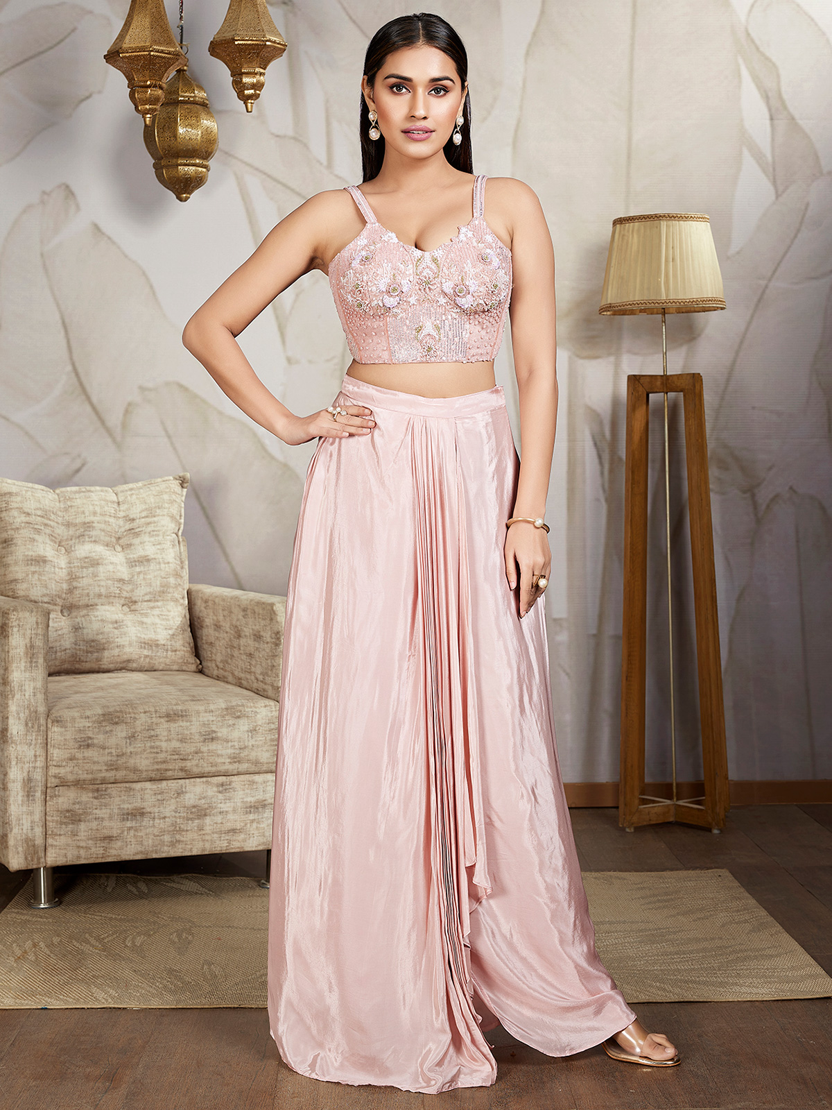 Perfect for festive events, this peach satin indo-western suit showcases intricate cutdana, sequins, beads, and thread work. Its sleeveless design makes it a chic choice for special occasions.