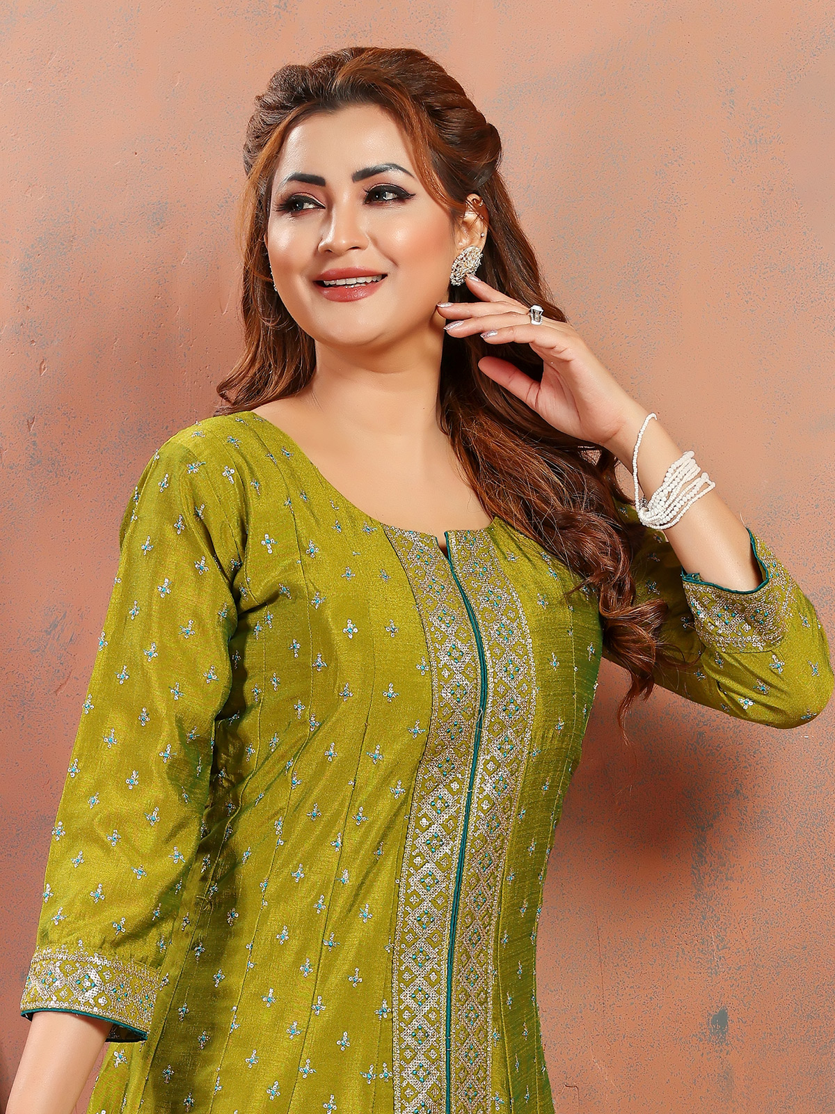Discover the charm of our olive silk salwar suit, perfect for festive occasions. Adorned with resham, sequins and zari work, the ensemble boasts an attractive round neck and quarter sleeves pattern. Complete with a dupatta.