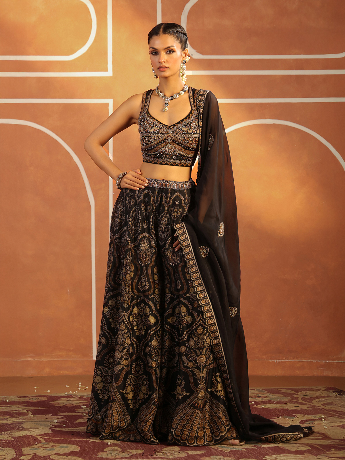 Draped in midnight elegance, this black silk printed palazzo suit comes with a sleeveless sweetheart neckline choli and flowing dupatta. Adorned with sequins, beads, and thread work, it radiates subtle shimmer. Perfect for weddings and festive gatherings, the ensemble blends bold beauty with refined sophistication.