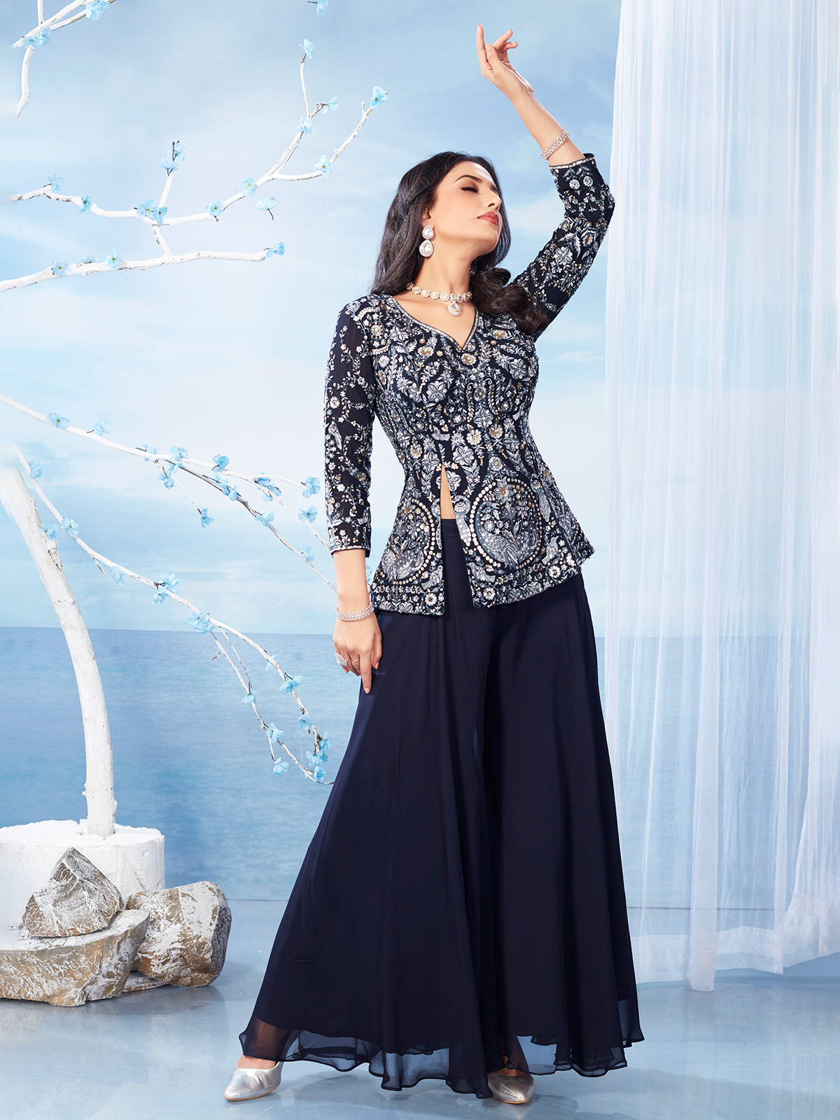 The navy georgette palazzo salwar suit shines with intricate embroidery, sequins, mirror, and stone work. Styled with a V-neckline and quarter sleeveless design, it blends festive radiance with refined charm, making it a showstopping choice for wedding functions and celebratory evenings.
