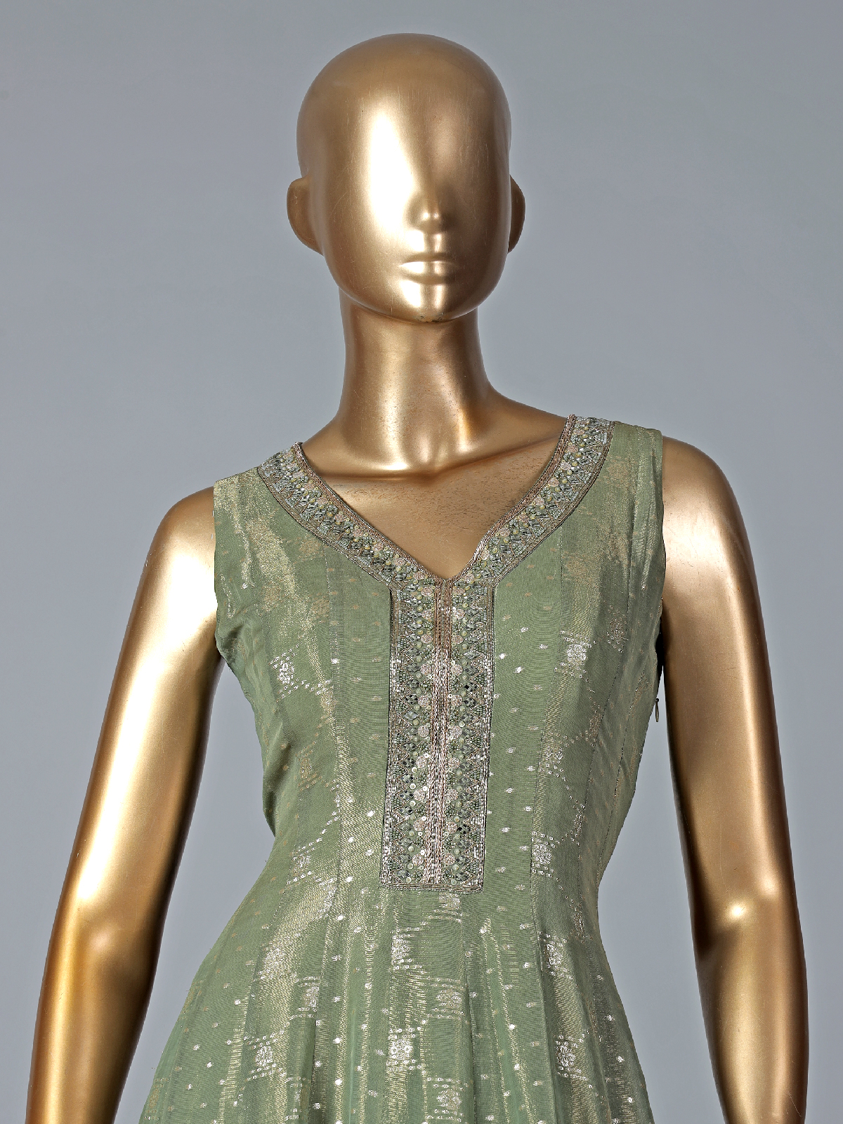 Stylish look in this sage green anarkali suit in silk for wedding. Decorated with mirror, resham, sequins, zardosi, beads and zariwork. It comes in V neckline and sleeveless pattern. It comes with a matching dupatta.