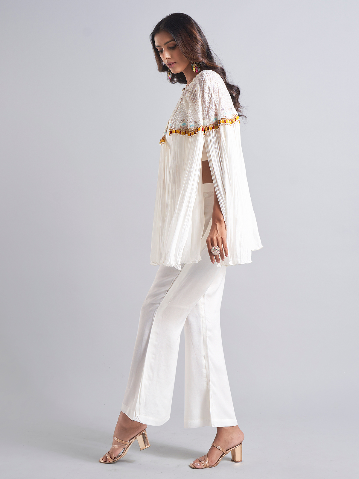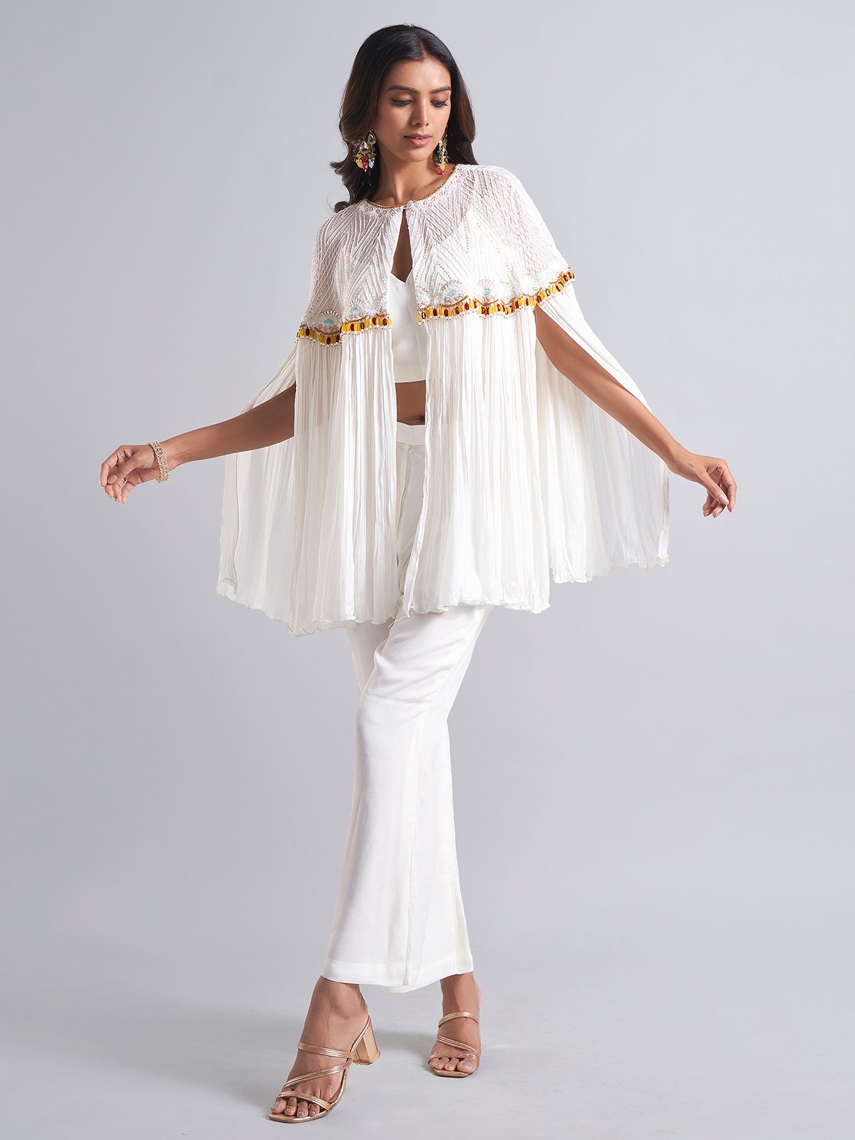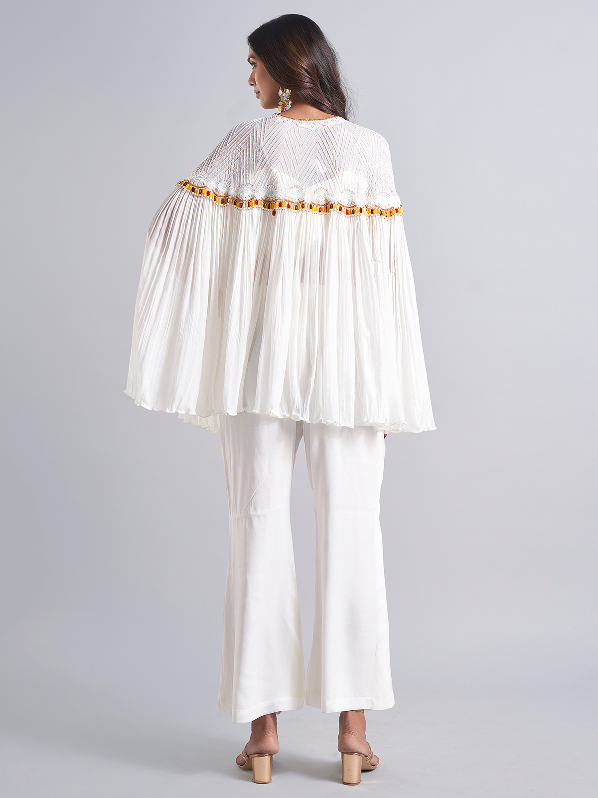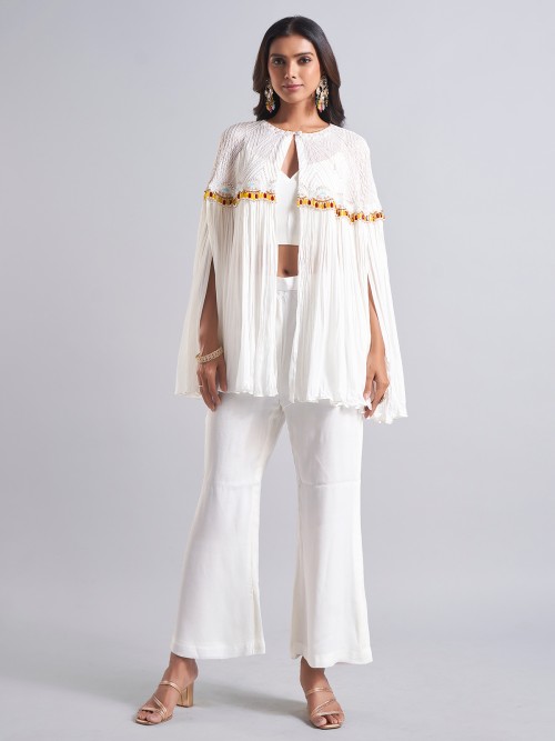A stunning white jacket style georgette palazzo salwar suit adorned with beautiful zardosi, cutdana, sequins, beads and pearl work.