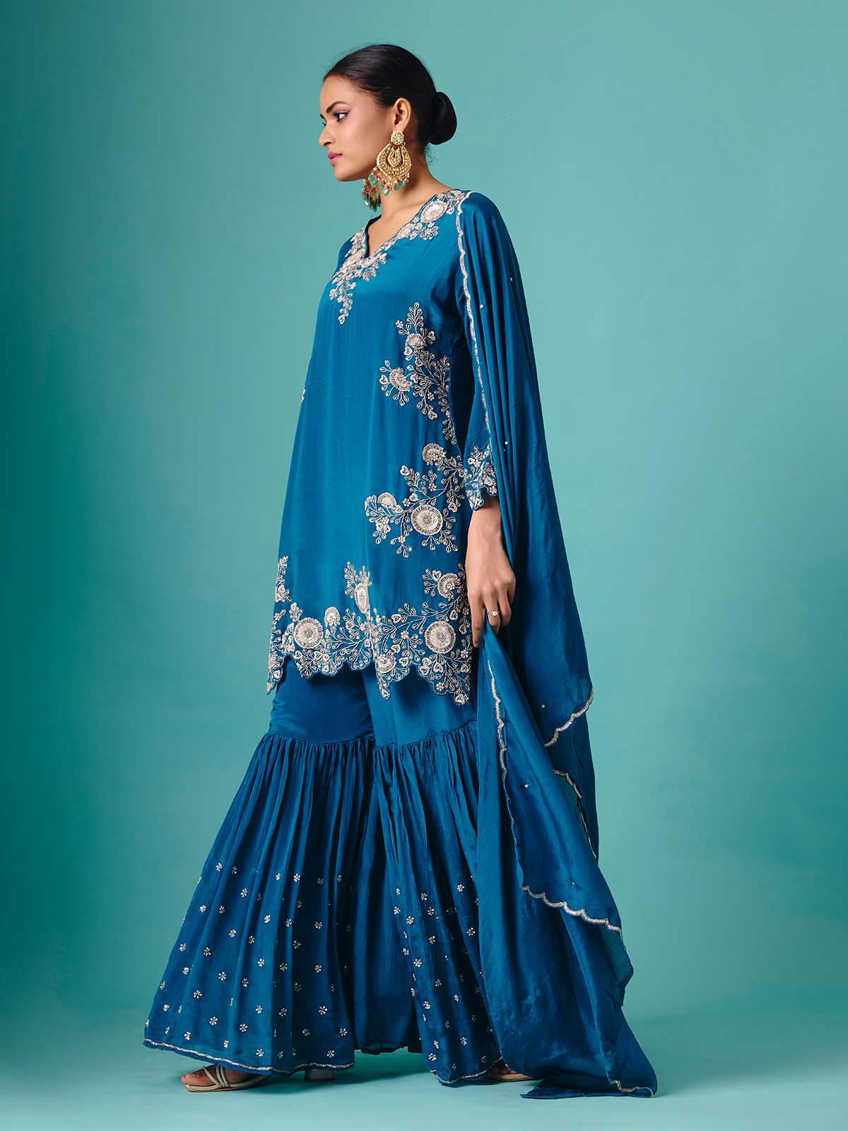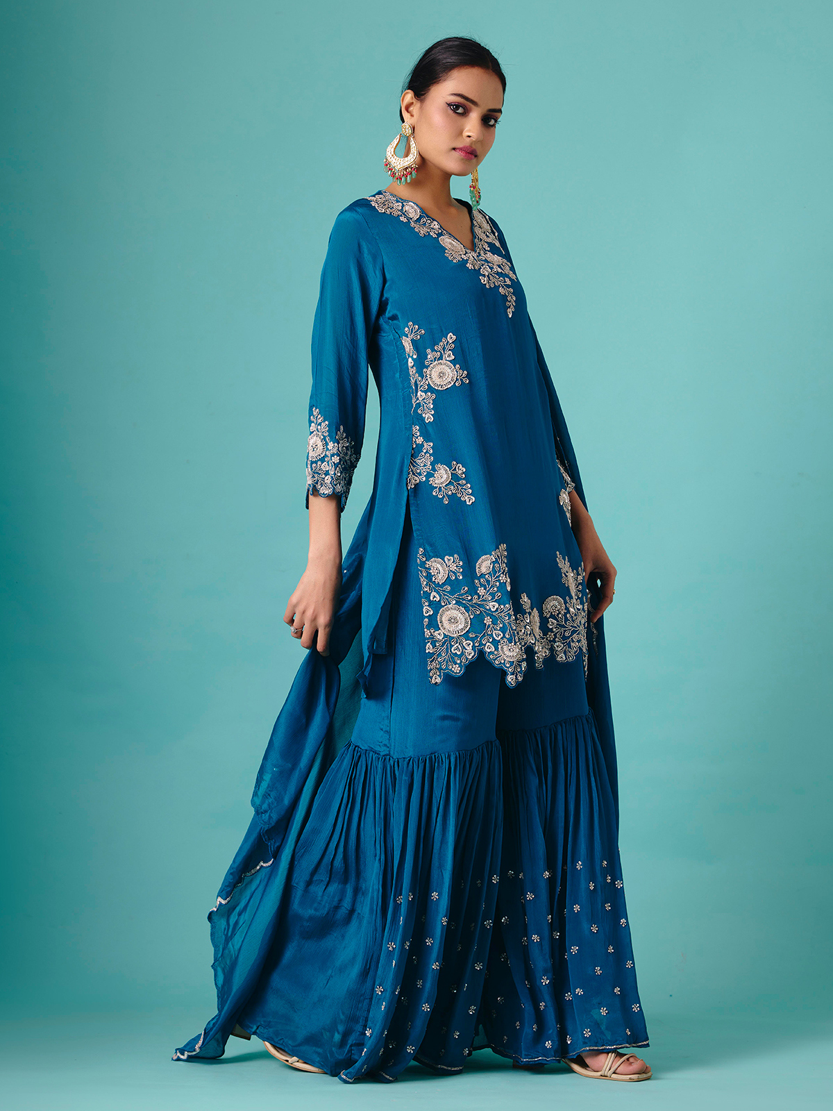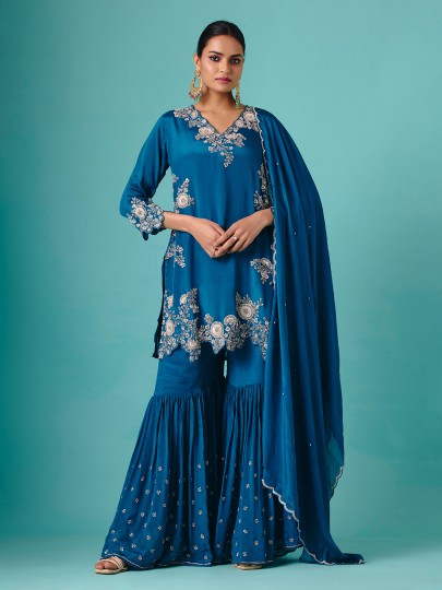 This teal blue georgette sharara suit features detailed cutdana, sequins, and bead embellishments. The V-neckline lends elegance, and the quarter sleeves create subtle poise. Flared sharara bottoms provide flowing charm, while a coordinating dupatta completes the set. Perfect for wedding, reception, and sangeet occasions, it radiates festive sparkle, refinement, and feminine allure.