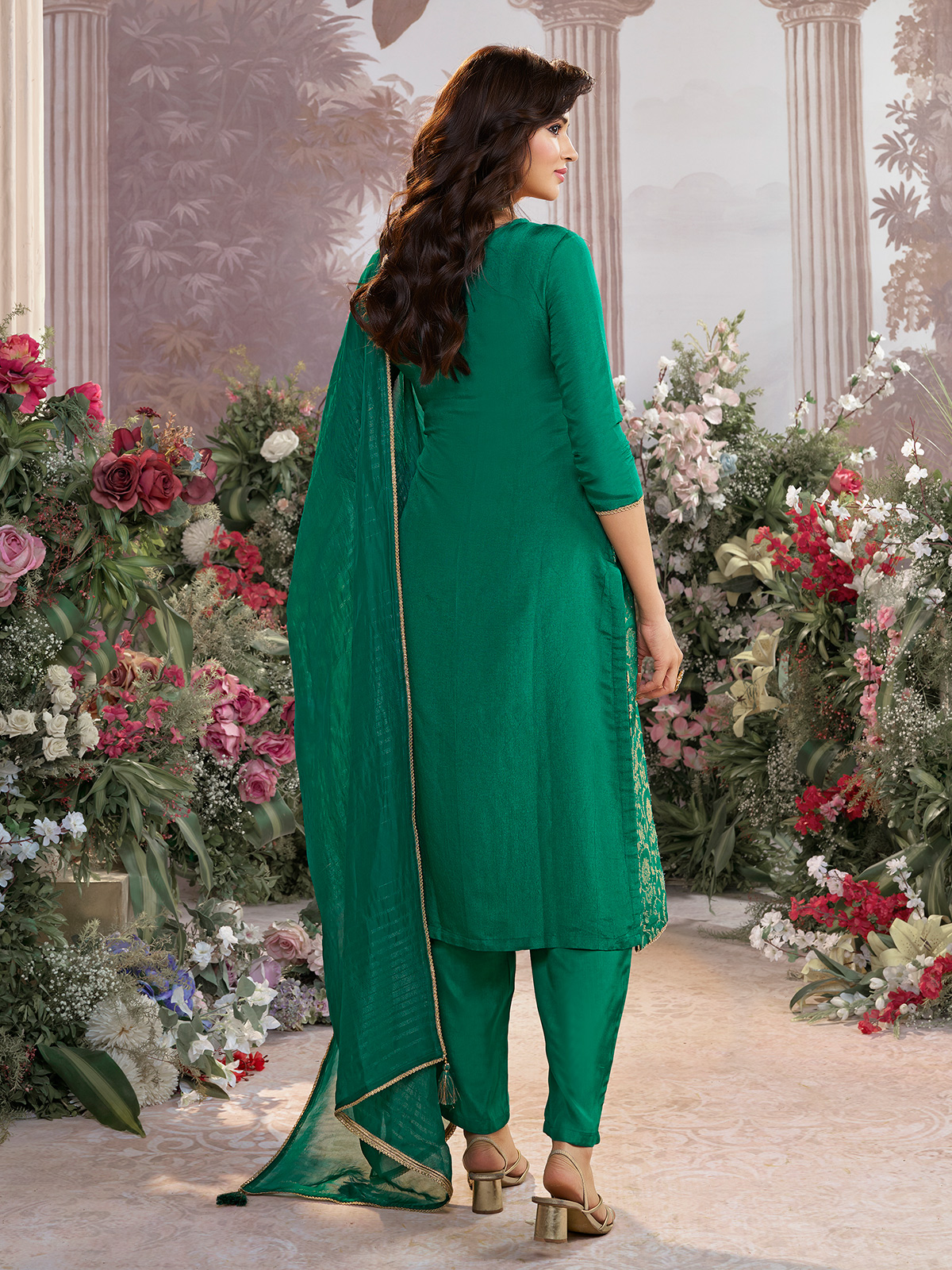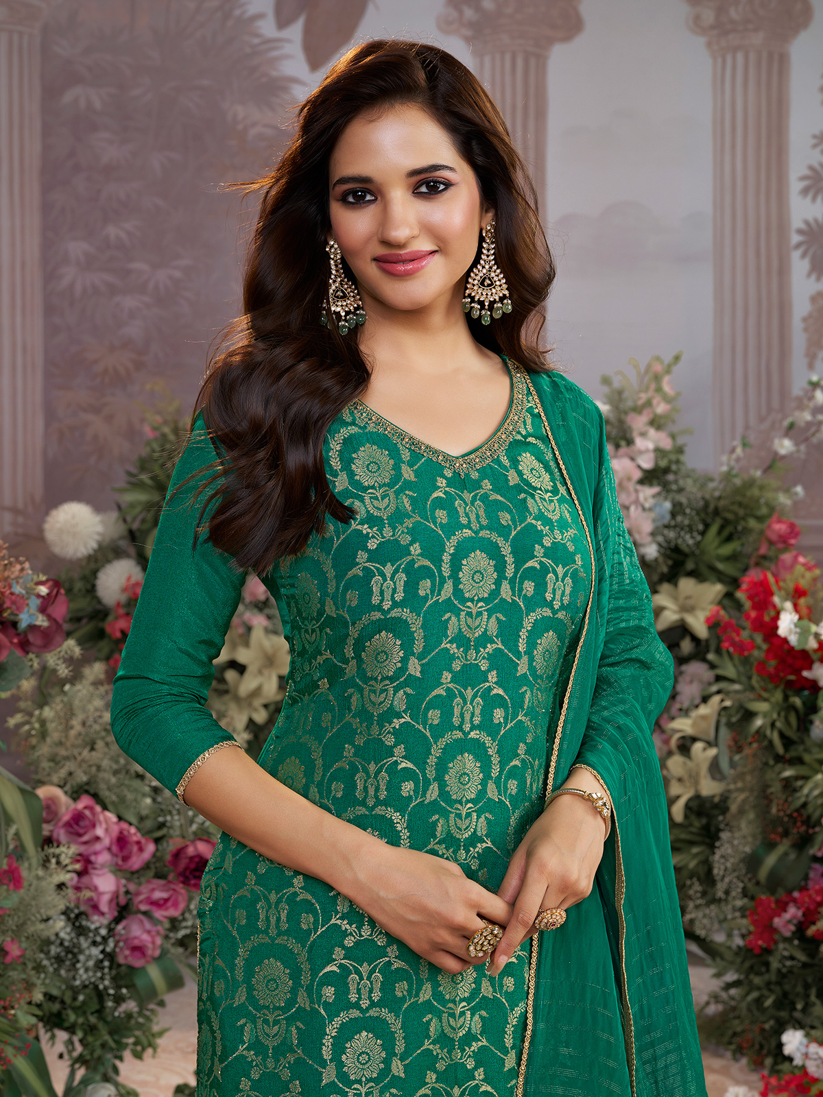Crafted in soft viscose fabric, this teal green Anarkali style features zari, resham, sequins, and cutdana work that enhances its festive glow. The flattering V-neckline and quarter sleeves add modern appeal. Paired with a matching dupatta and coordinated bottoms, it is ideal for mehendi ceremonies, weddings, and festive gatherings.