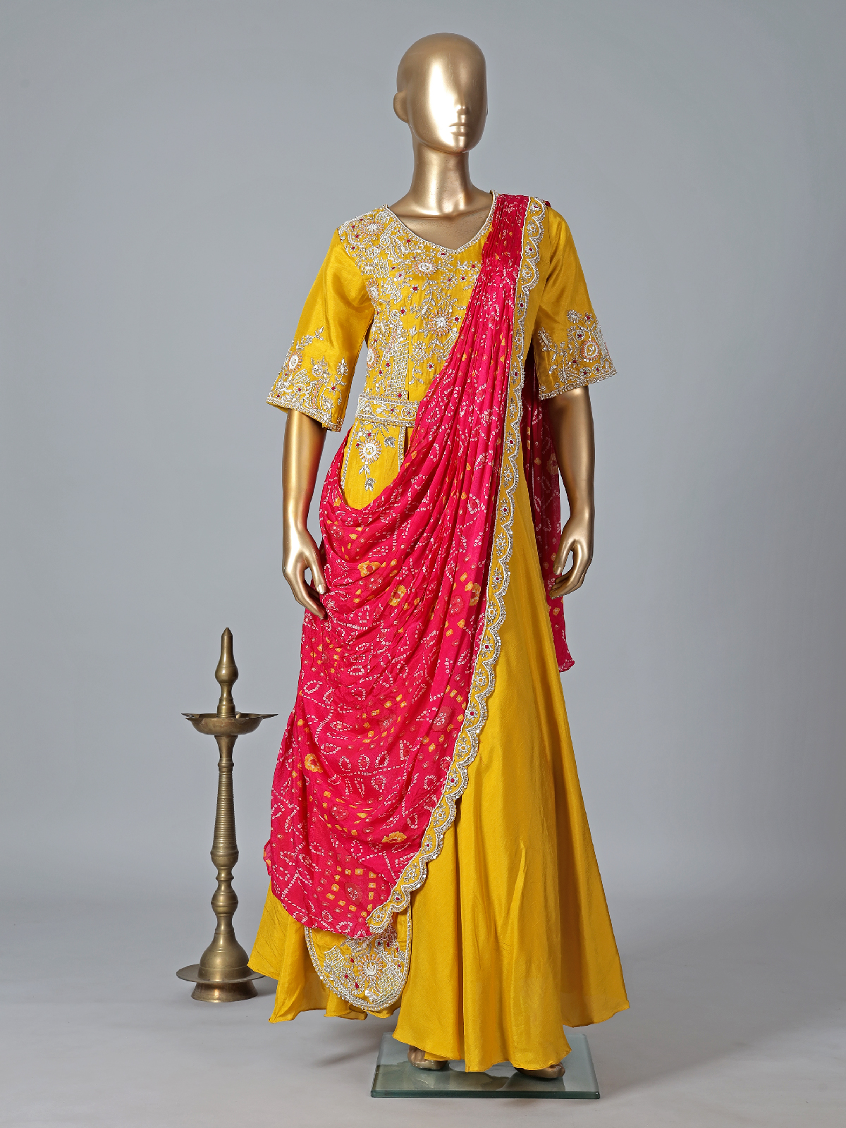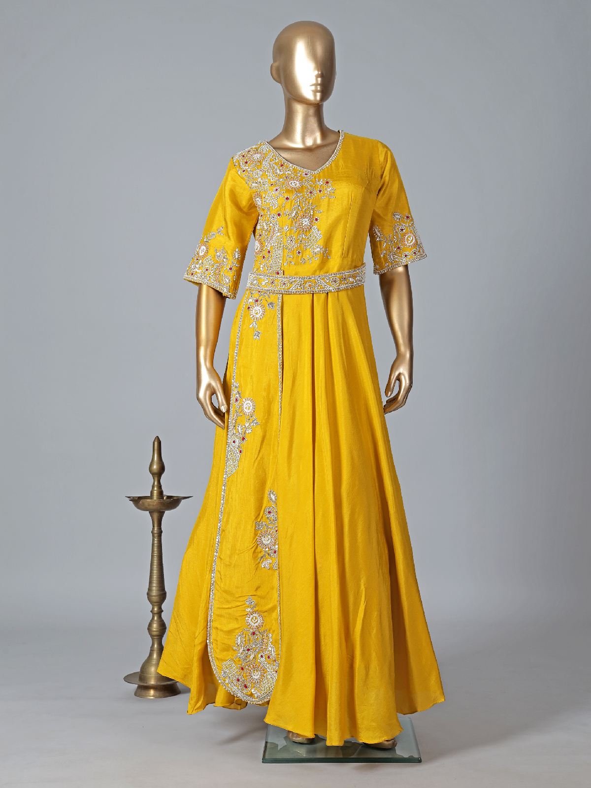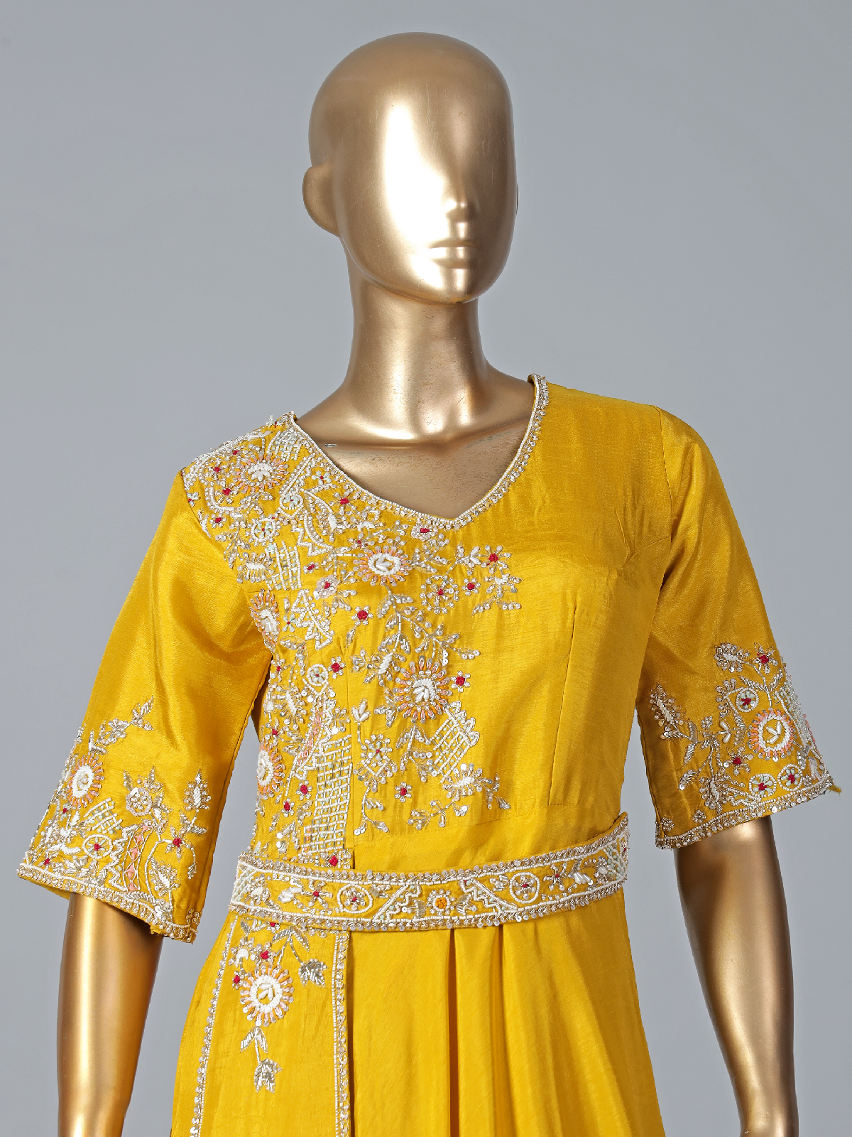 Curate a stunning look with this musterd yellow designer suit. Made with silk fabric, it enhanced with sequins, cutdana, beads, resham and zardosi work, it has a V neck and elbow sleeve.. Features an attatched contrest drape, this style is very hassle free yet gives a look of a saree.