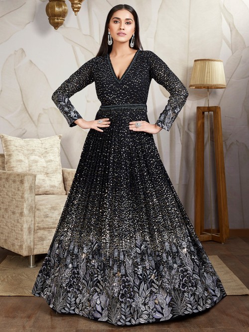 Timeless and elegant, this black silk anarkali suit features intricate embroidery, sequins, cutdana, and beads work. The V-neck and full sleeves enhance its graceful charm.