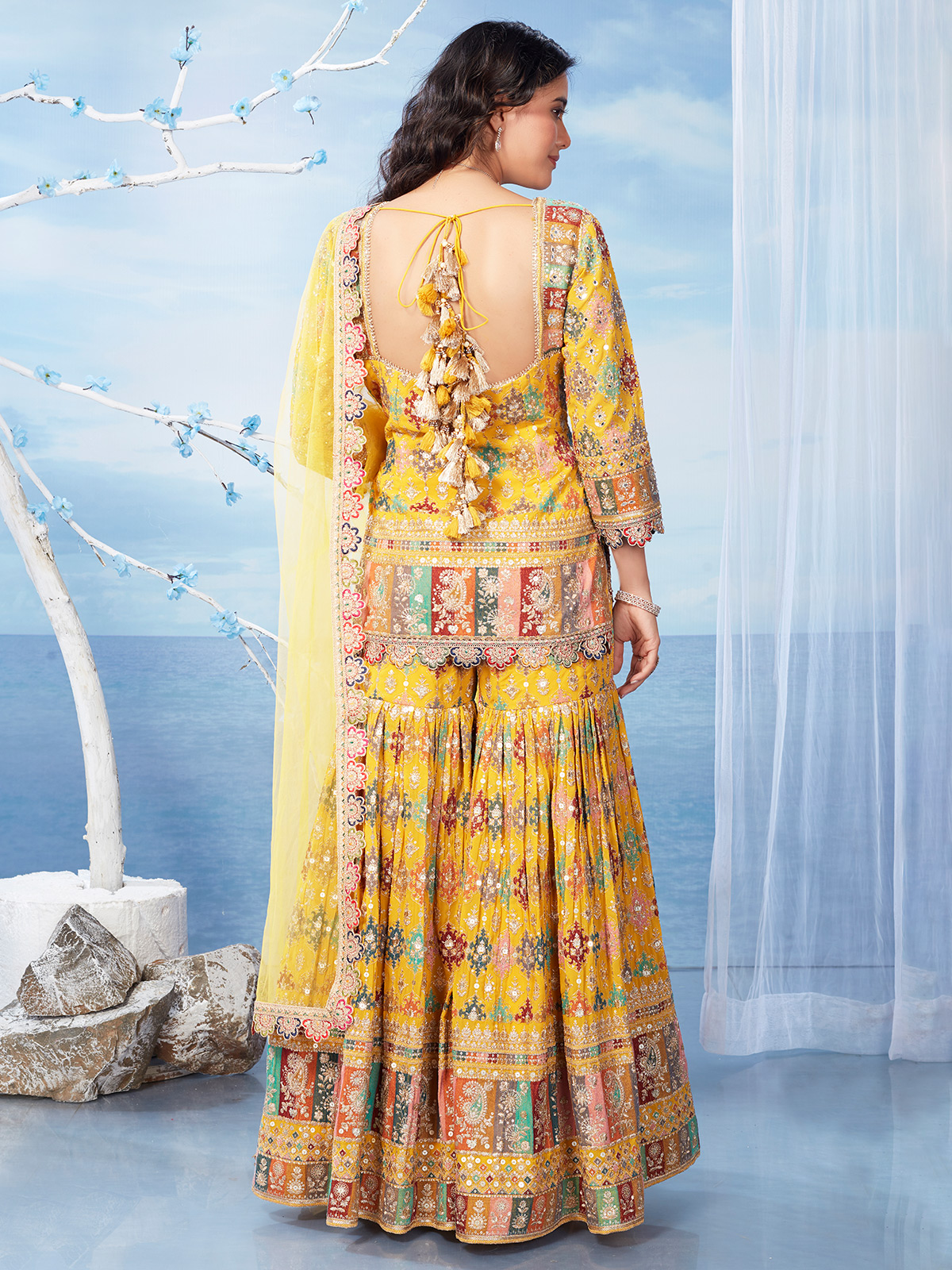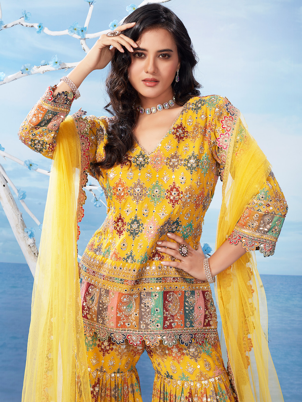 Combining classic beauty and vintage charm, this mustard yellow georgette sharara suit is decorated with embroidery, stone, sequins, mirror, and resham work. Featuring a V-neck and quarter sleeves, it comes with a dupatta for added elegance.