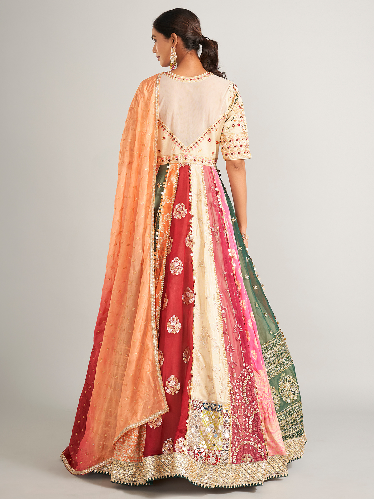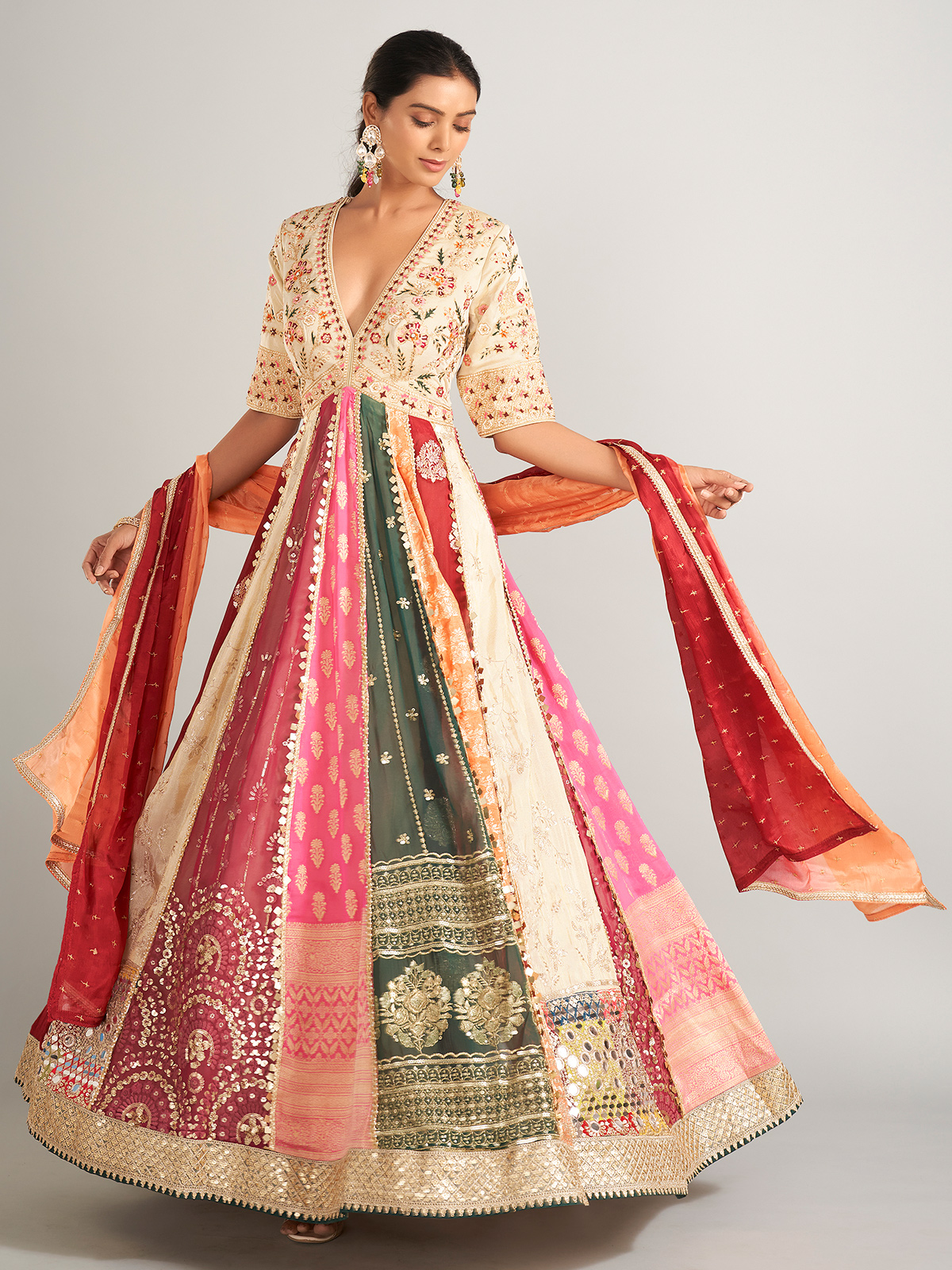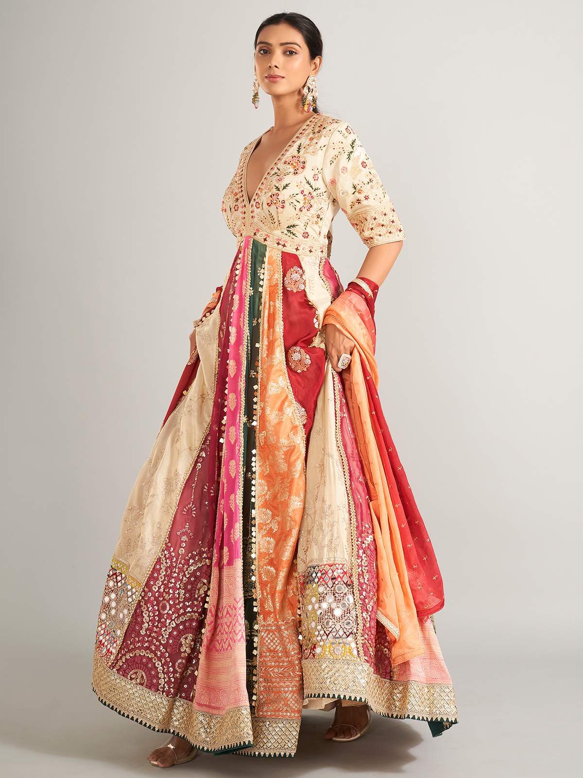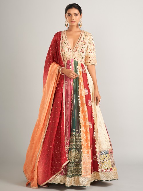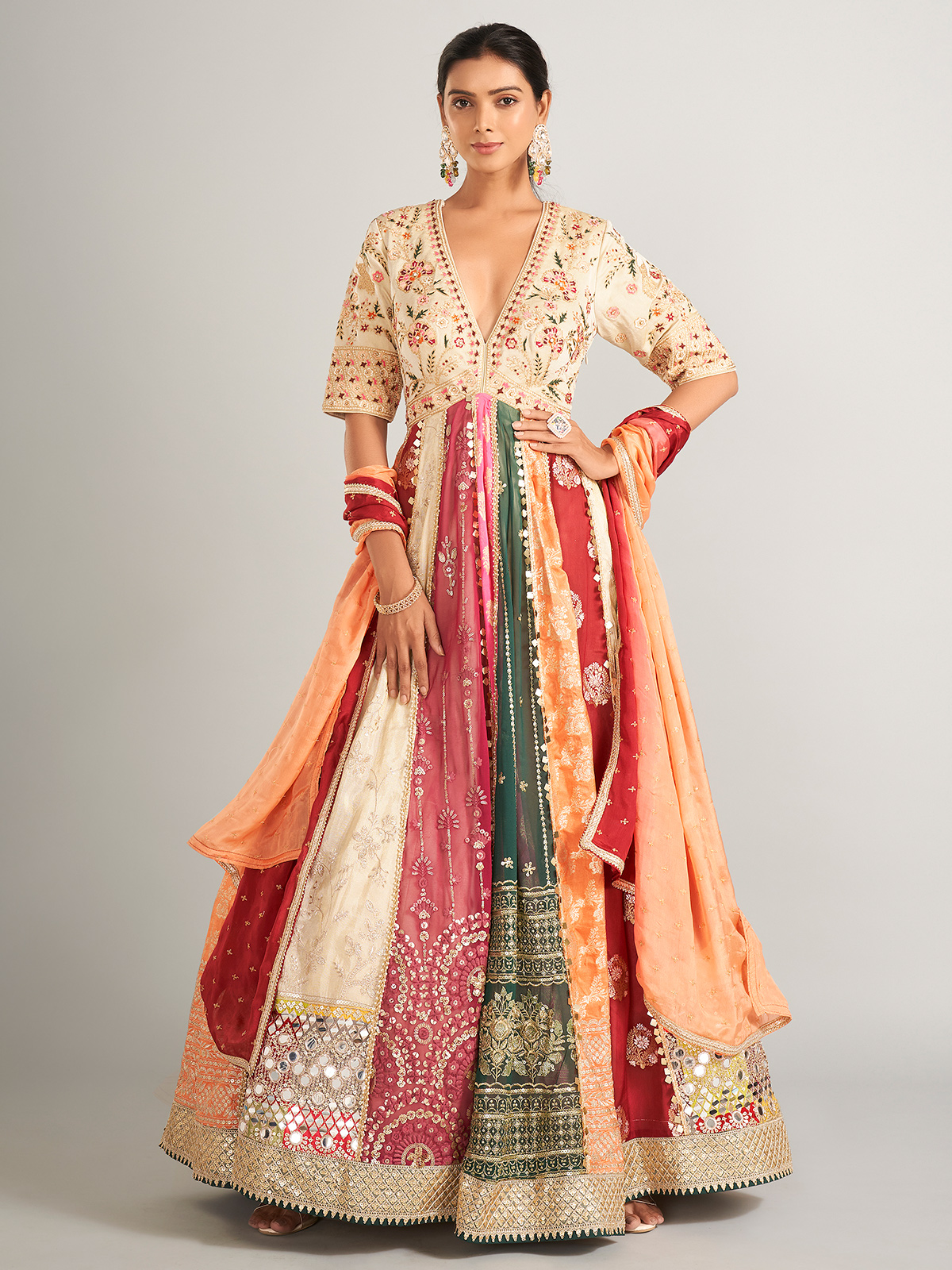 Your festive collection must include a heavy flared multicolored silk anarkali salwar suit for a vibrant traditional style. Featuring a deep neckline and half sleeves, it is embellished with exquisite zari, pearls, beads, sequins, and resham embroidery. Has a silk dupatta included.